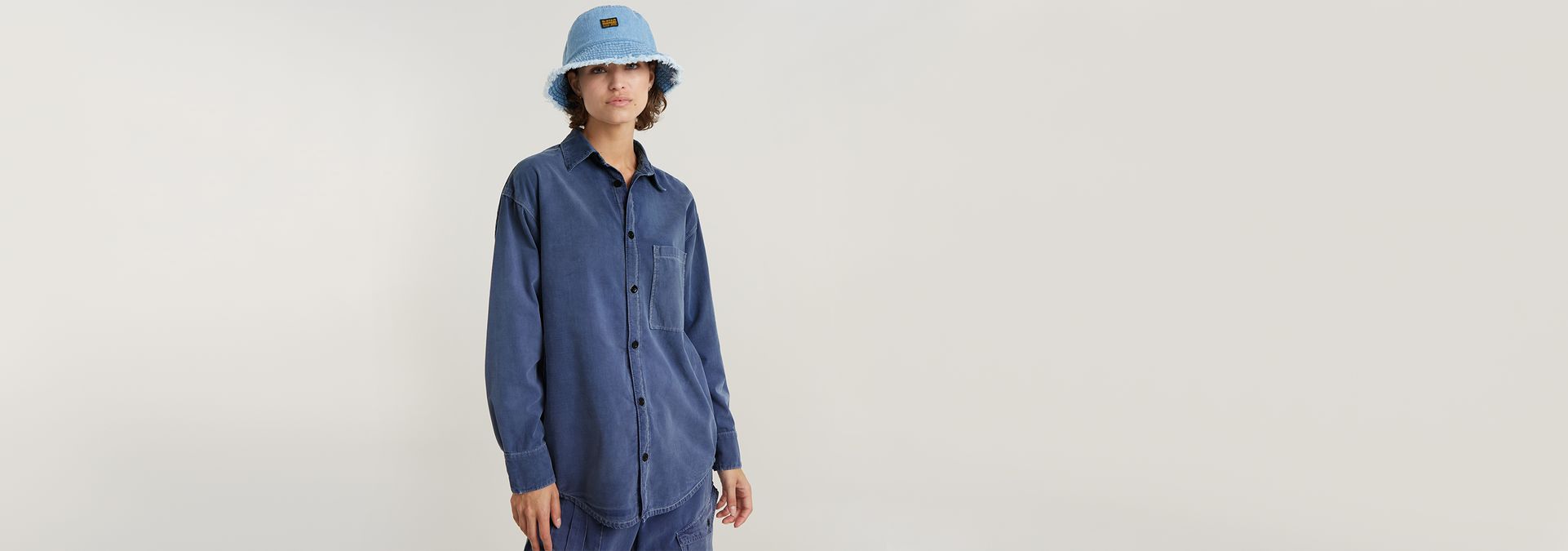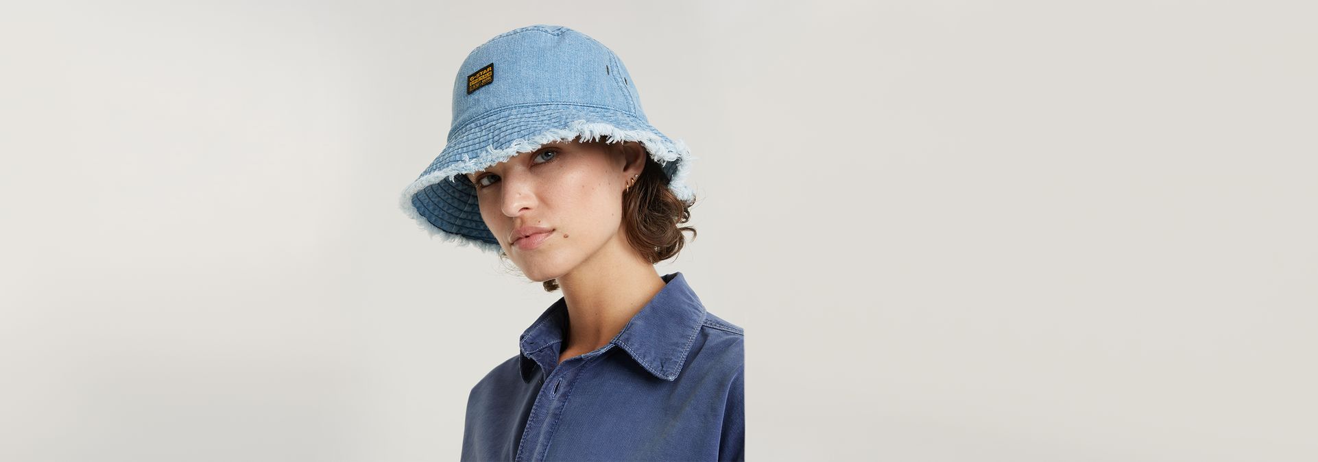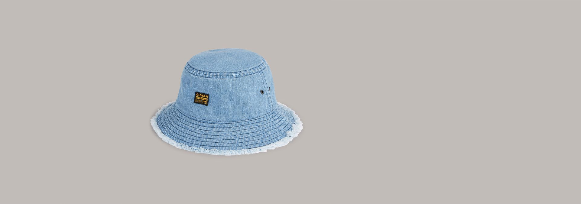 This version of the G-Star Originals bucket hat offers a wide brim with a rough edge. The woven G-Star Originals label signs this denim bucket hat off.