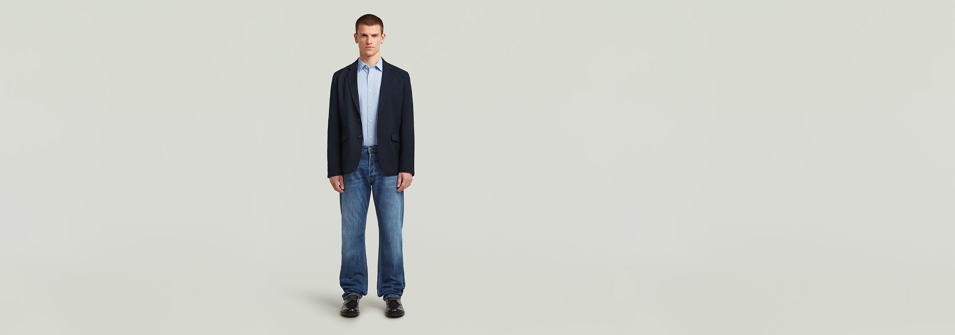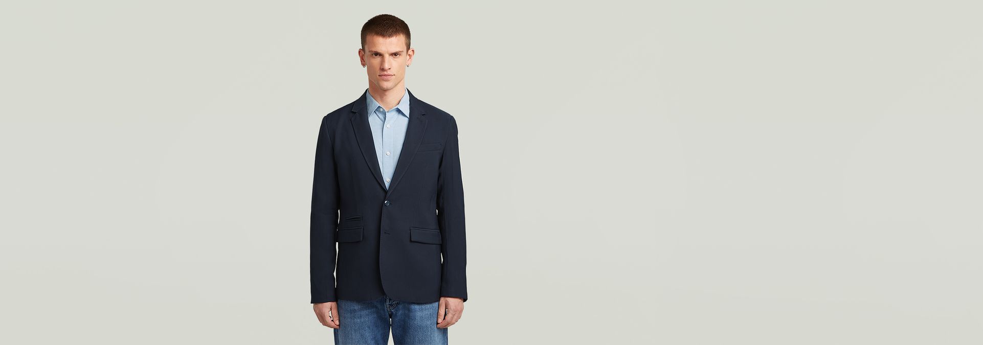 Blazer Stadial is designed in a straight fit and offers a lapel collar and a 2-button closure. A welt pocket at the chest is combined with flap pockets at the waist. A small ticket pocket is set just above. Short slits at the back add detail.