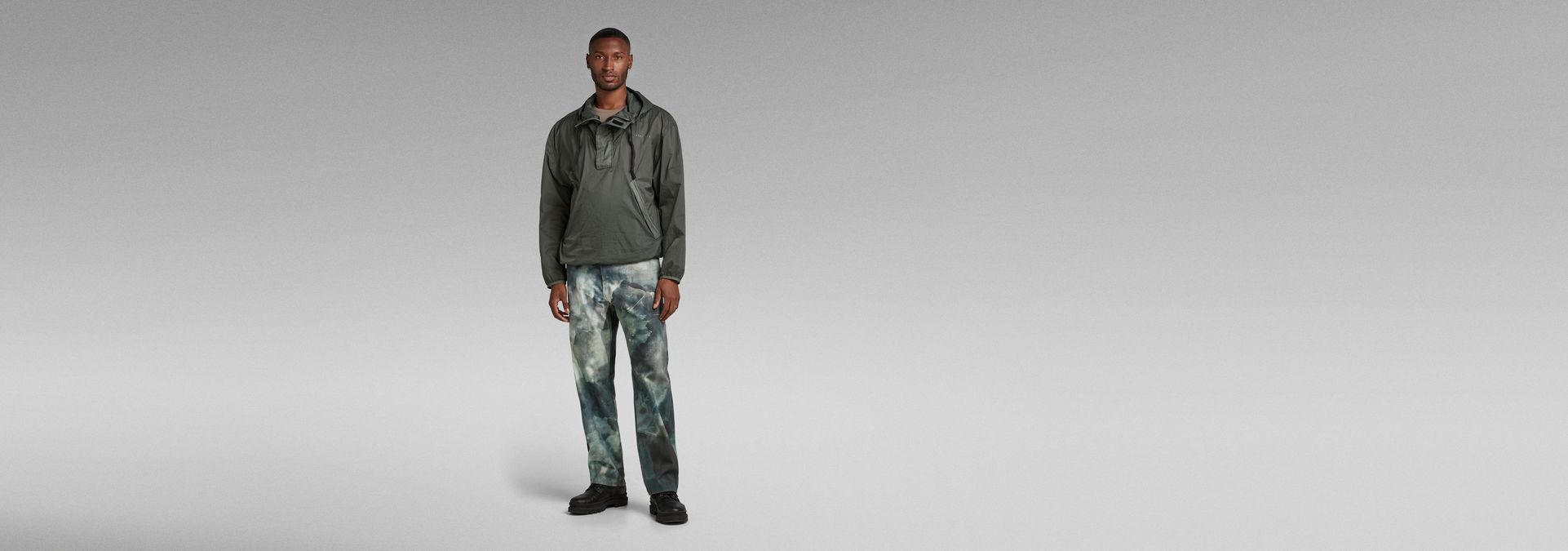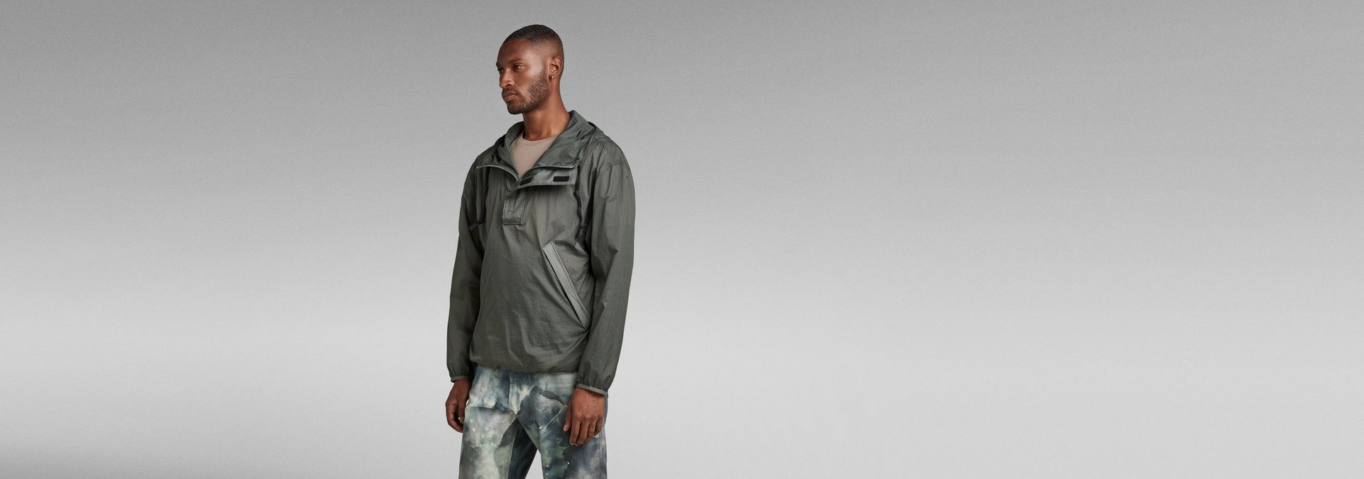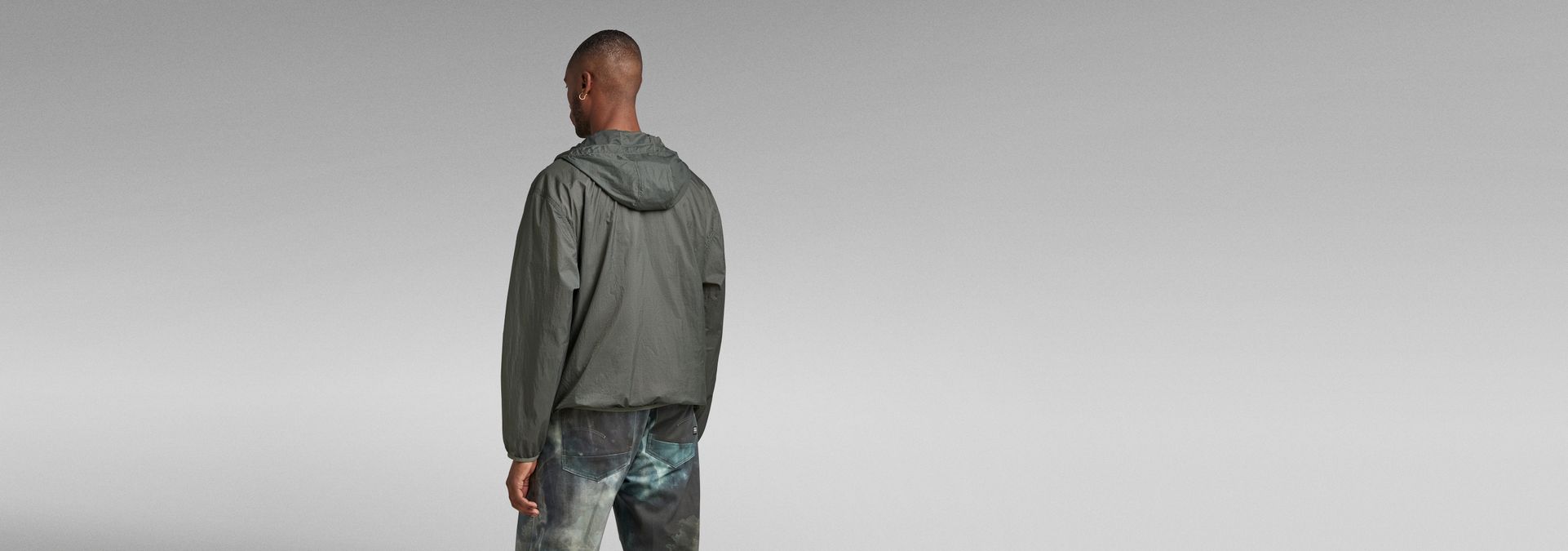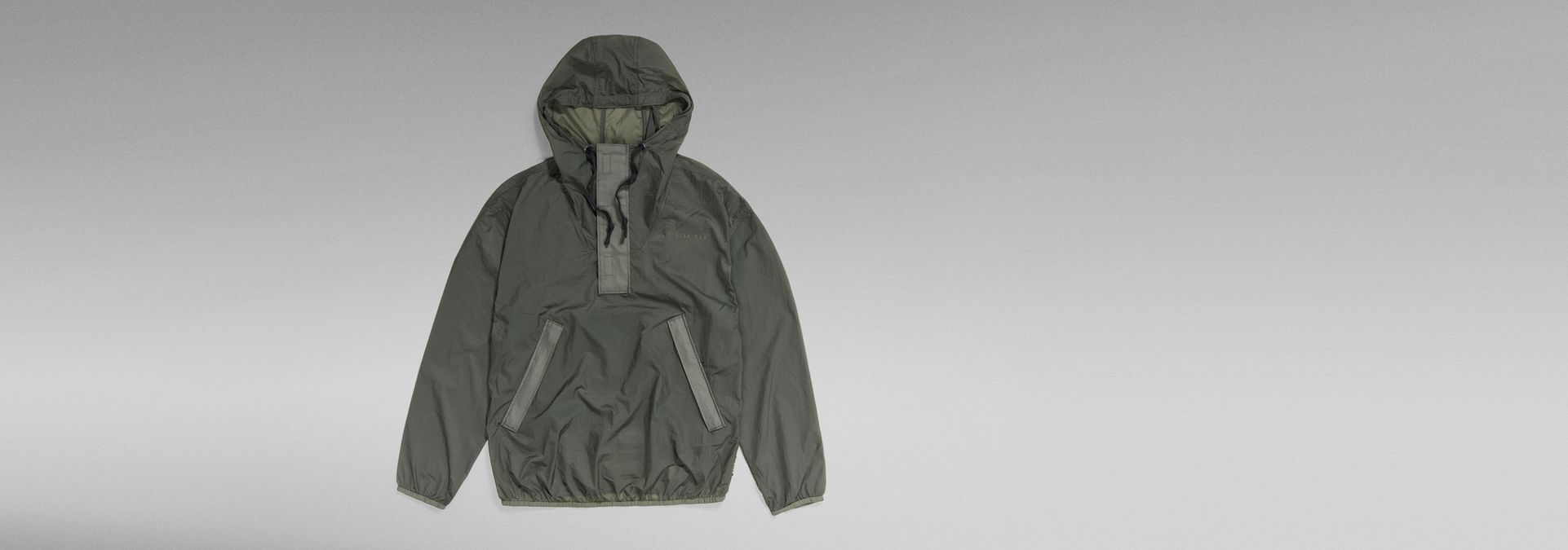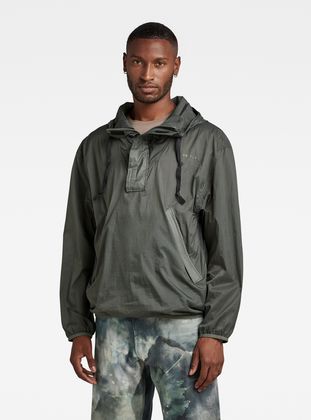 This lightweight Windbreaker shell jacket offers a hood with a raised front and drawstrings. A short zipper is covered by a panel and fixated by additional Velcro patches. The sleeves and bottom edge are finished with an elasticated binding. This windbreaker jacket has a kangaroo pocket with zippers that are concealed by a broad welt.