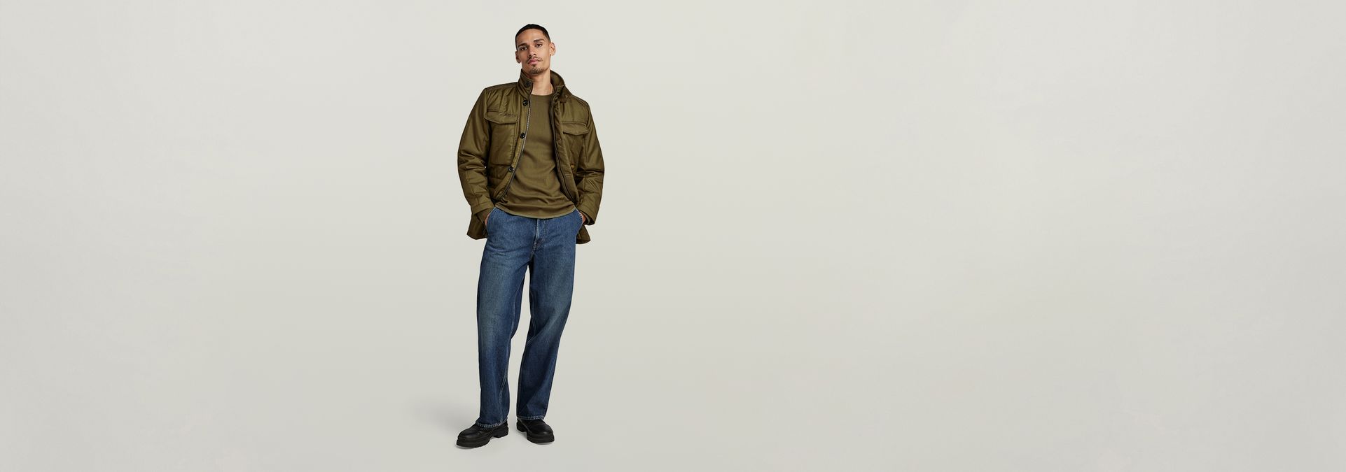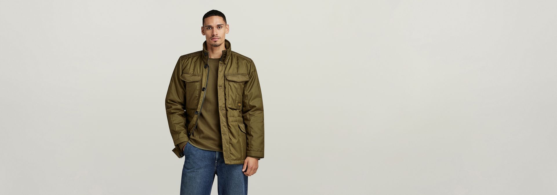 Jacket Field is designed in a straight fit and offers a zipper closure that is covered by a wind guard with buttons. Deep flap pockets are placed at the chest and waist and have a hidden snap button closure. The design of this field jacket shows a raised collar with a tab. The inside of the collar is created out of a ribbed knit. Inside, a woven tape offers adjustability to create a tighter waist.