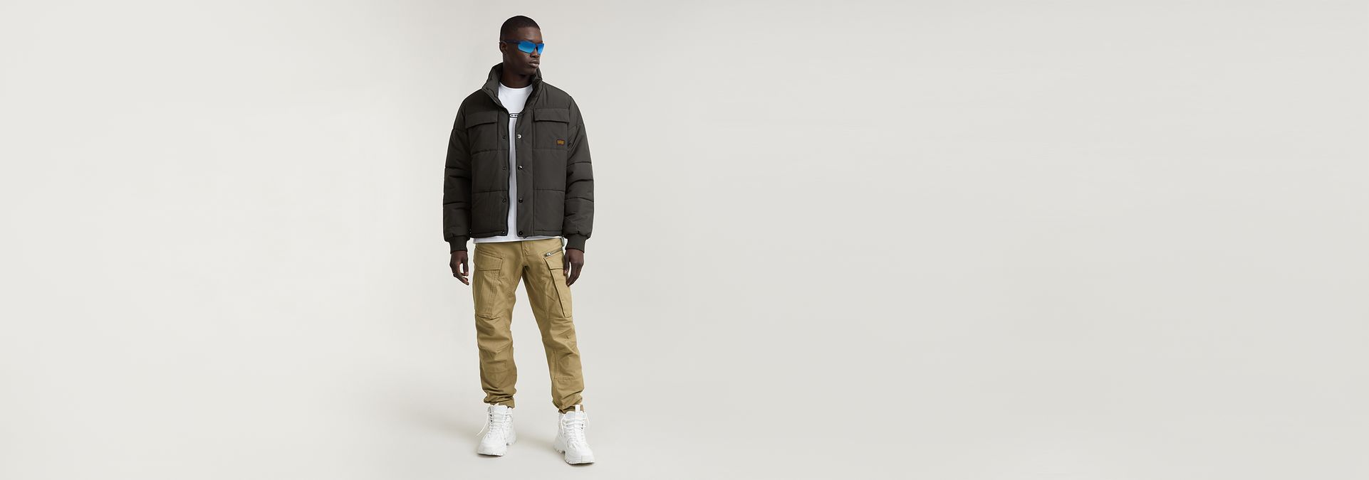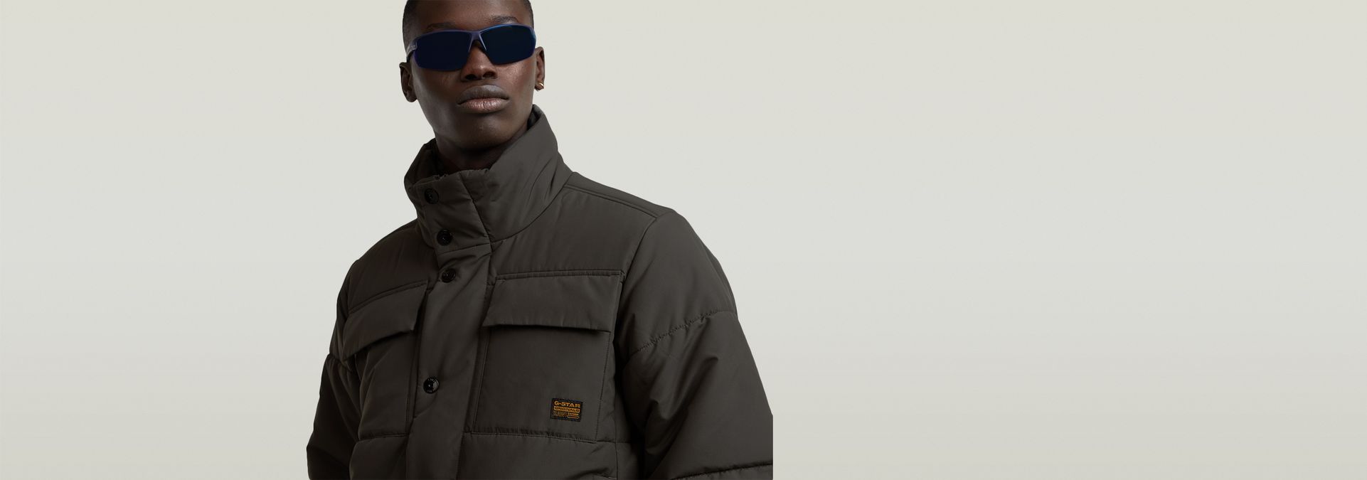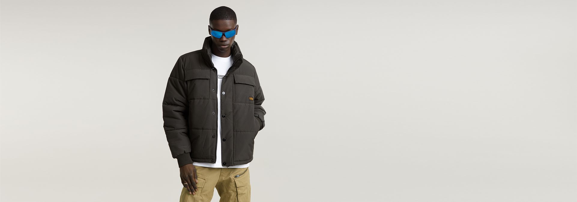 Padded jacket 4 Pocket is cut from a water repellent fabric and stitched through horizontally. The waist can be tightened by use of the cord inside. The zipper is covered by a wind blocker with snap buttons. Pockets with hidden snaps are created at the chest and waist. An inner pocket completes it.