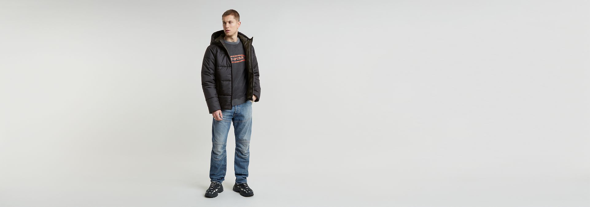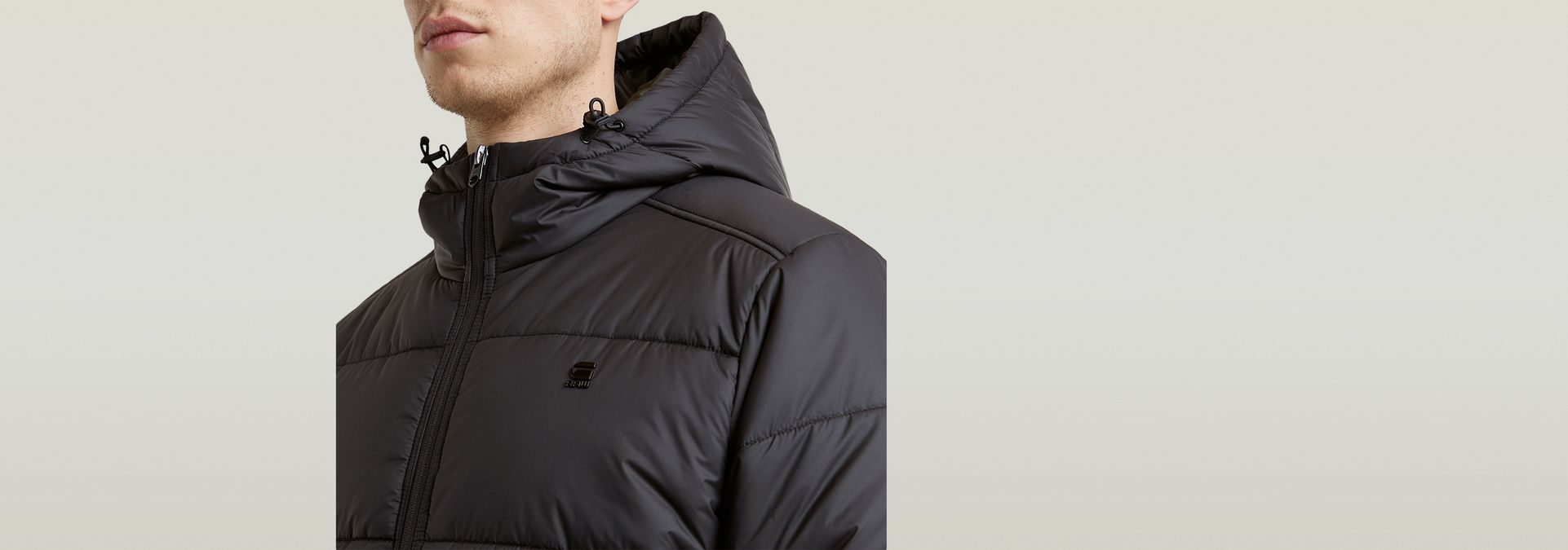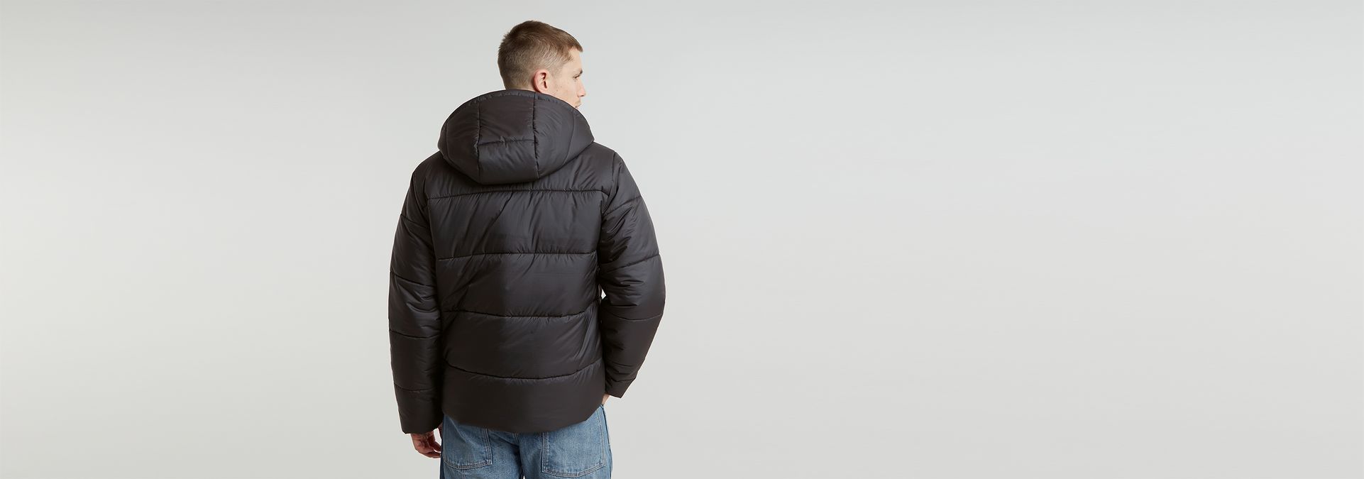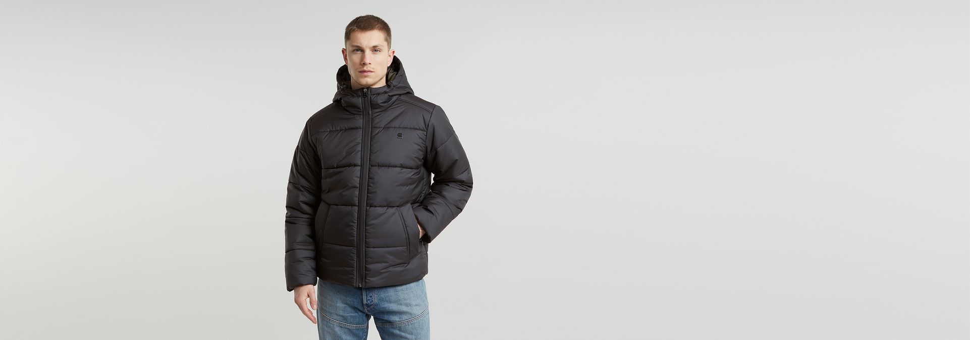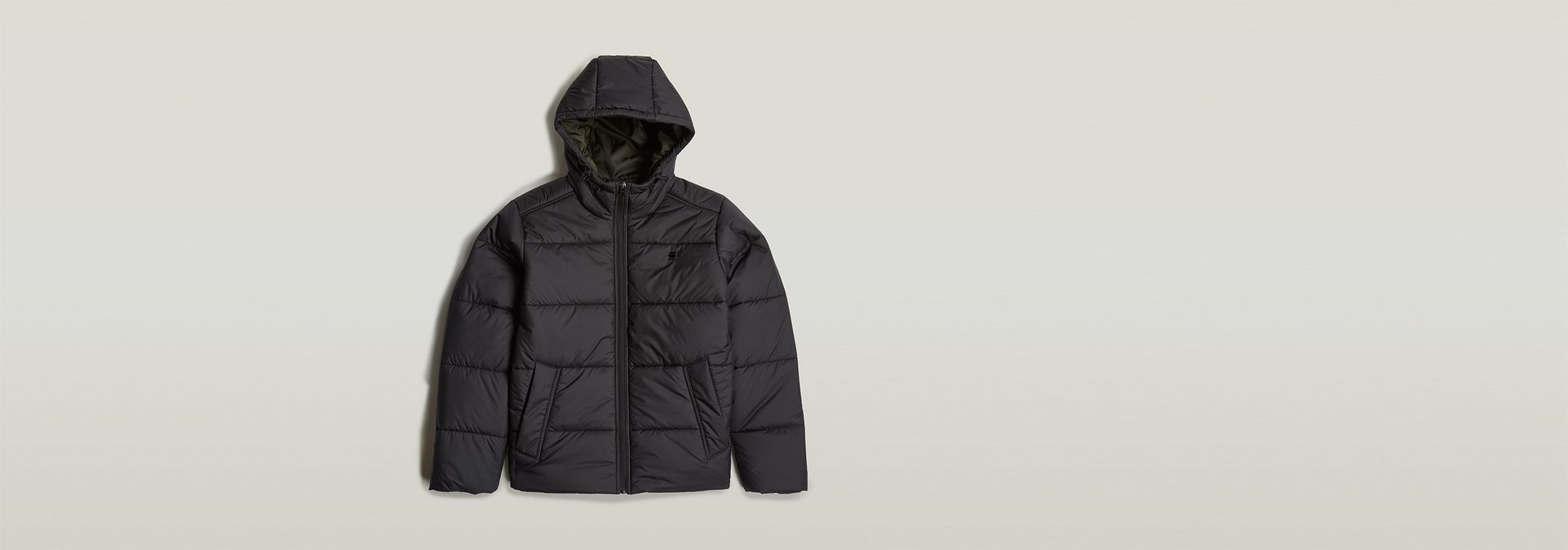 The Hooded Puffer is a padded jacket with a zipper closure. The comfortable hood offers a raised collar and pull cords to finetune the fit. Welt pockets with a concealed snap button are added to the waist. A hanger loop is completes it.