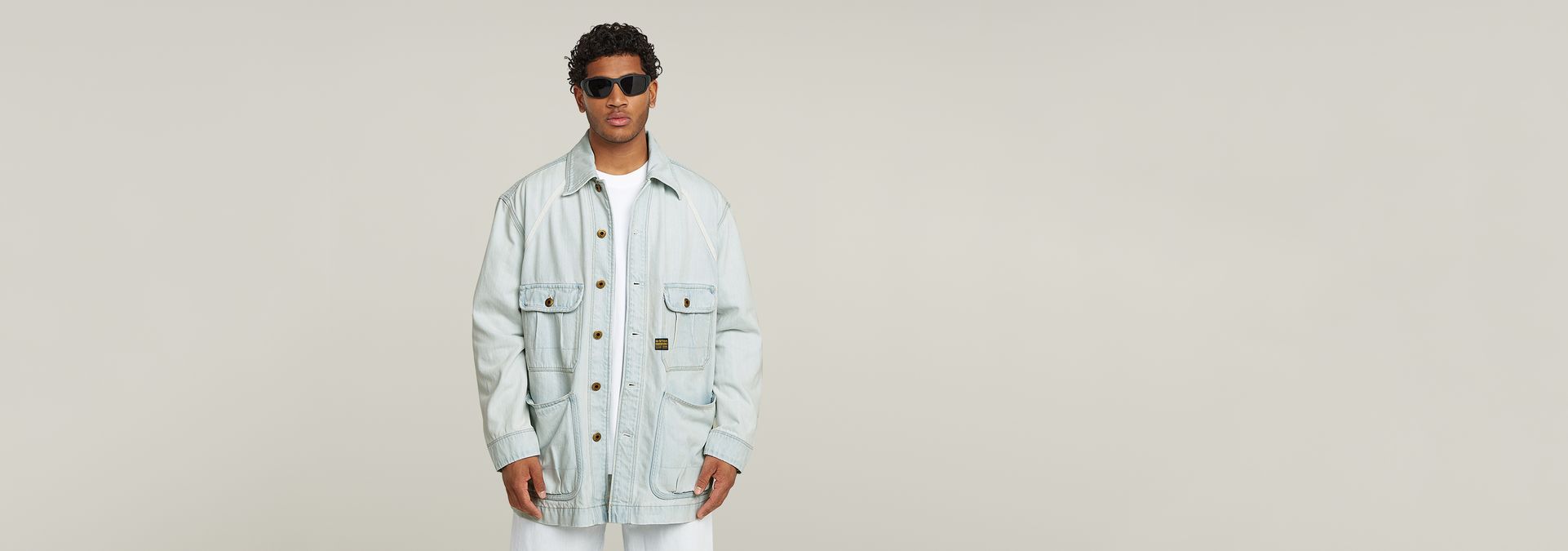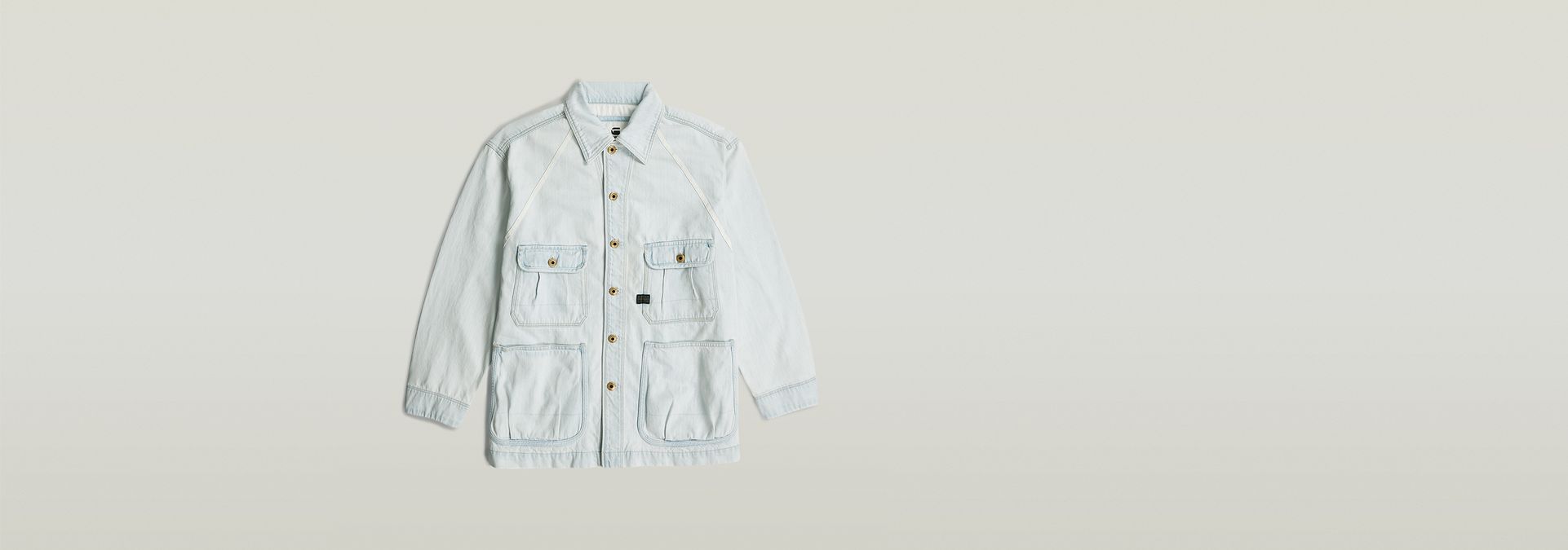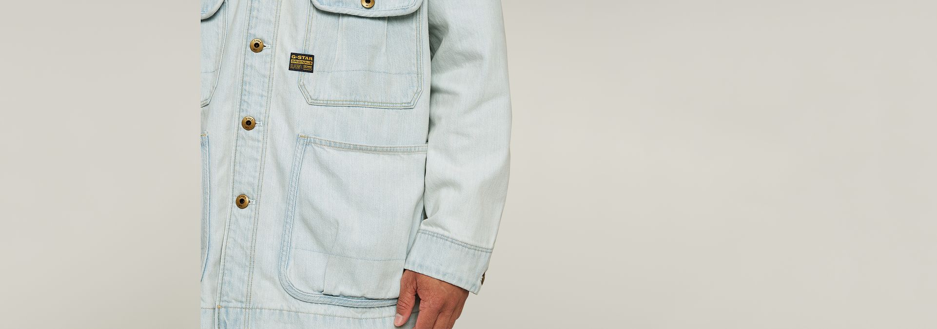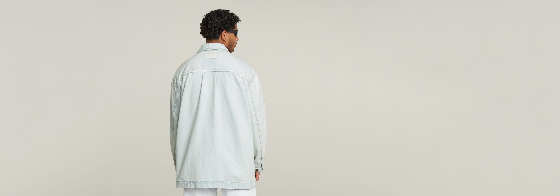 Oversized jacket Chore is a denim jacket with a shank button closure. Offering pockets at the chest and waist, a volume pleat at the back and woven tape details.