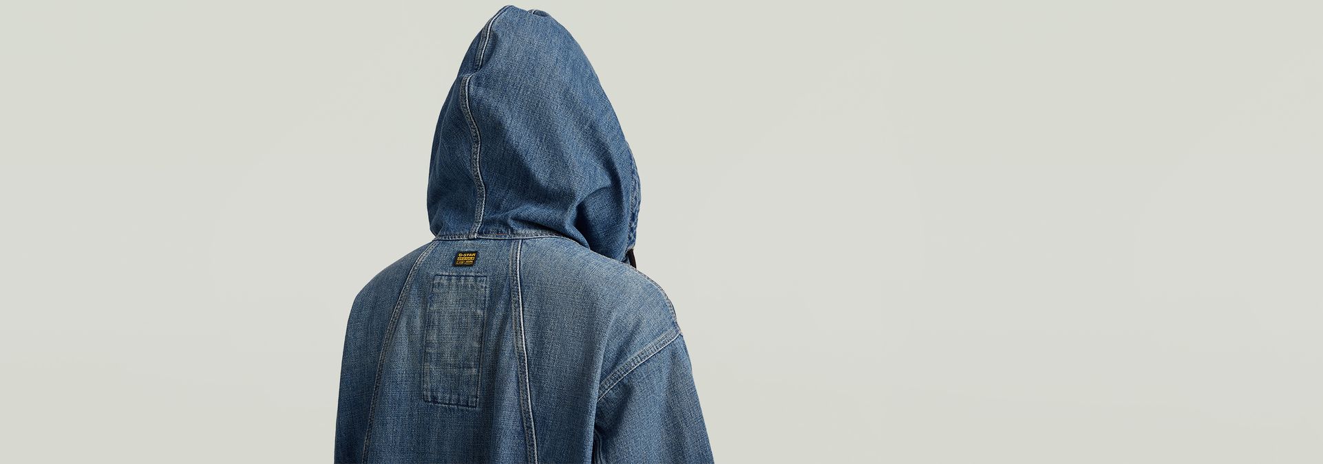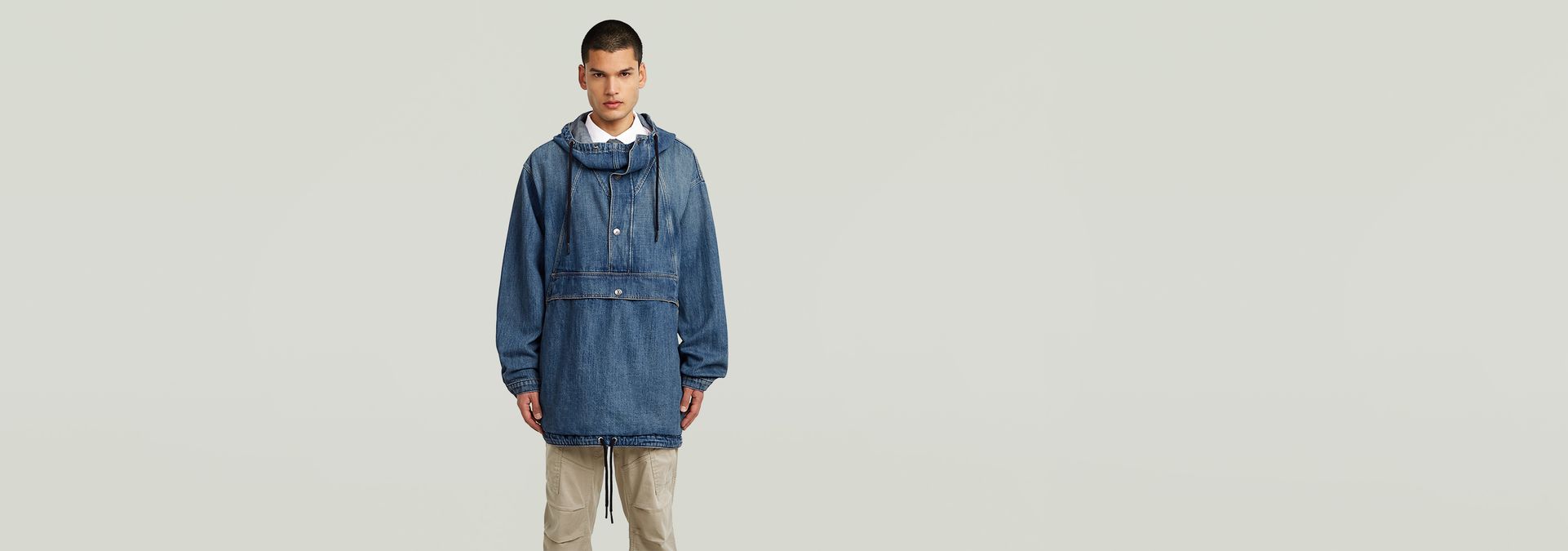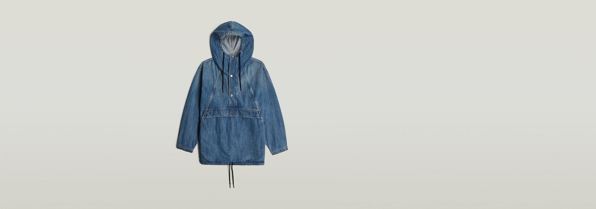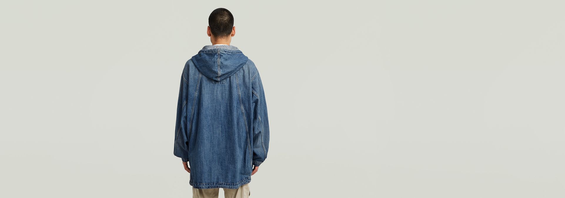 Denim anorak Parachute is cut in an oversized fit. Offering a hood with a raised front and drawcords. This jacket features a front pocket with a snap button closure. Side seam pockets are set underneath. The sleeves can be reduced in width, through the snap buttons applied. Use the drawcord in the hem to add volume.