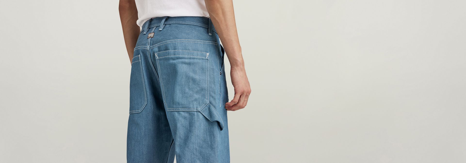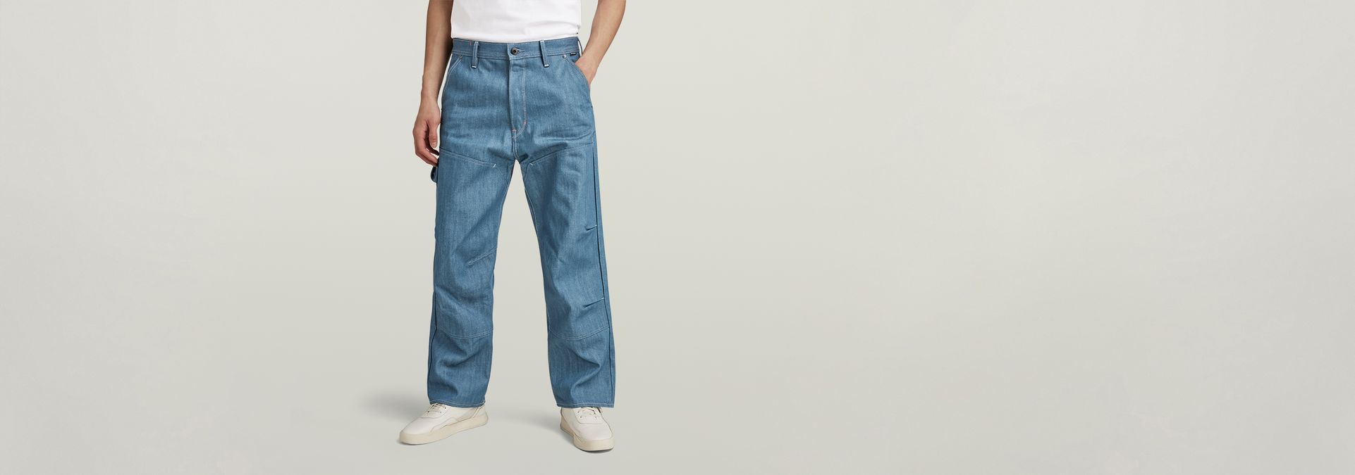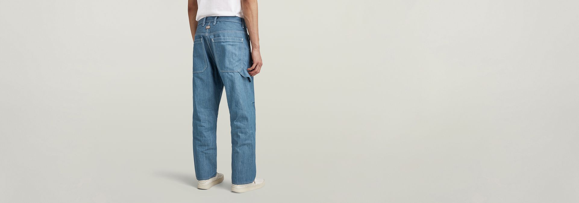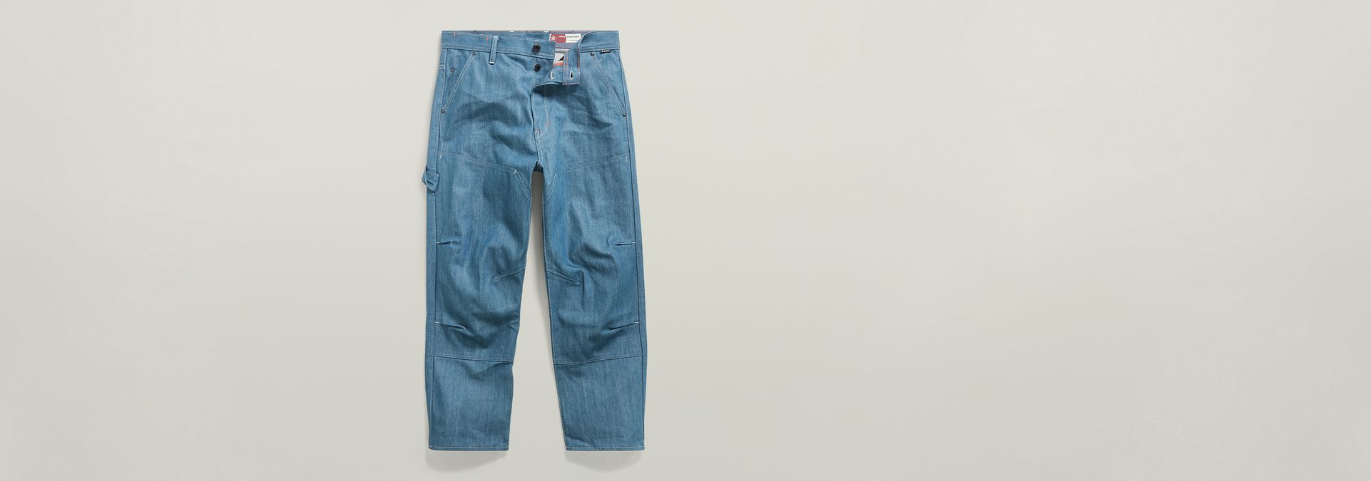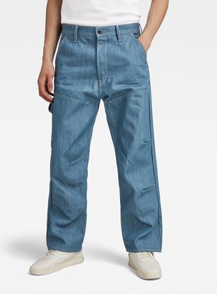 The design of jeans Carpenter Loose 3D shows a loose fit with a relaxed look and offers rivet reinforced inset pockets. The coin pocket is repositioned towards the inside, leaving only the rivets to show. Deep back pockets are placed slightly lower and offer a tool loop at one side. The panels at the front legs show darts as well as pleats that are caught in the seam to add more shape. These jeans have a button fly.