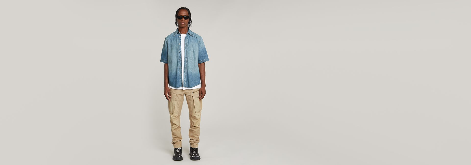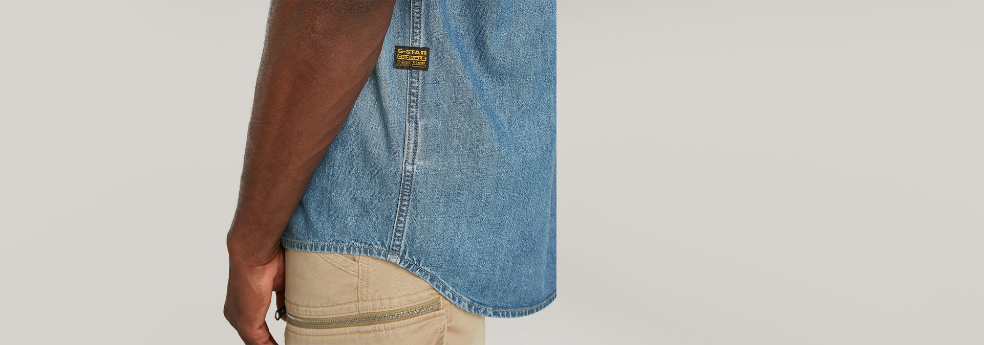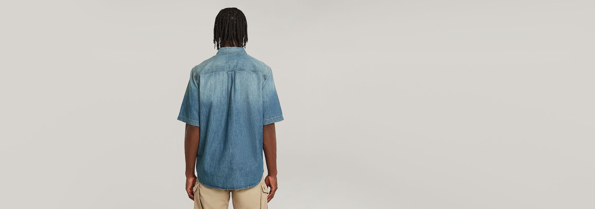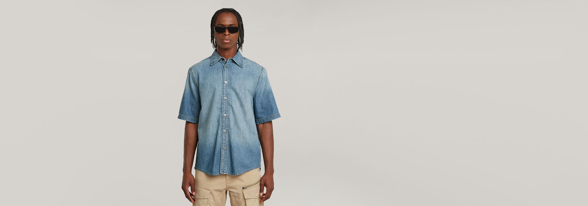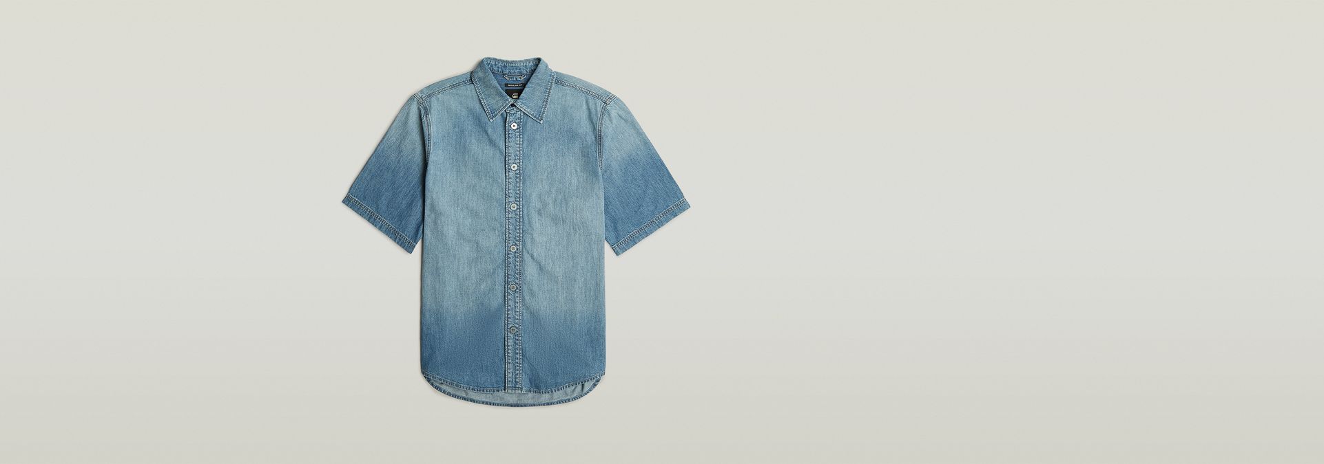 The Regular Denim Shirt features a classic button closure and short sleeves.