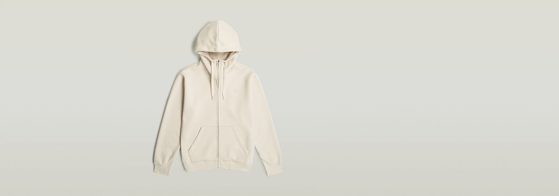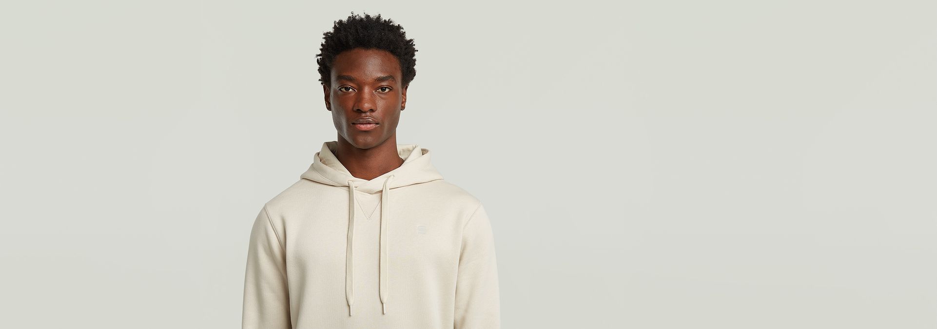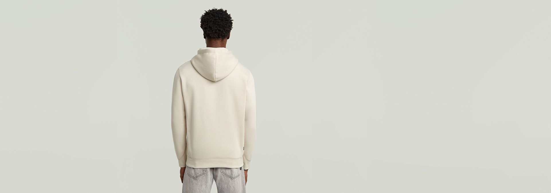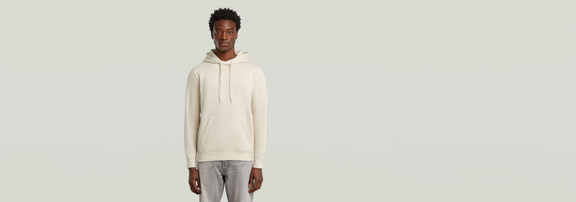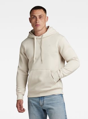The Premium Core hooded sweater features a kangaroo pocket and a hood with a drawstring. The front shows a cross over construction and a ribbed inset piece. Long sleeves have a curved finish, showing a ribbed cuff underneath. The chest signs this hoody with a subtle G-Star RAW logo.