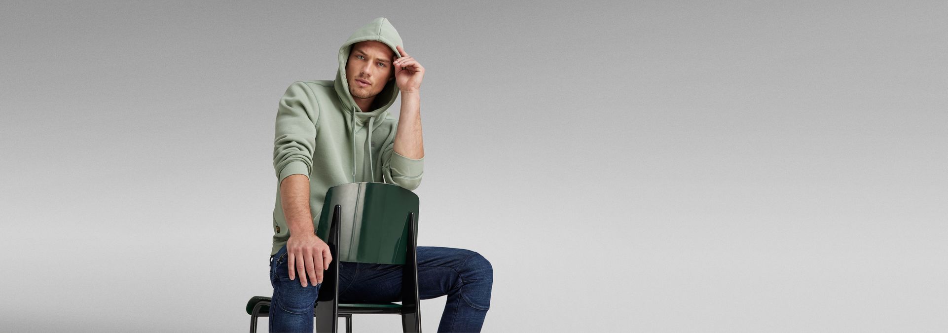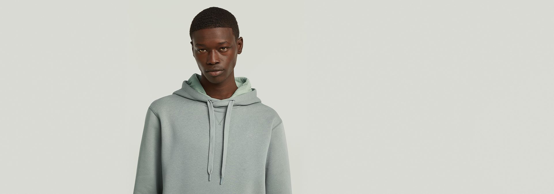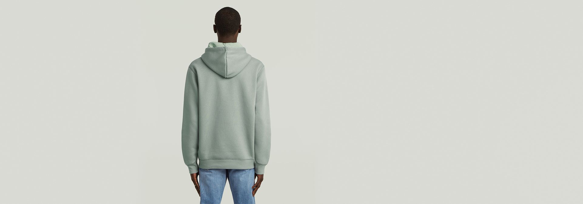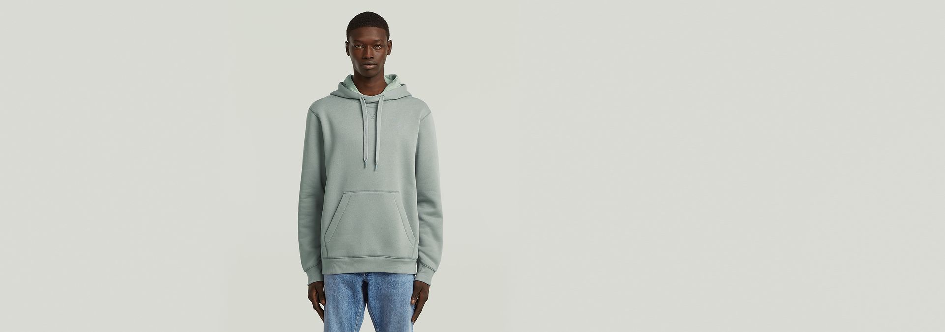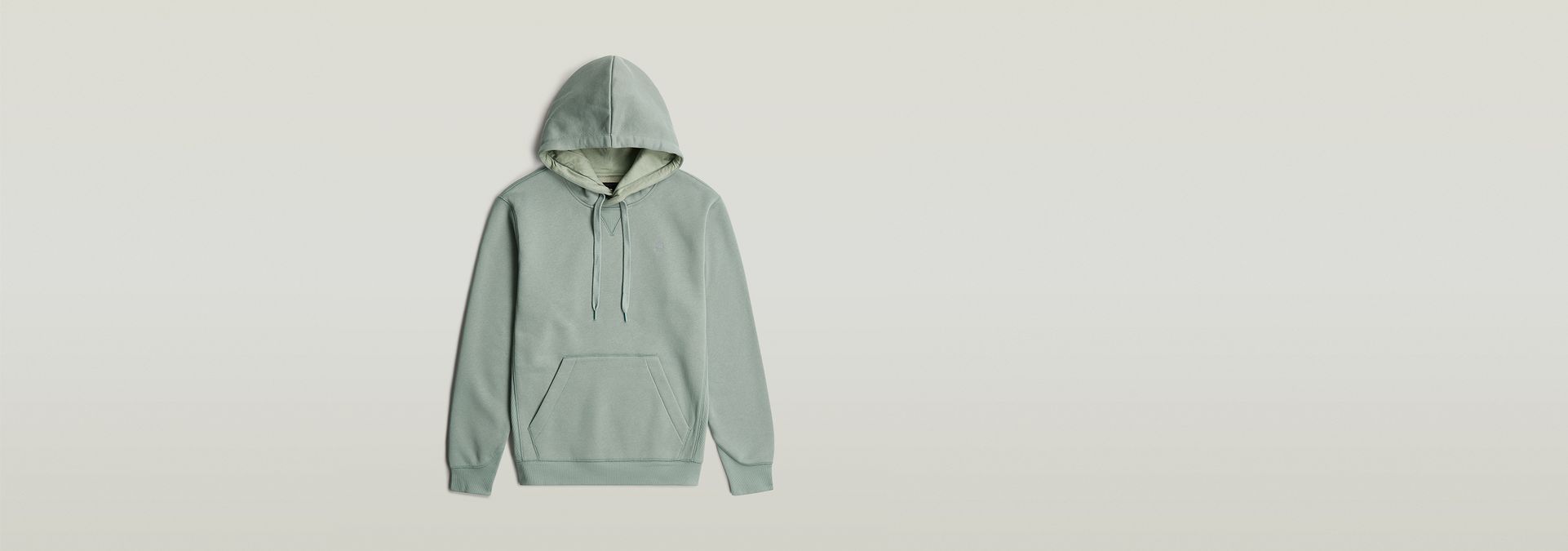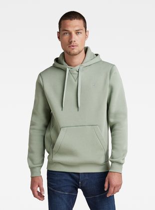 The Premium Core hooded sweater features a kangaroo pocket and a hood with a drawstring. The front shows a cross over construction and a ribbed inset piece. Long sleeves have a curved finish, showing a ribbed cuff underneath. The chest signs this hoody with a subtle G-Star RAW logo.
