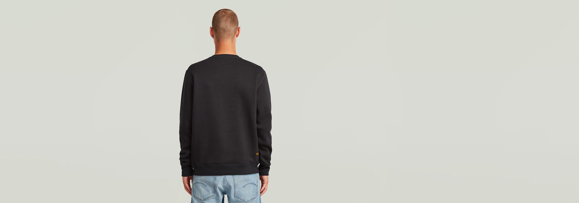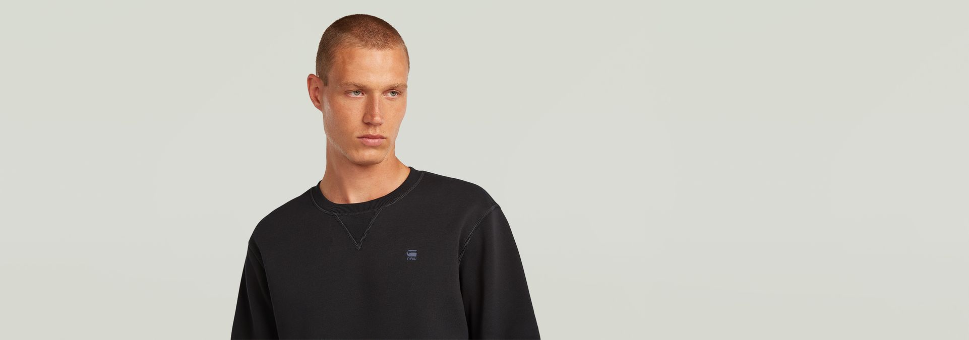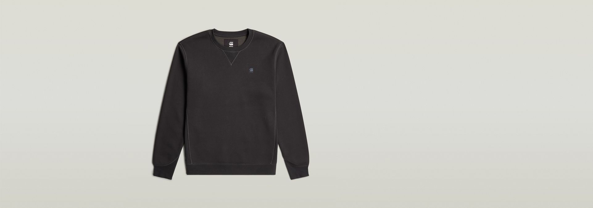 The Premium Core sweater features a rounded neckline with a triangle inset piece underneath. Long sleeves have a curved finish, showing a ribbed cuff underneath.