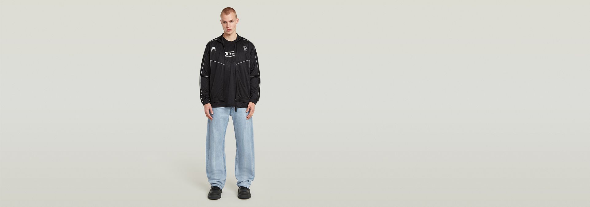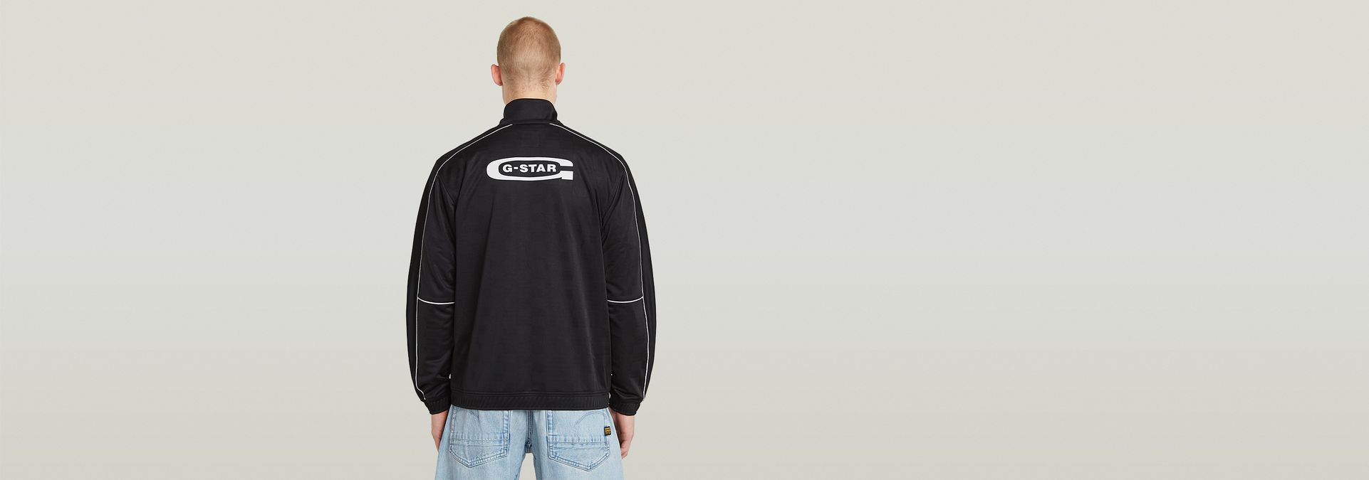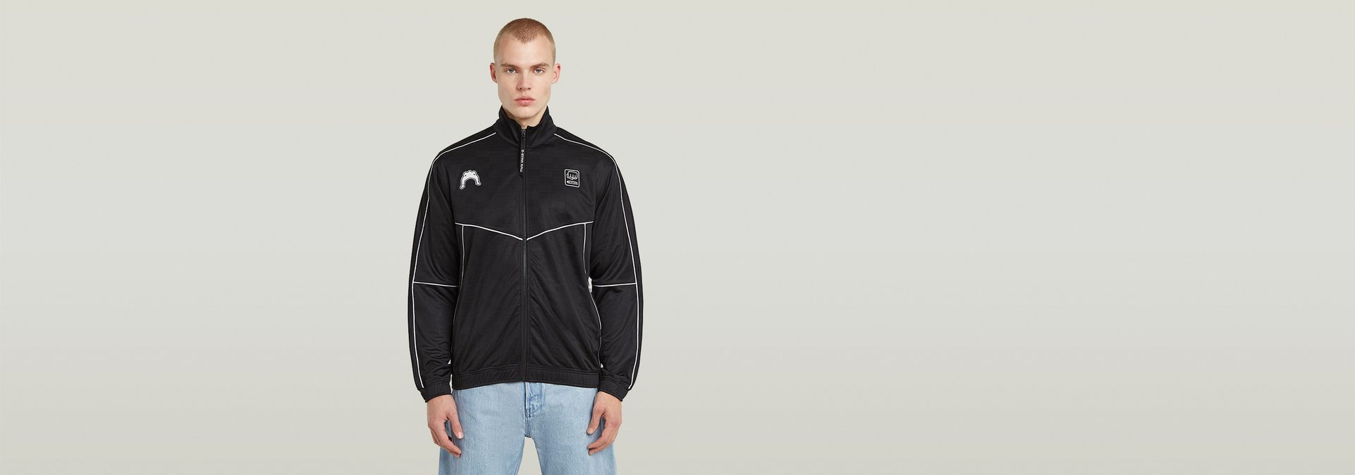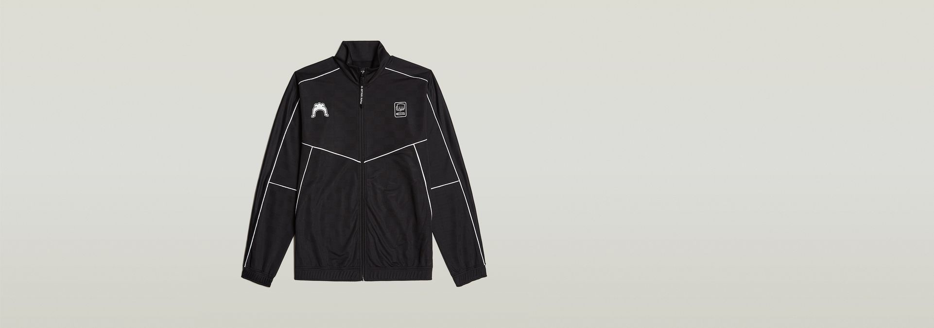 Zip thru track top Football is cut in a straight fit and offers a raised collar. Pockets are caught in the front seams. The graphic prints and contrast colored piping make it stand out.
