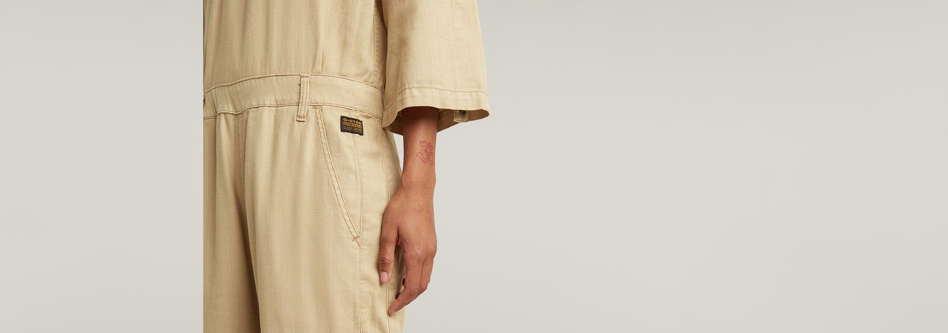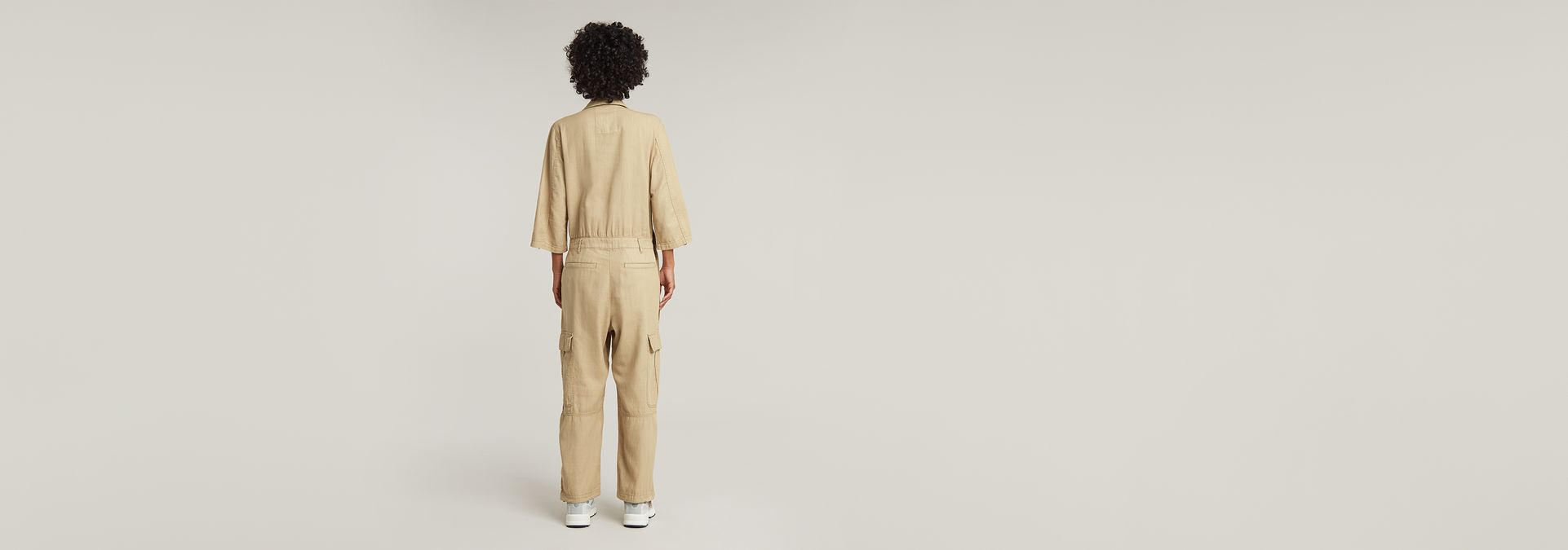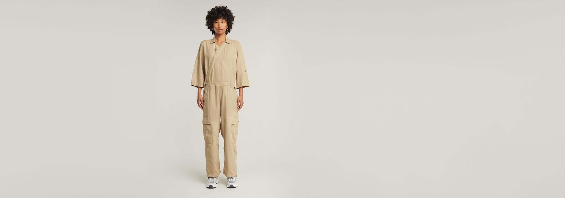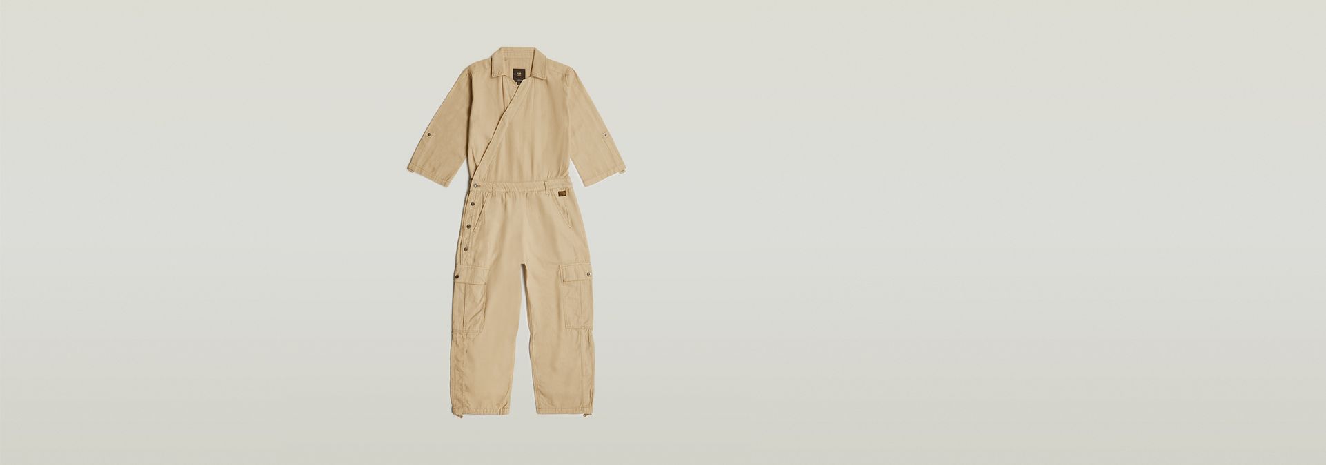 Jumpsuit Wrap is designed in a straight fit and offers 3/4 sleeves that can be folded to a shorter length. The button applied will keep it in place. This suit shows inset pockets, deep flap pockets at the thigh, single welt back pockets and offers and adjustable width around the ankle.