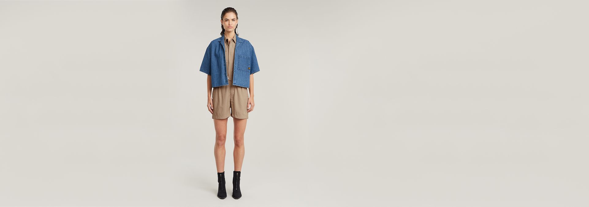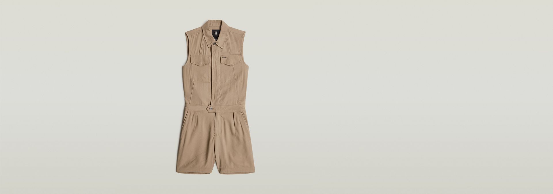 Playsuit Summer offers a sleeveless suit with short legs. At the chest flap pockets are created, of which one side is patched under. This short jumpsuit has a concealed snap button closure and a zip fly. The gathered seam at the back shoulder adds a subtle pleated effect.
