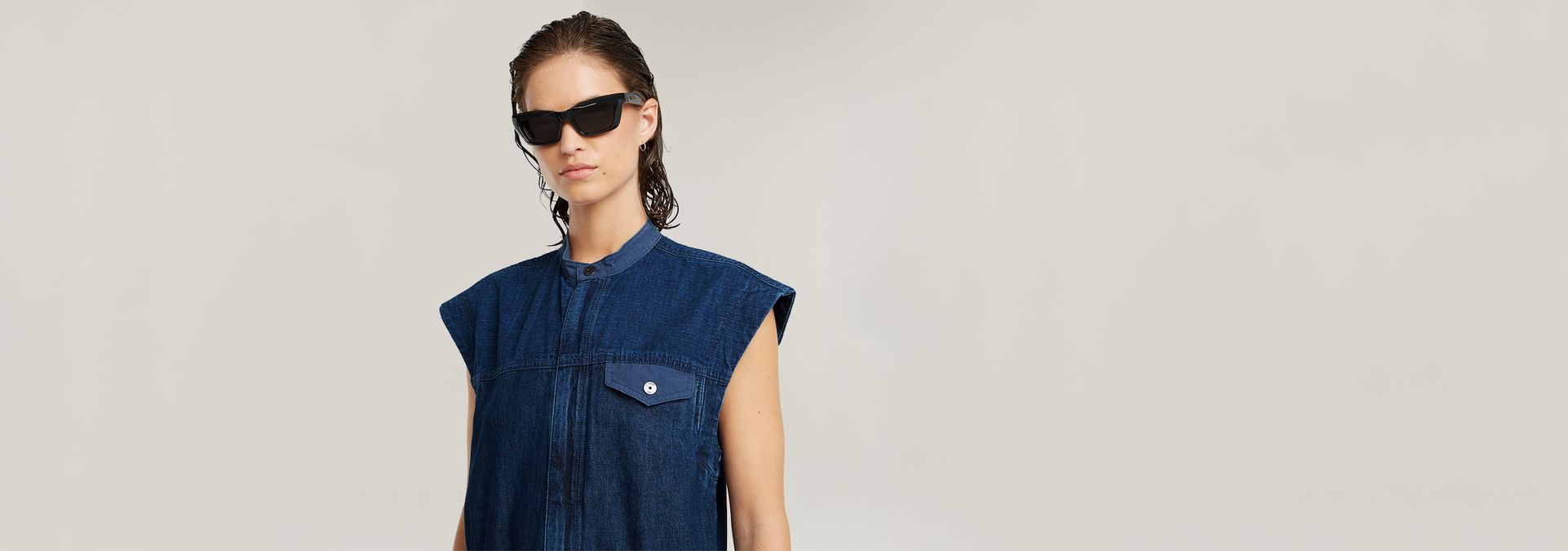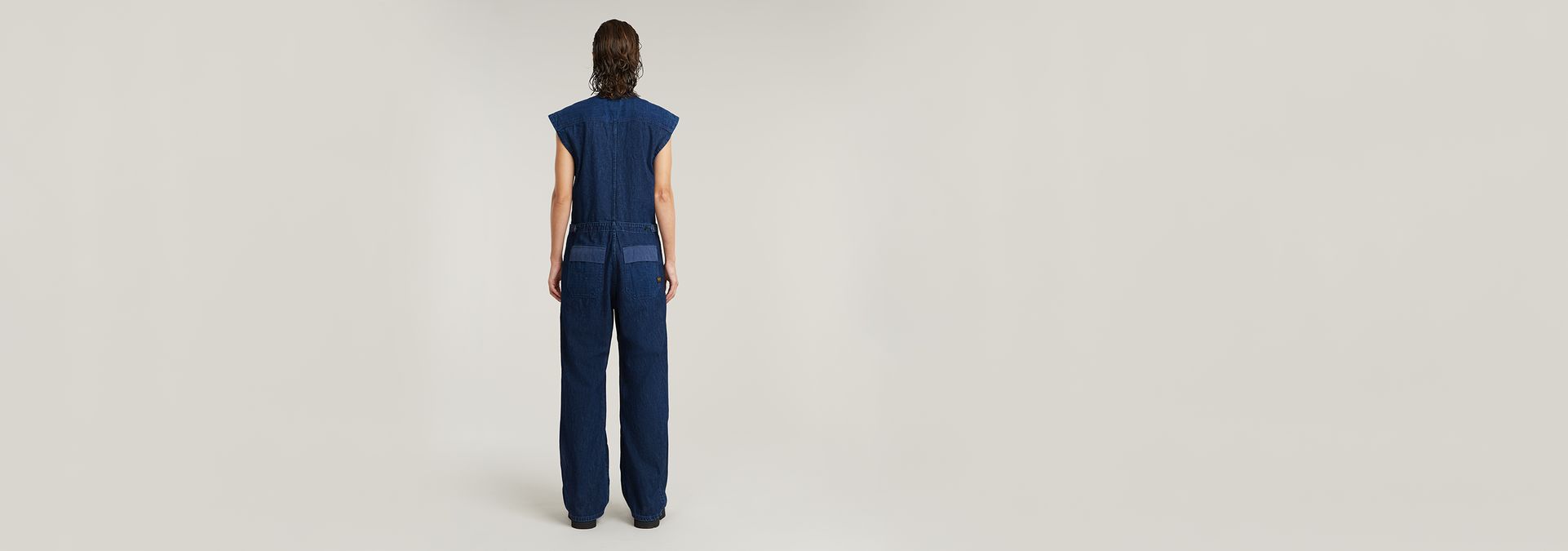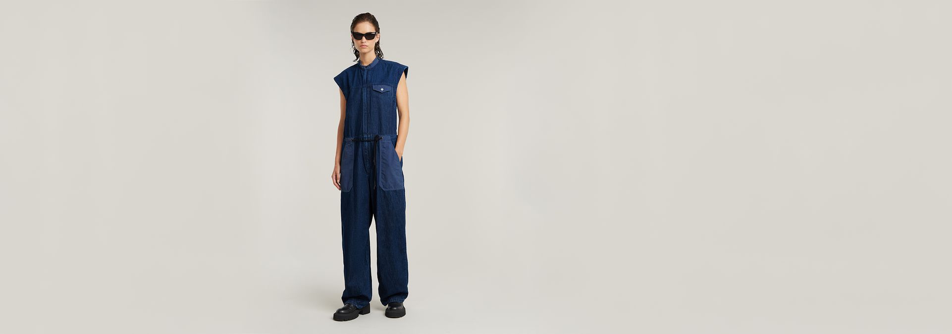Jumpsuit Cocoon is a sleeveless suit in a loose fit. The hidden zipper makes it easy to put on. Adjust the width of this suit with the drawcord and tabs applied. This overall has a single flap pocket at the chest, front pockets and flap pockets at the back.