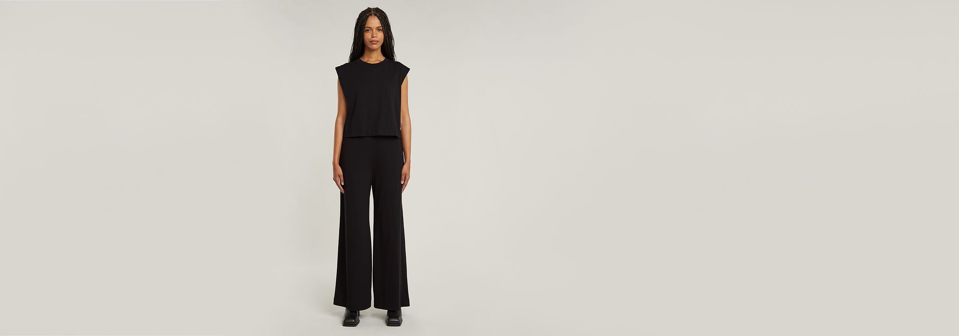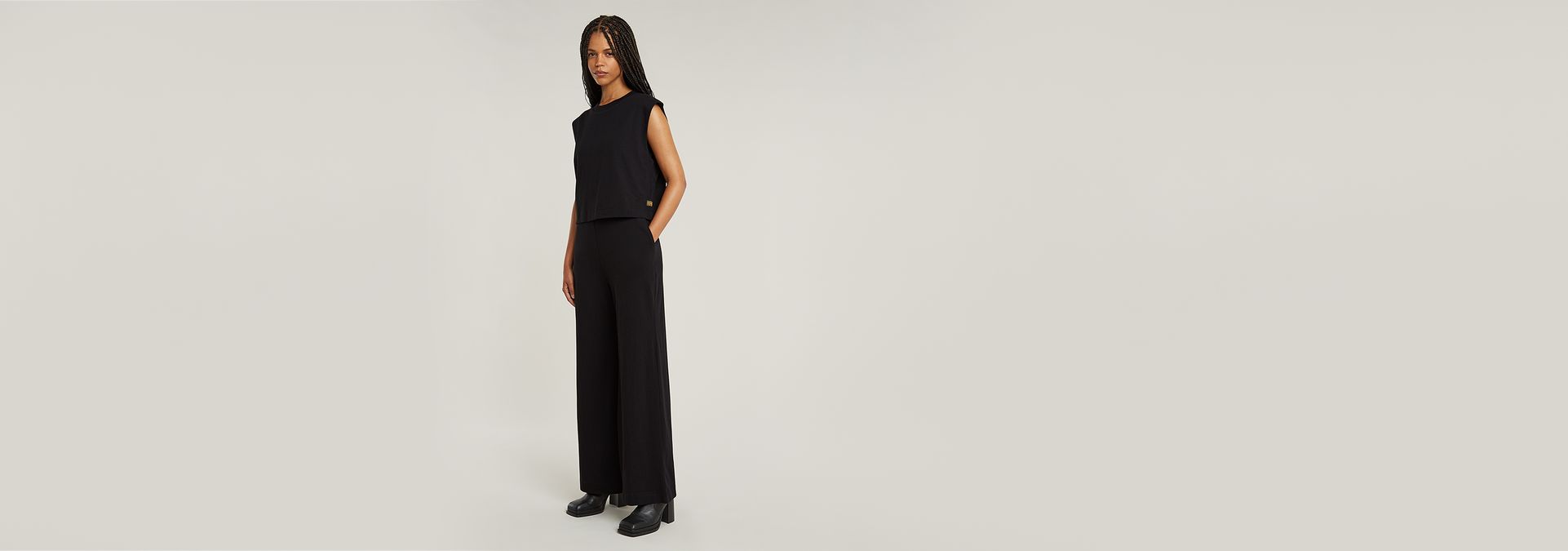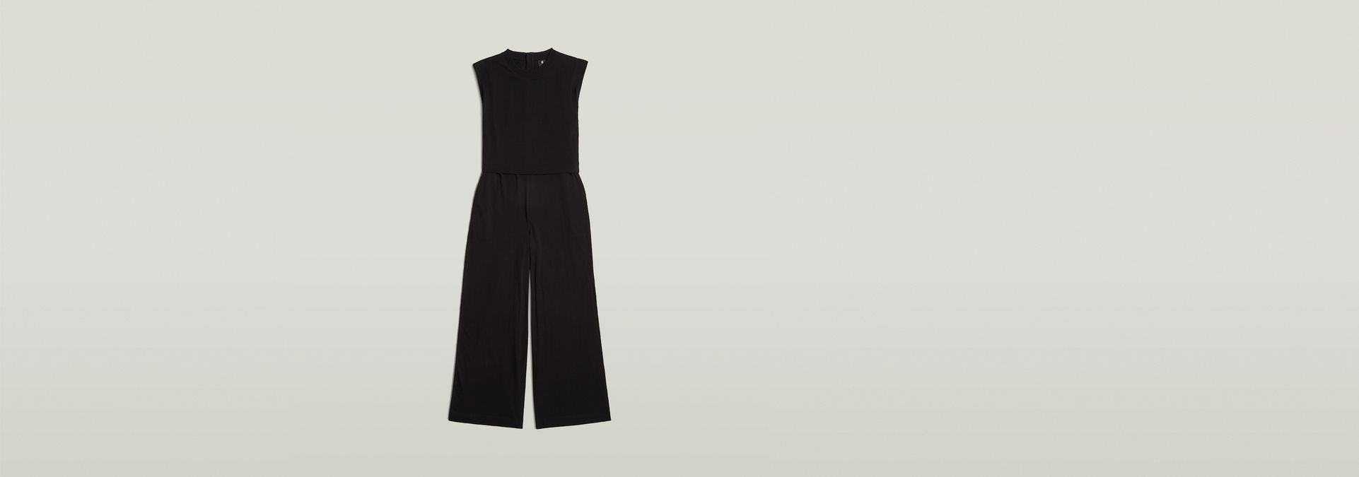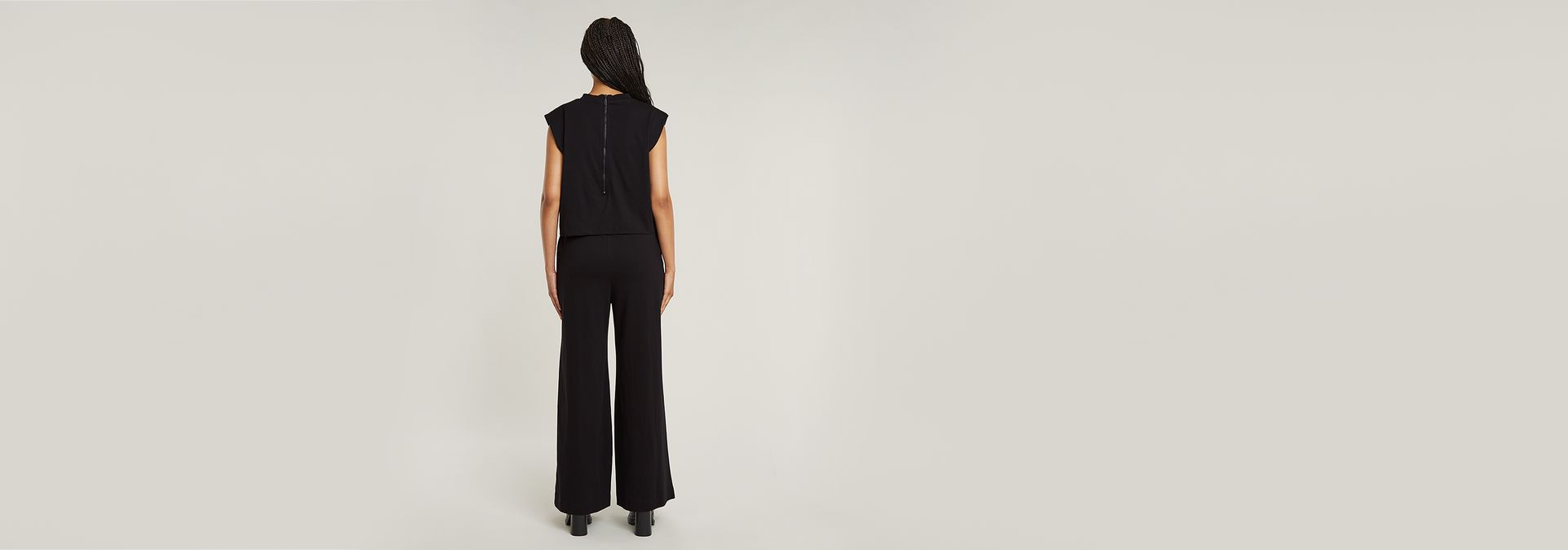 Jumpsuit Double Layer Wide Leg is a 2-piece suit. Concealed buttons at the waist combine the two together. The armholes are cut deep and are partly covered by a gusset piece.