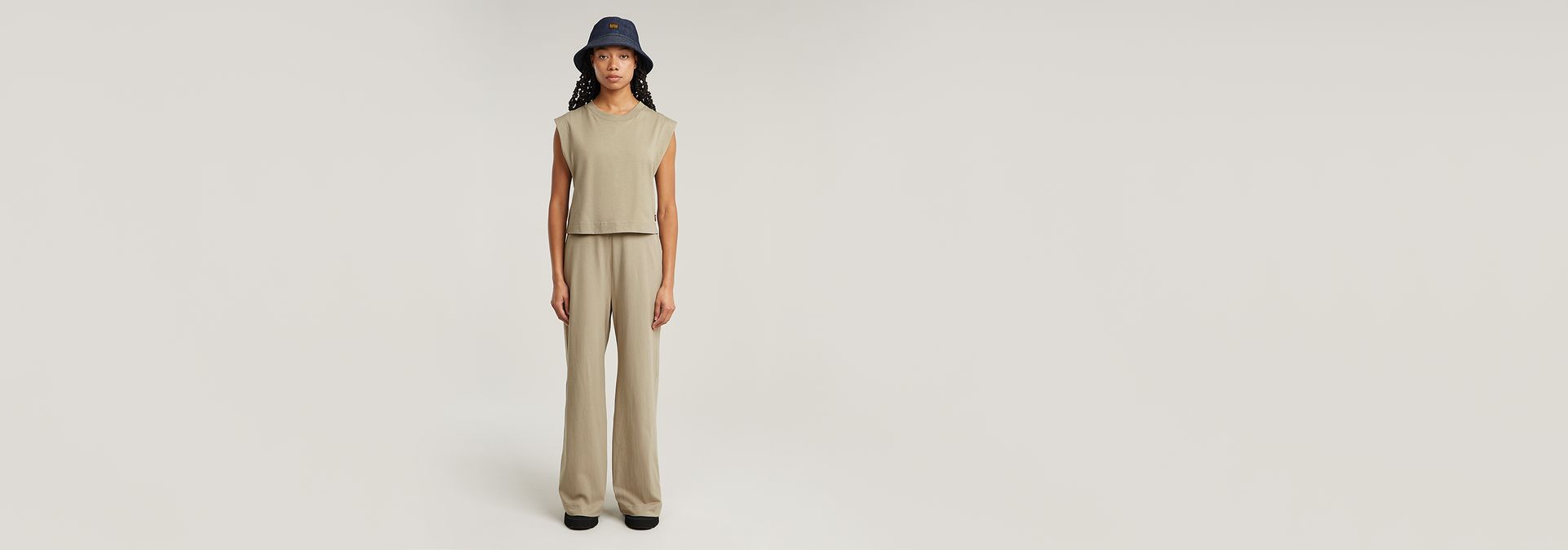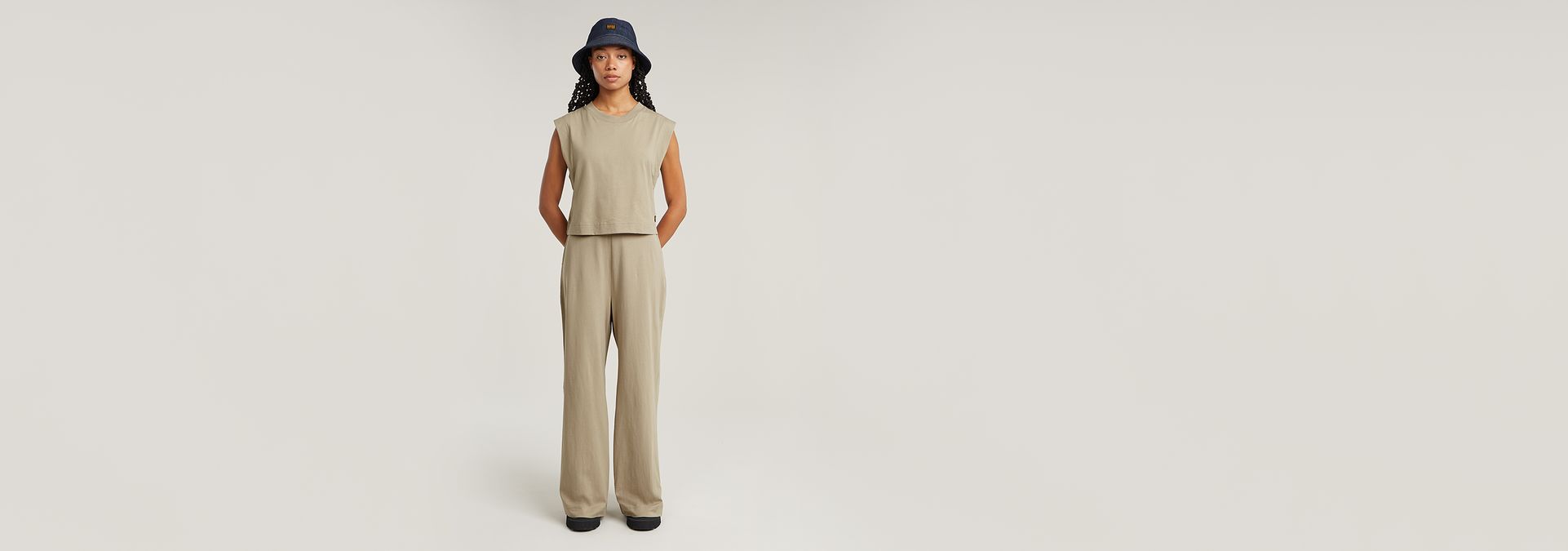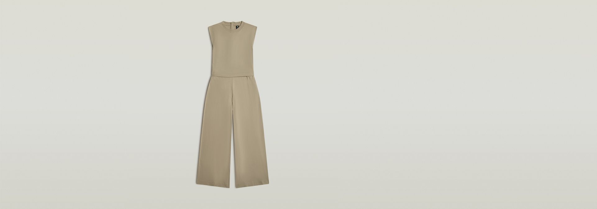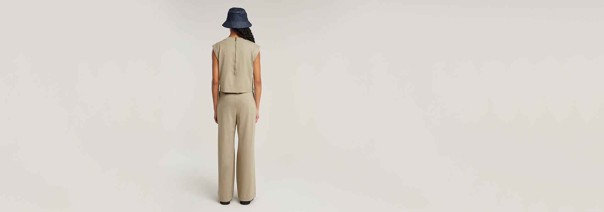 Jumpsuit Double Layer Wide Leg is a 2-piece suit. Concealed buttons at the waist combine the two together. The armholes are cut deep and are partly covered by a gusset piece.