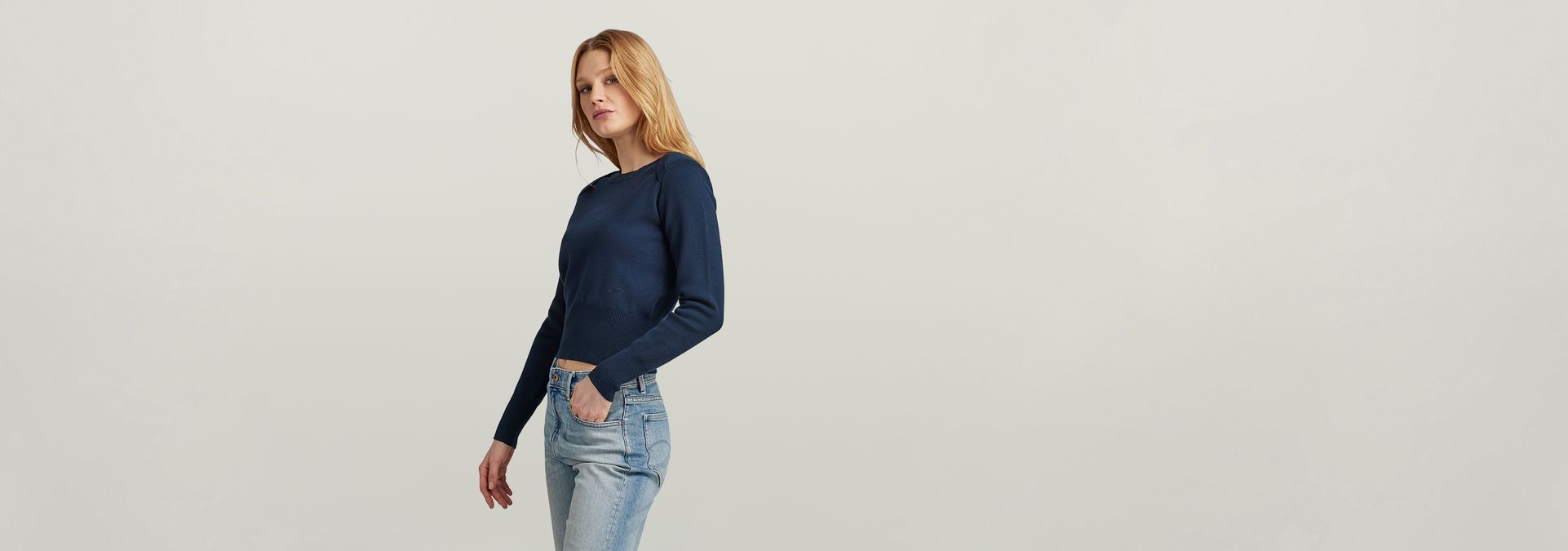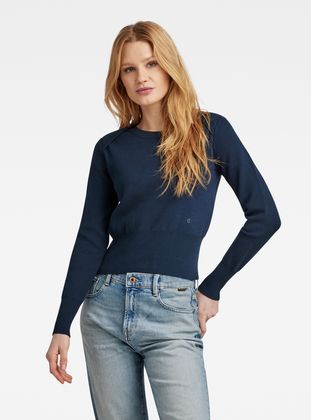 Knitted sweater Moto is designed in a slim fit. The neckline is rounded and finished with a ribbed edge that proceeds in a fold over construction towards the front. The high waist adds volume to this sweater.
