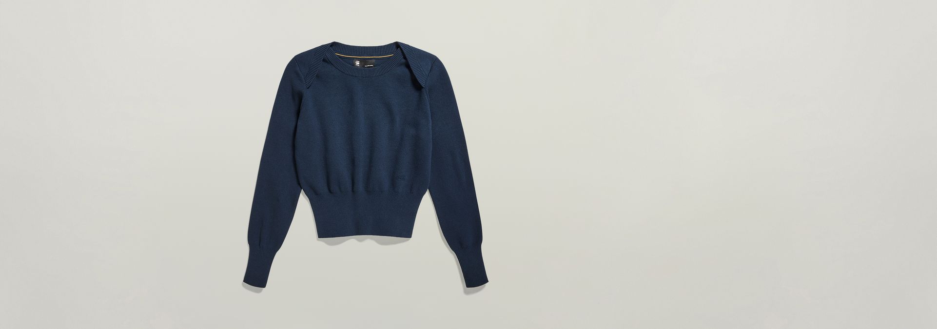 - Ribbed round neck, binding proceeds towards the front shoulder