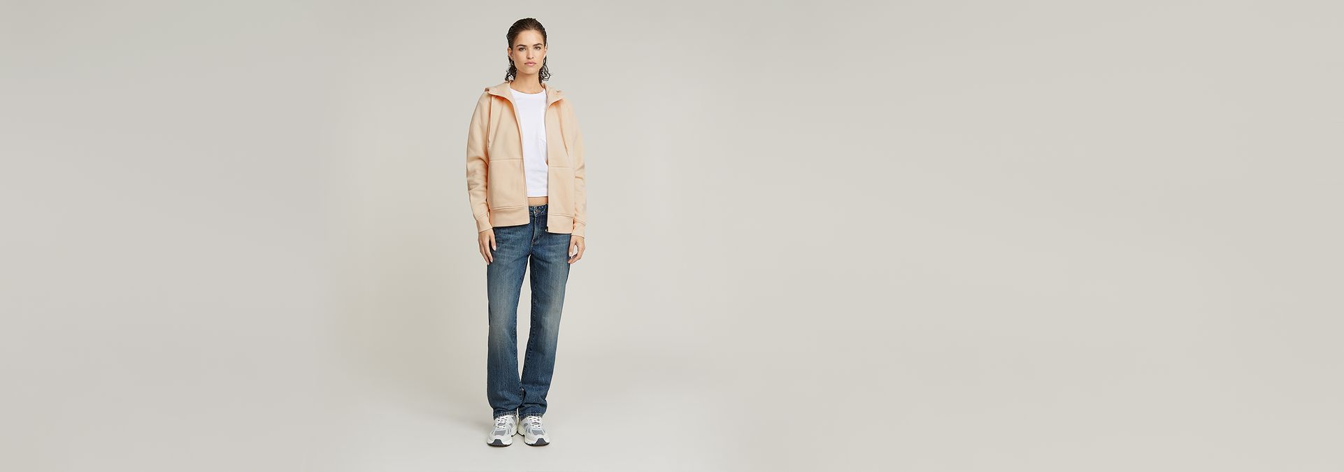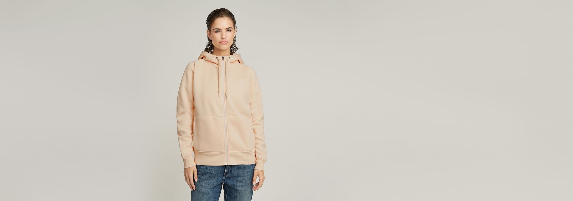 Zip through hoodie Premium Core 2.1 features a lined hood with a raised front and drawstrings. The sleeves show a curved finish with a ribbed cuff underneath. Also the sides and bottom edge are created out of ribbed fabric. Comfy front pockets complete this hooded sweater jacket.