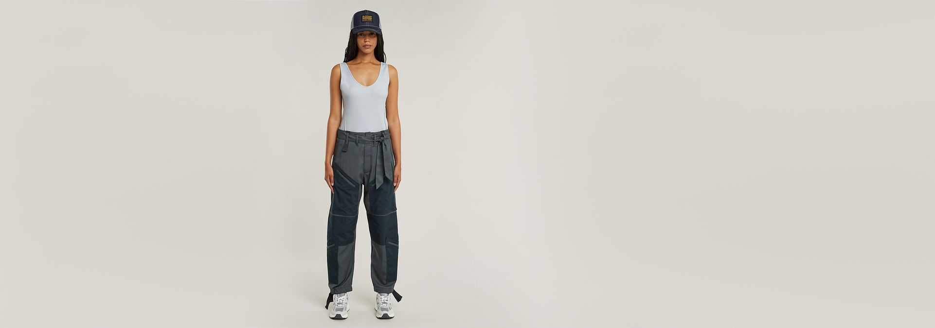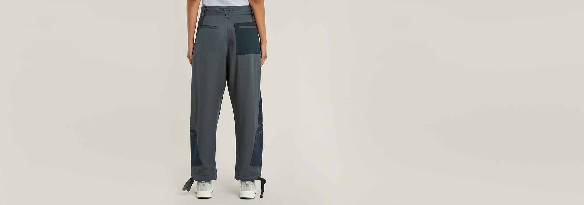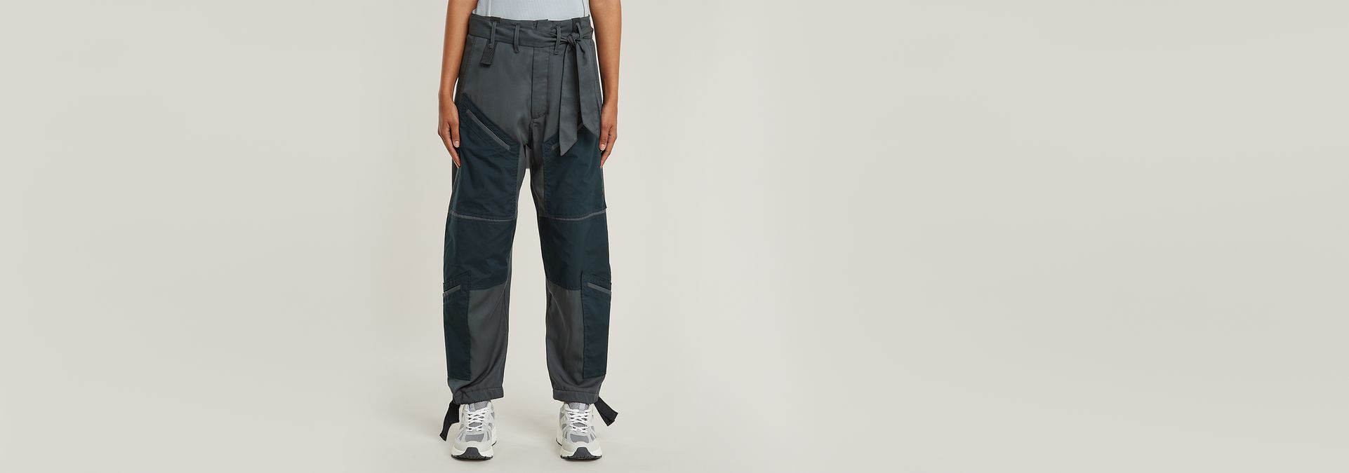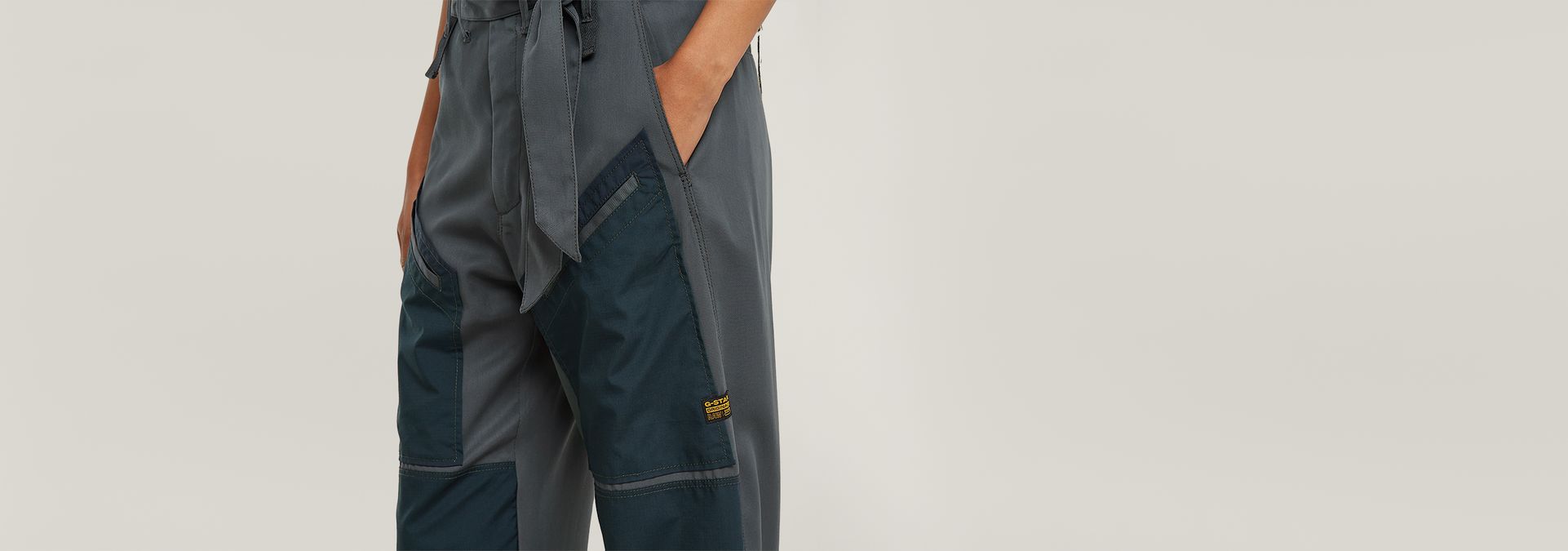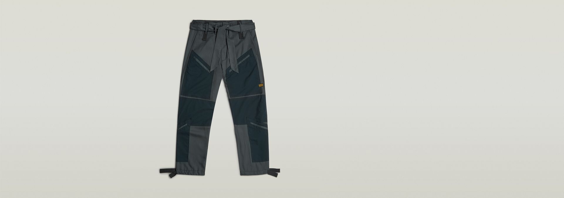 Cargo pants Tone on Tone is designed in a straight fit and offers several pockets, created out of an additional fabric. By using the woven belt and pulling the cords at the hem, more shape can be created.