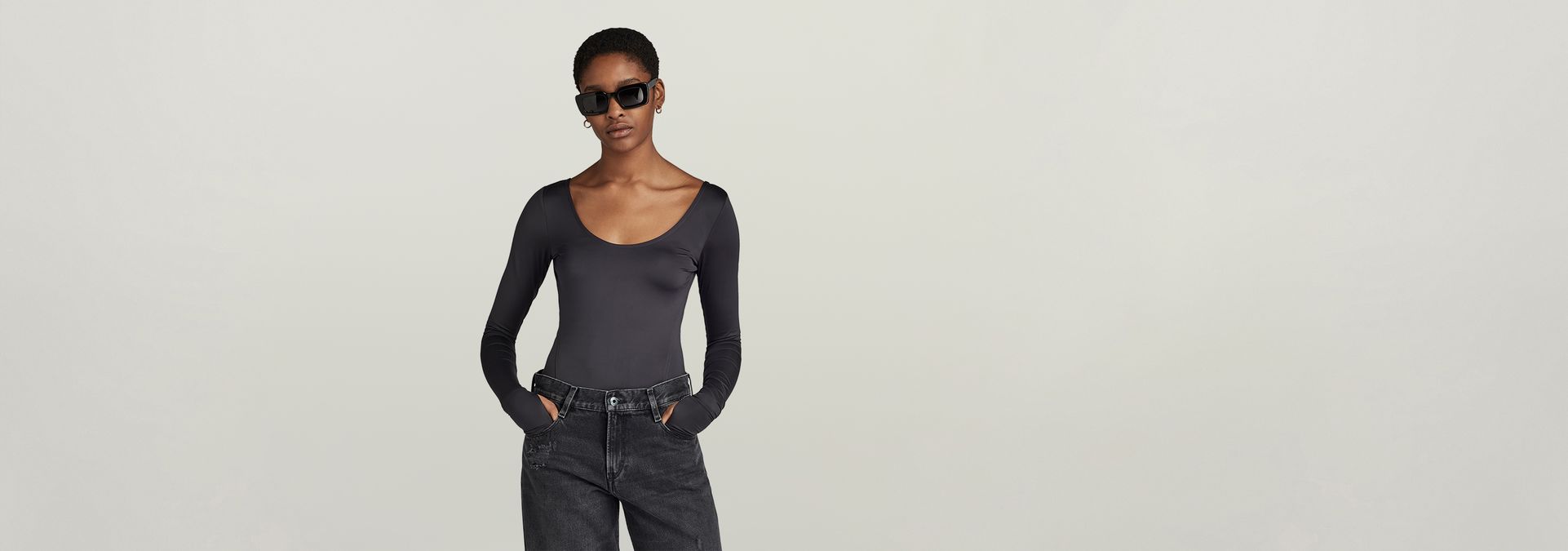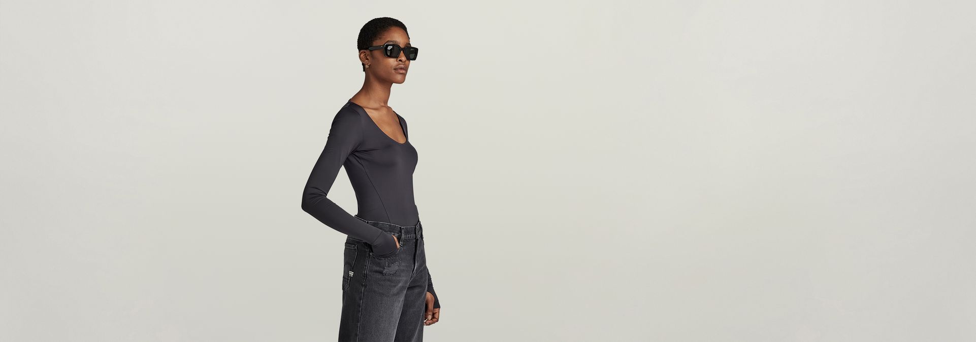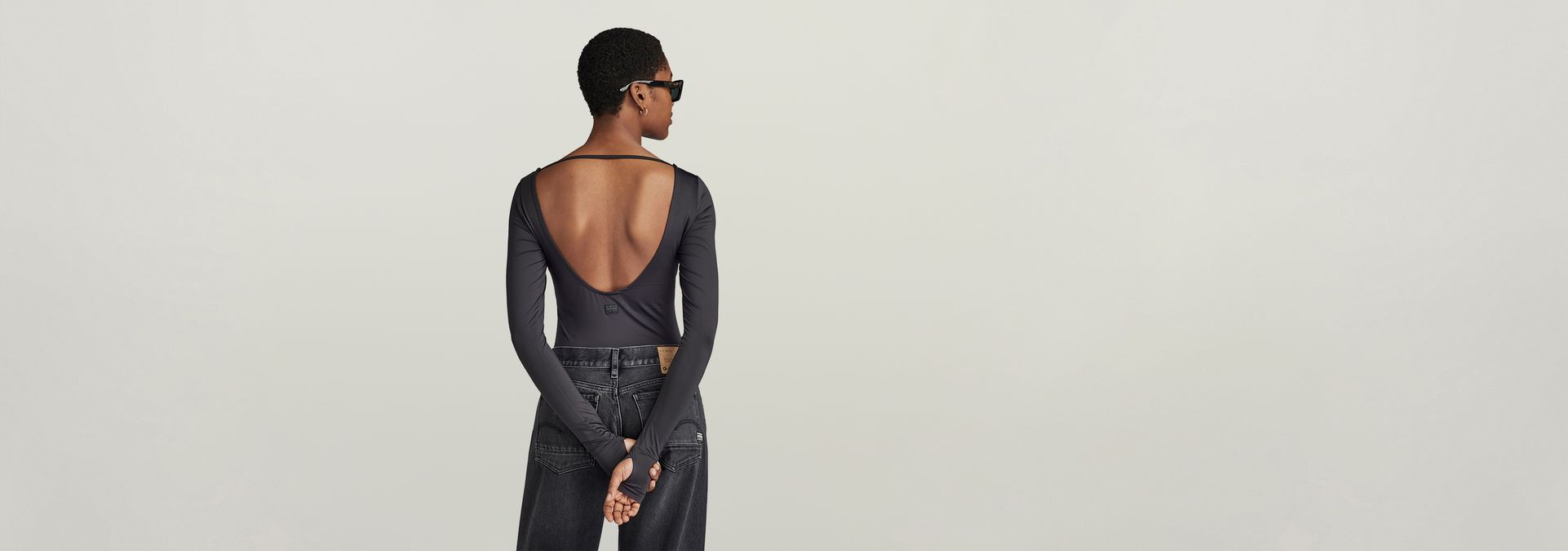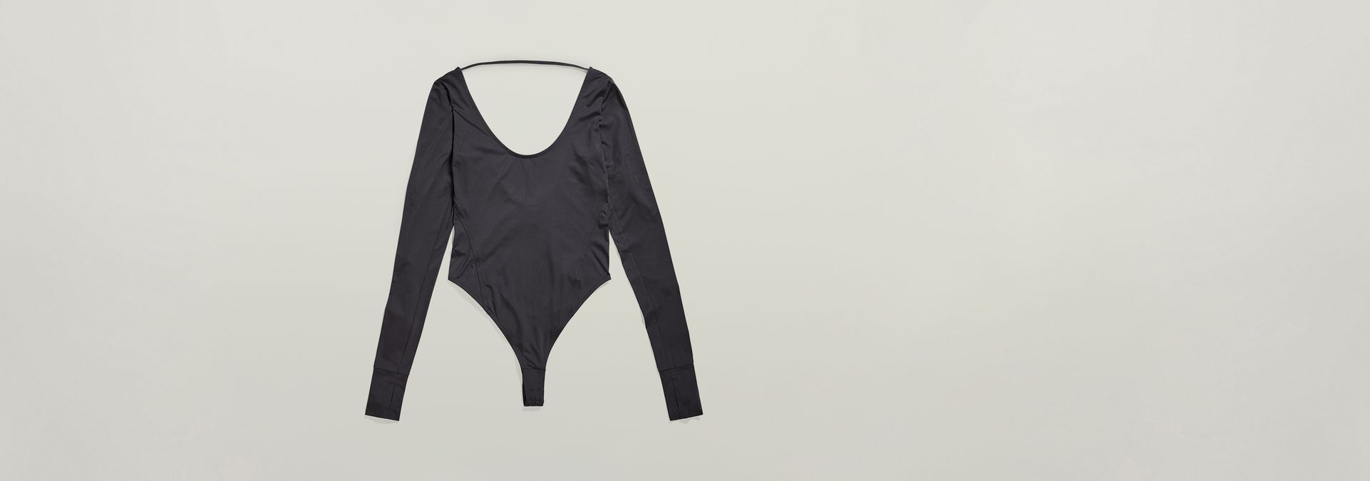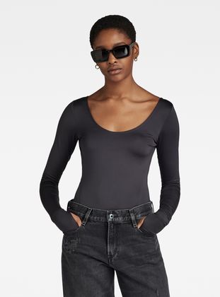 Slim body top Deep Scoop offers a deep round neck. A horizontal tape is placed across the back shoulders, offering a deep back underneath. The sleeves show an extended cuff with a thumbhole. A G-Star RAW graphic print is added to one of these. The 2-piece snap button closure allows for an easy entrance of this string body top.