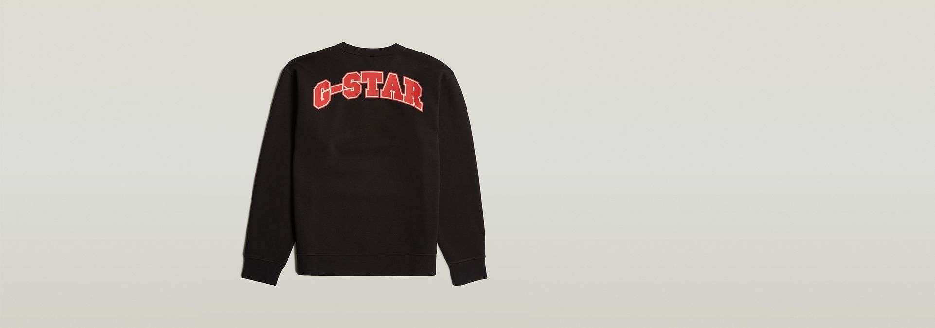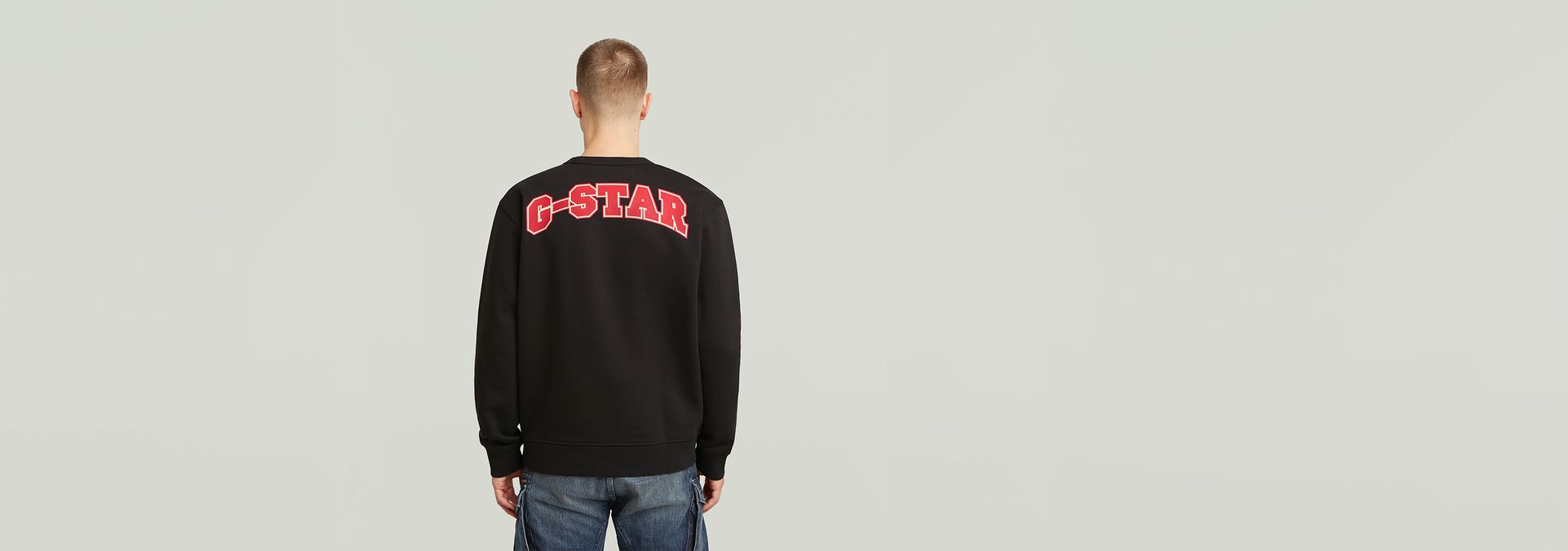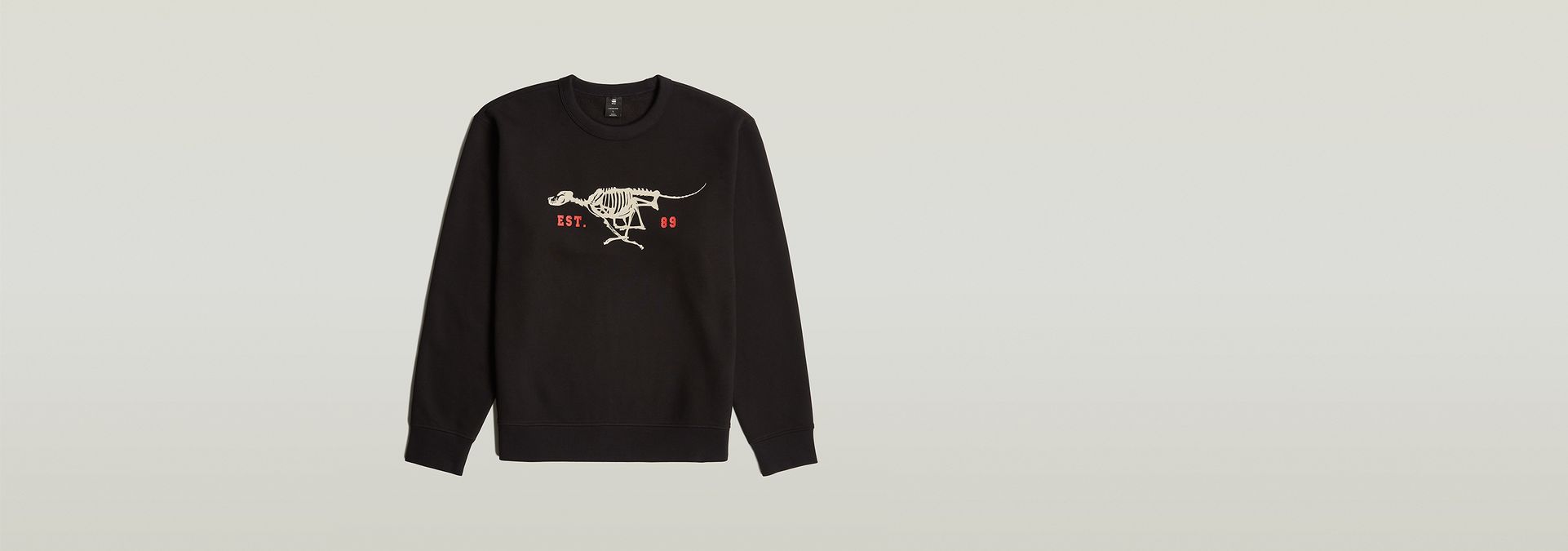 The Running Dog Back Graphic Sweater features a relaxed fit with graphic prints on the front and back, adding a bold touch.