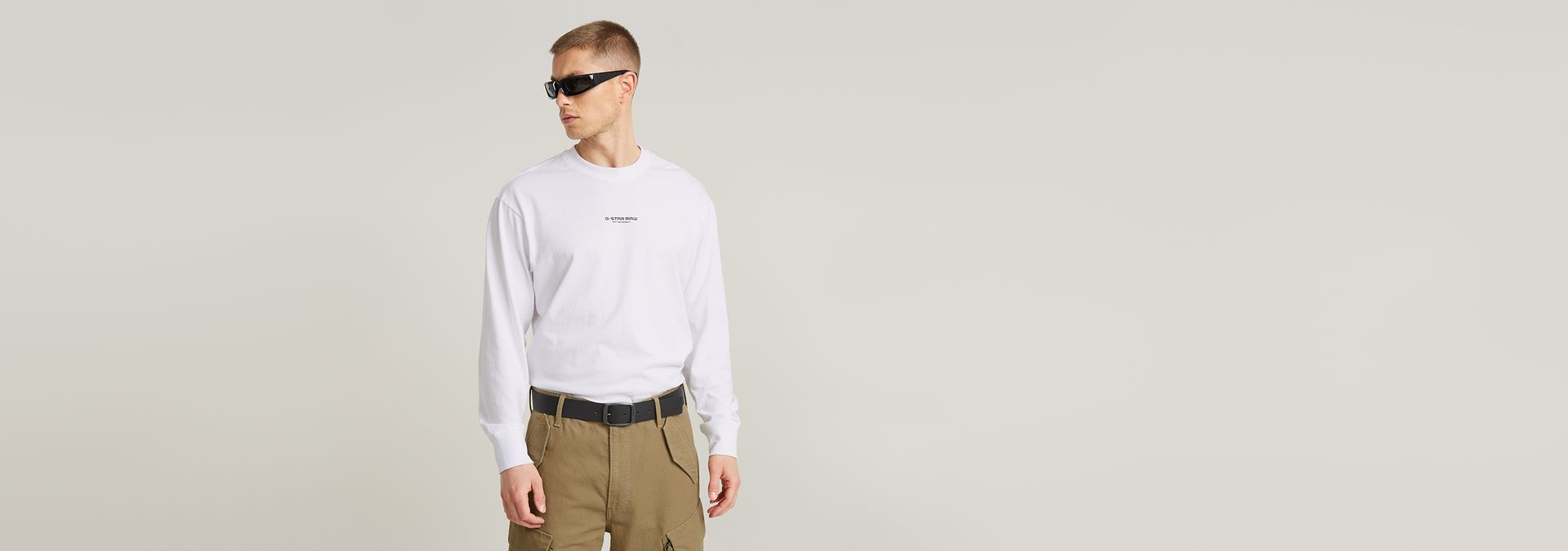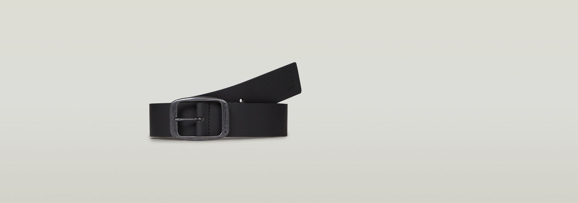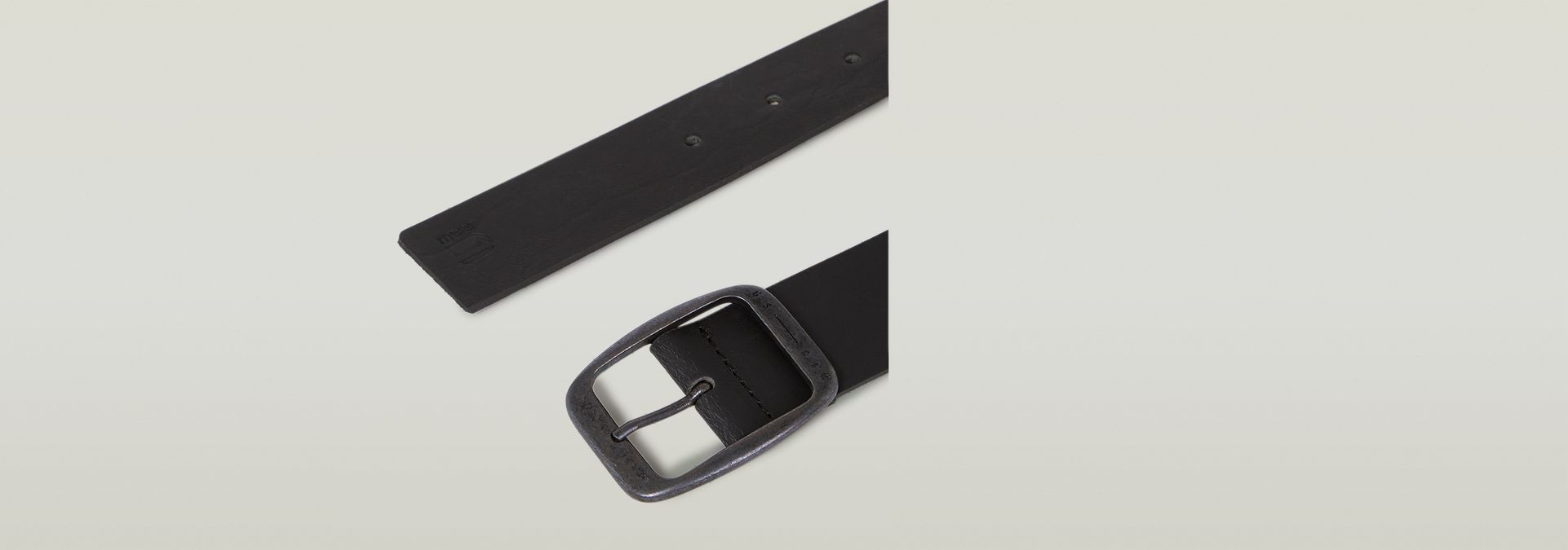 This Mett belt features a black colored metal buckle, subtle engraved with GS RAW. The full grain leather strap offers a debossed graphic at the end.