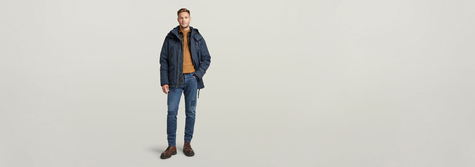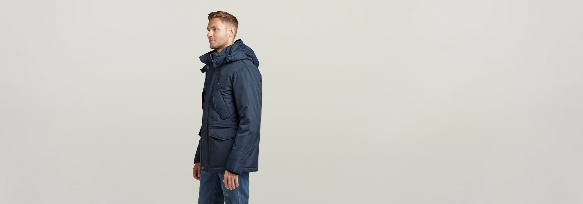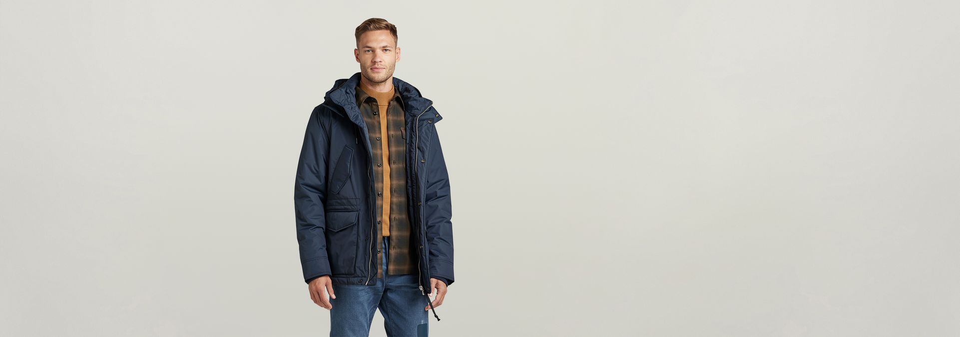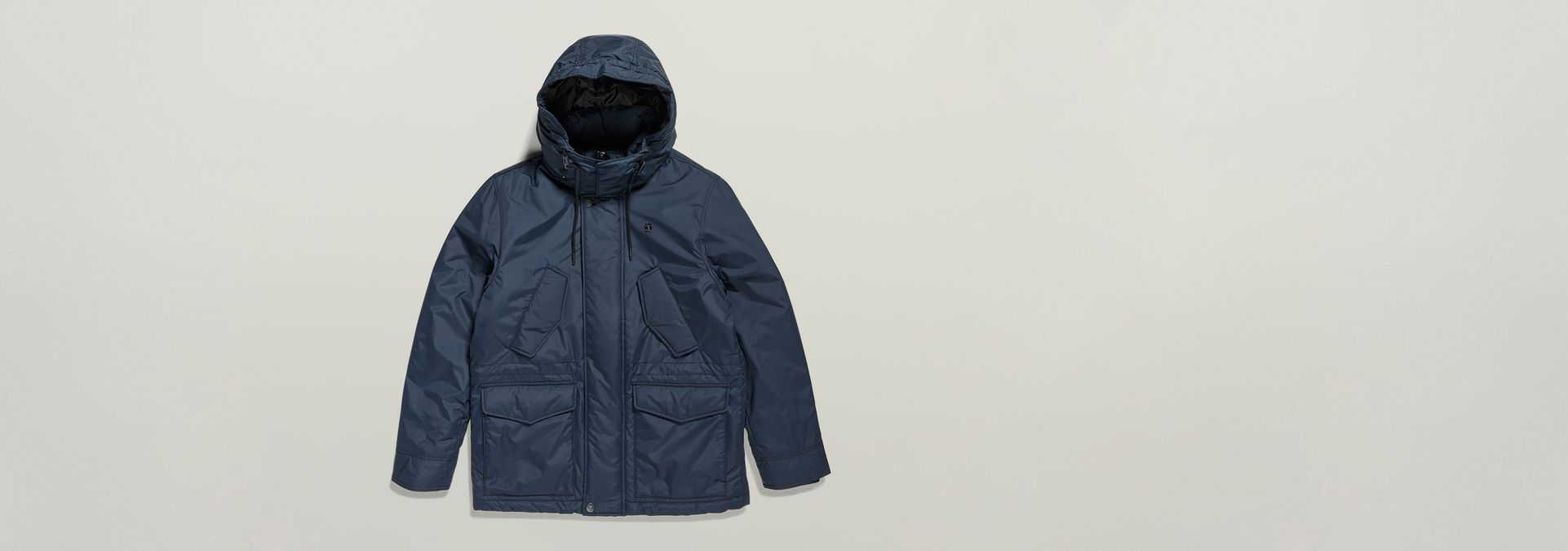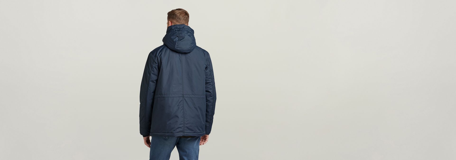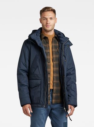 Padded jacket Vodan offers a detachable hood with a slim peak. Pull cords are added to the raised front. The zipper closure is covered by a wind blocker panel and secured by a hidden snap button closure. Also the sleeves offer wind protection by the ribbed cuffs that are placed within. This hooded jacket shows roomy pockets at the waist with a flap and hidden snap button closures. Side entry pockets are placed underneath. At the chest, slanted flap pockets are created with the same concealed closure. Inside, an inner pocket is combined with a pull cord at the waist. A hanger loop is added for ease.