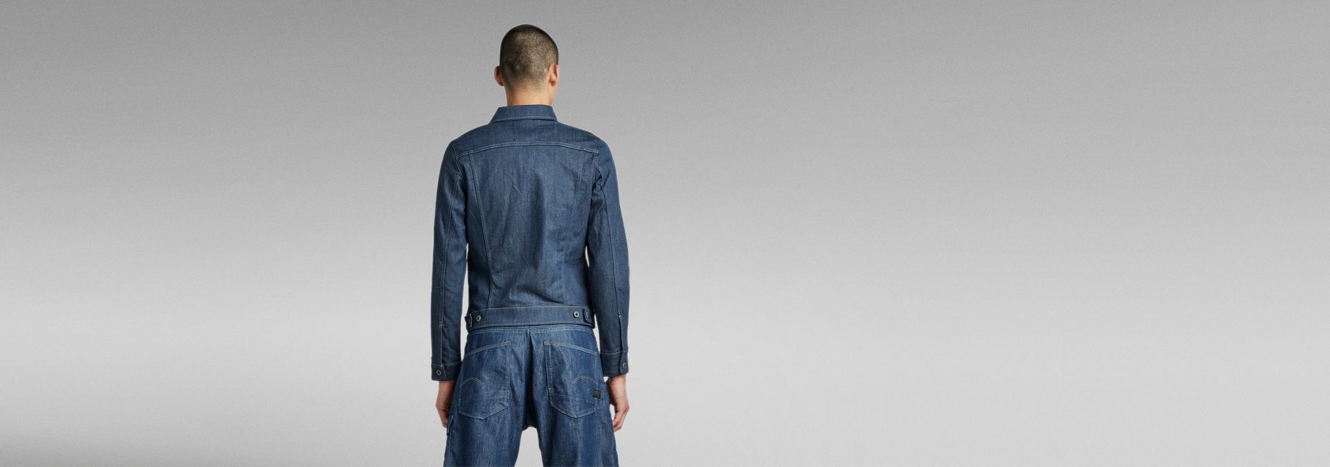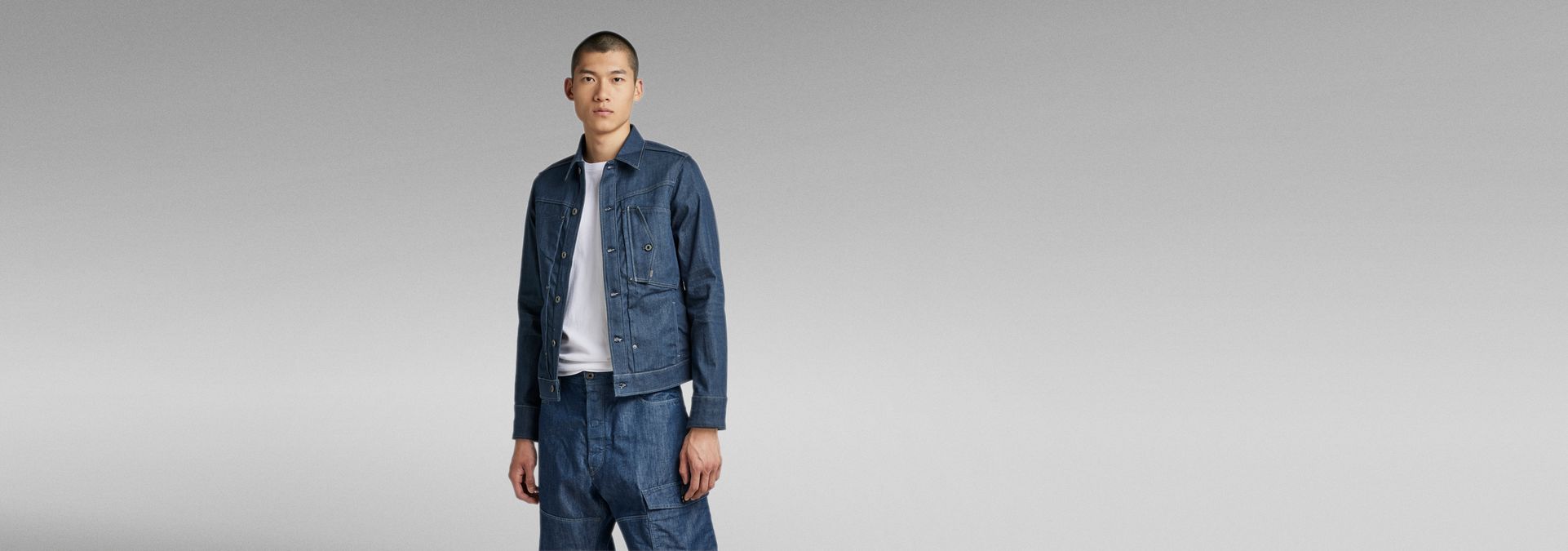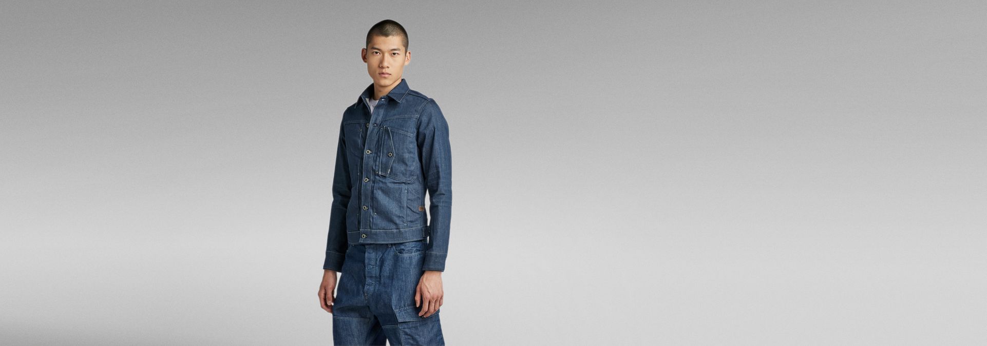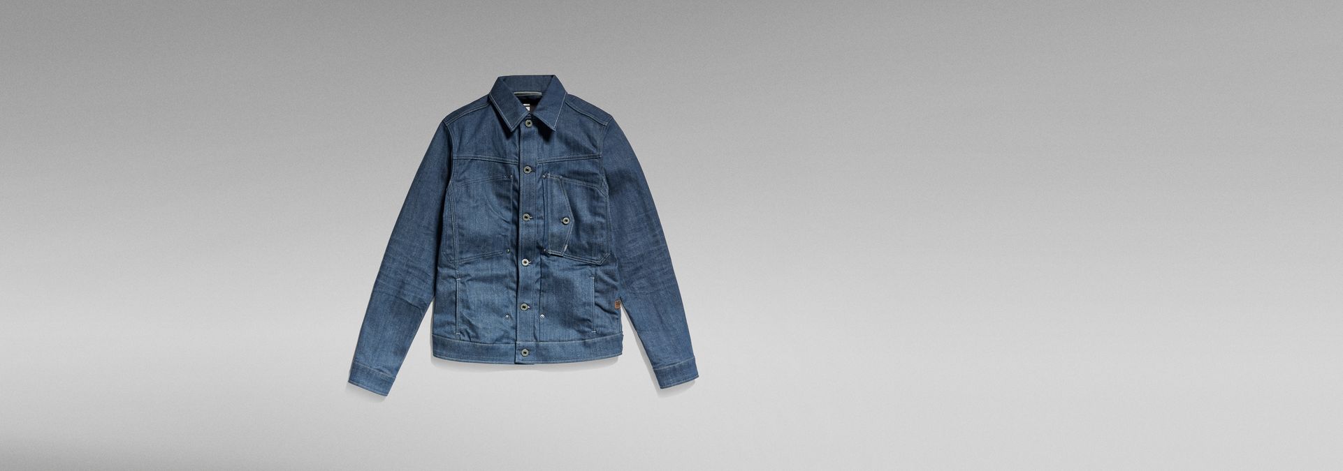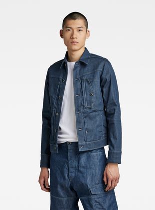 This Scutar Slim Jacket is based on an American denim jacket, showing lots of tailored details on a work wear base. Along the center front the fabric is tucked with rivets creating a 3D effect. Turned chest pockets and side seam pockets add a work wear note.