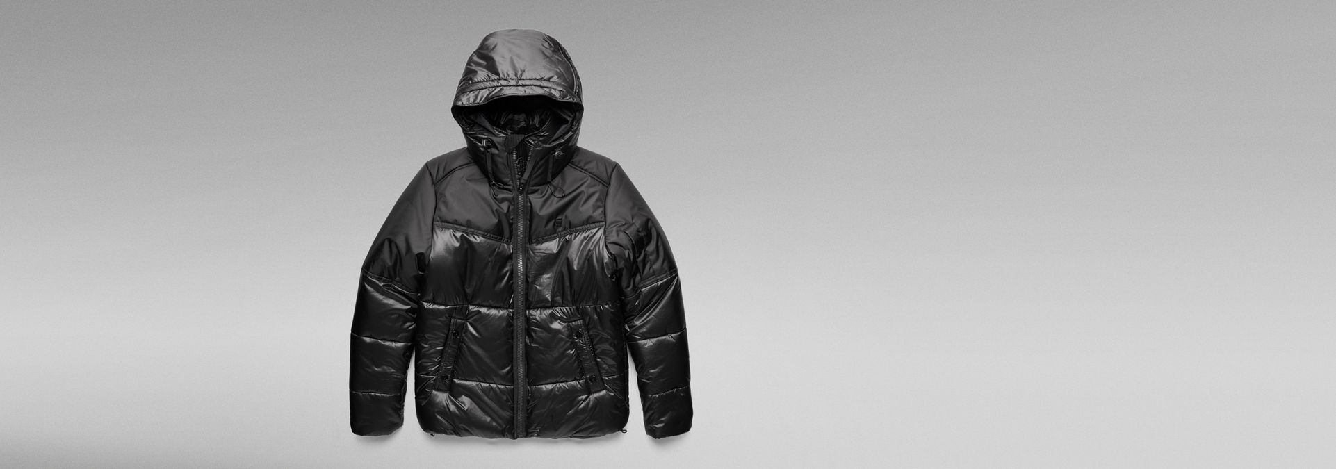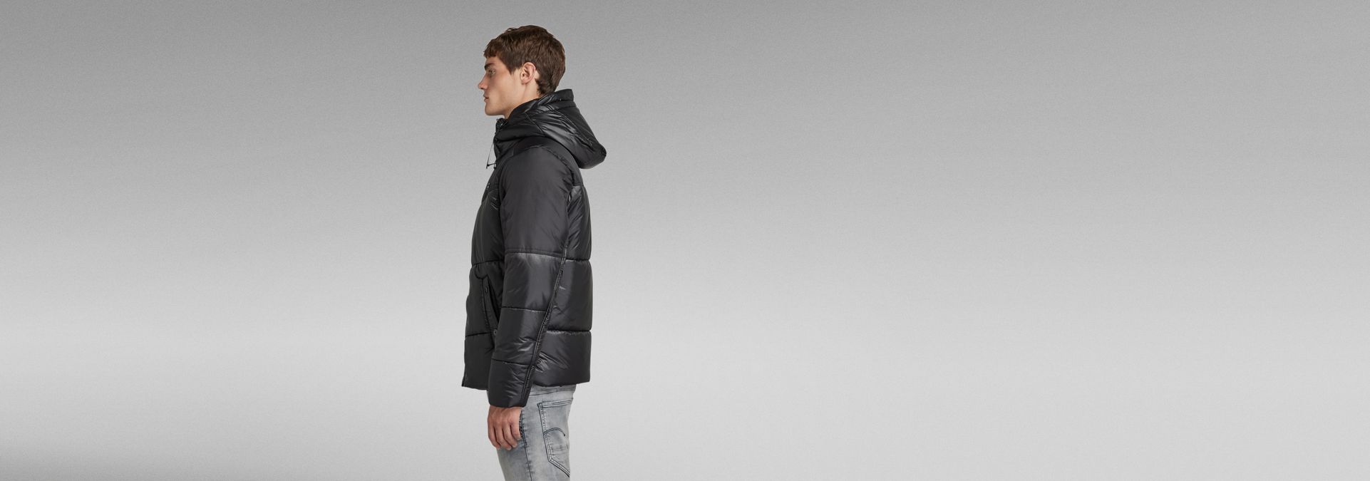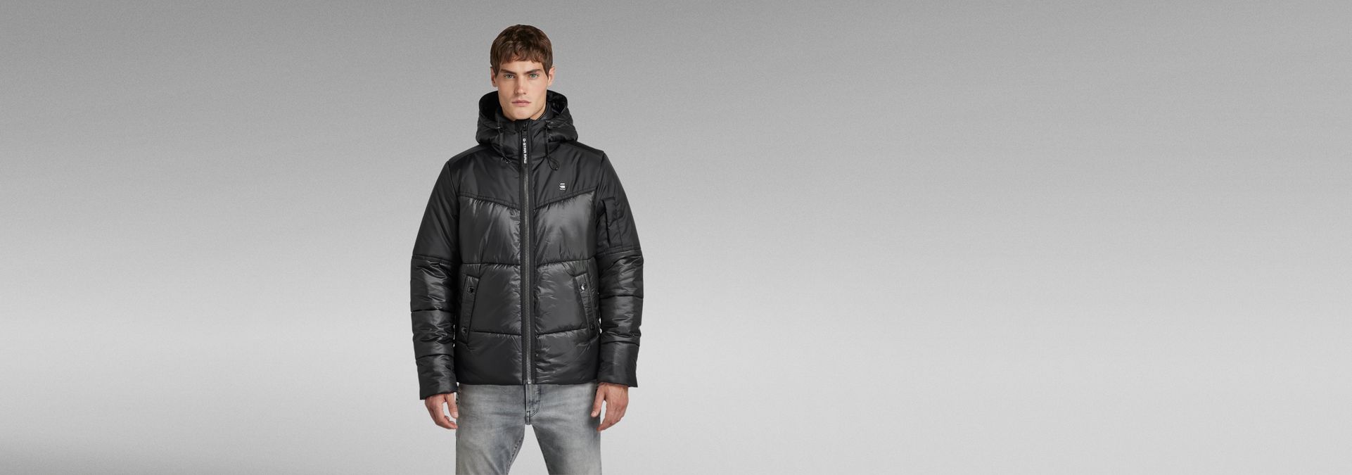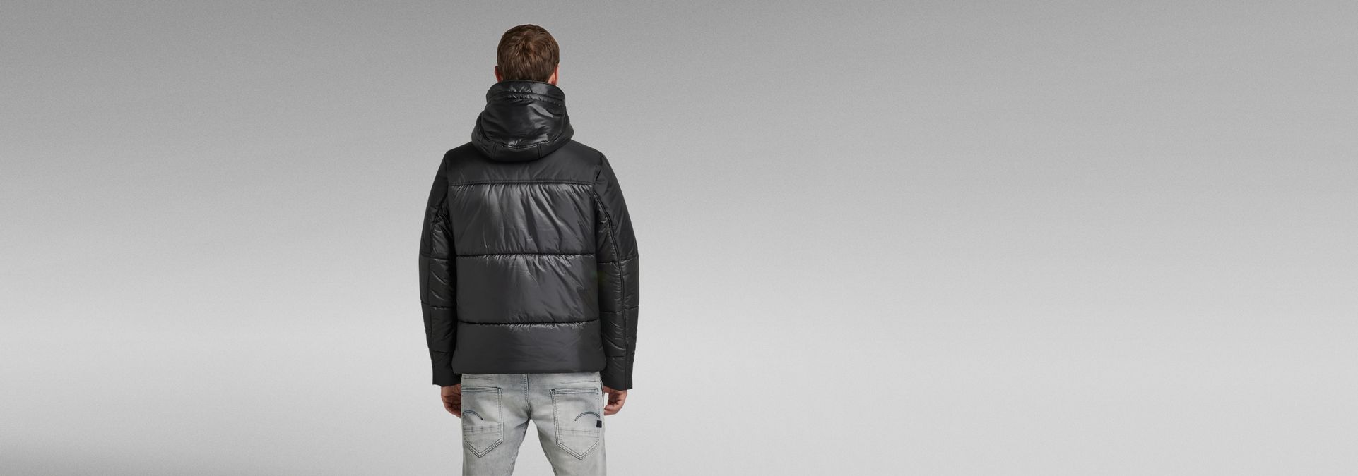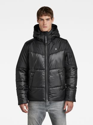 The design of this Quilted puffer jacket shows a raised collar and a grown on hood with a reinforced peak. Integrated pull cords allow for adjustability. The center front zipper is finished with a chin guard and a G-Star RAW pull tab. Welt pockets with snap closure are set at the waist and another welt pocket is placed at the upper sleeve, offering a Velcro closure. This style is designed with a small tape set at the inside to fixate your headphone wire. The heat pressed lining shows a G-Star RAW pattern and offers an inner pocket. Adjustability cords along the hemline and ribbed inner cuffs add comfort to this padded jacket.