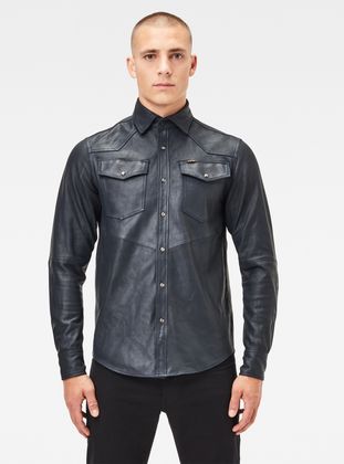 The 3301 Overshirt is based on an authentic western shirt. This version is cut from a smooth leather and offers western flap pockets and a full-length snap button closure.