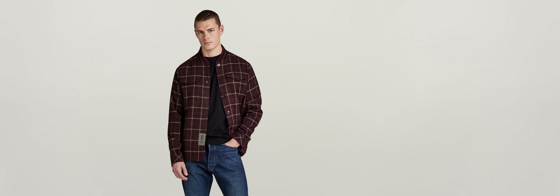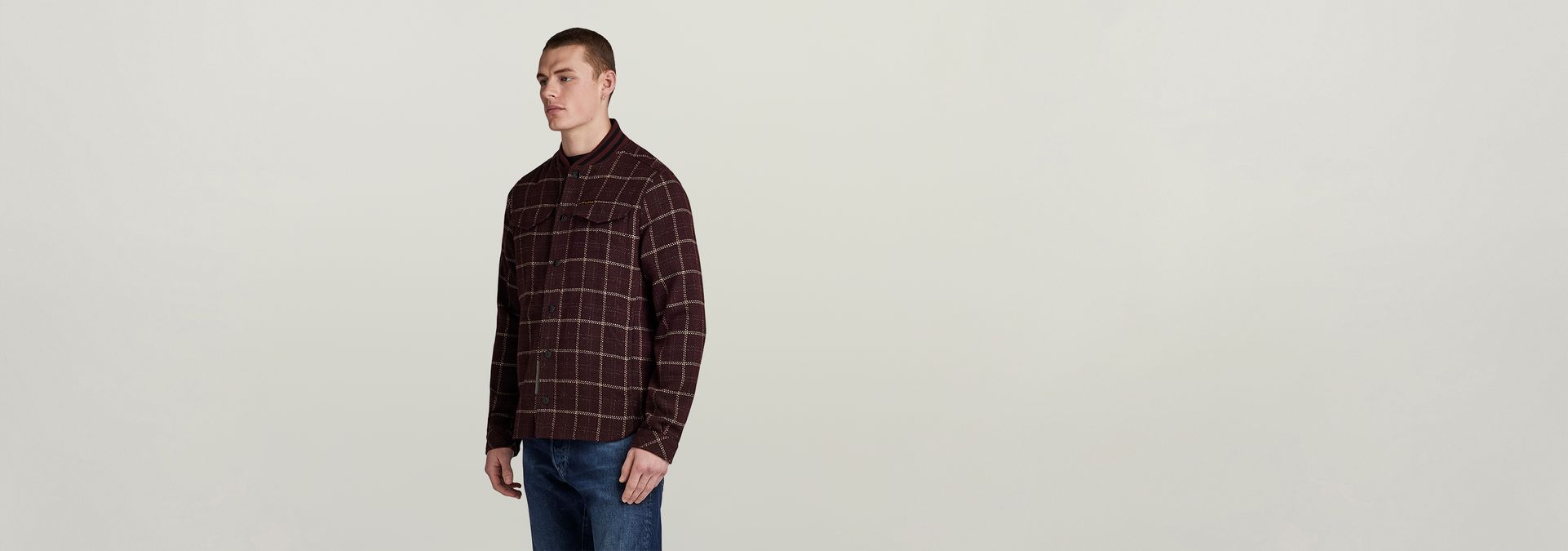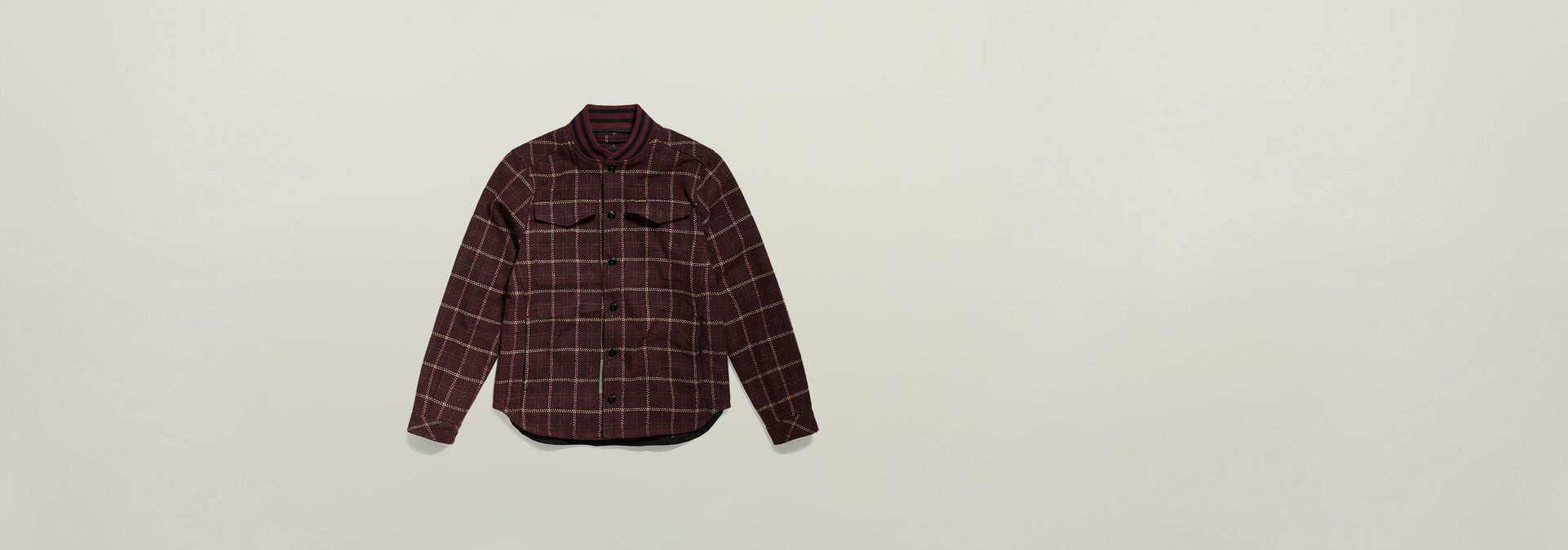Overshirt Bomber collar is designed in a straight fit and offers a ribbed neckline with a striped pattern. Flap pockets at the chest offer a hidden snap button closure. Also in the side seams pockets are created. This checked shirt jacket has a snap button closure.