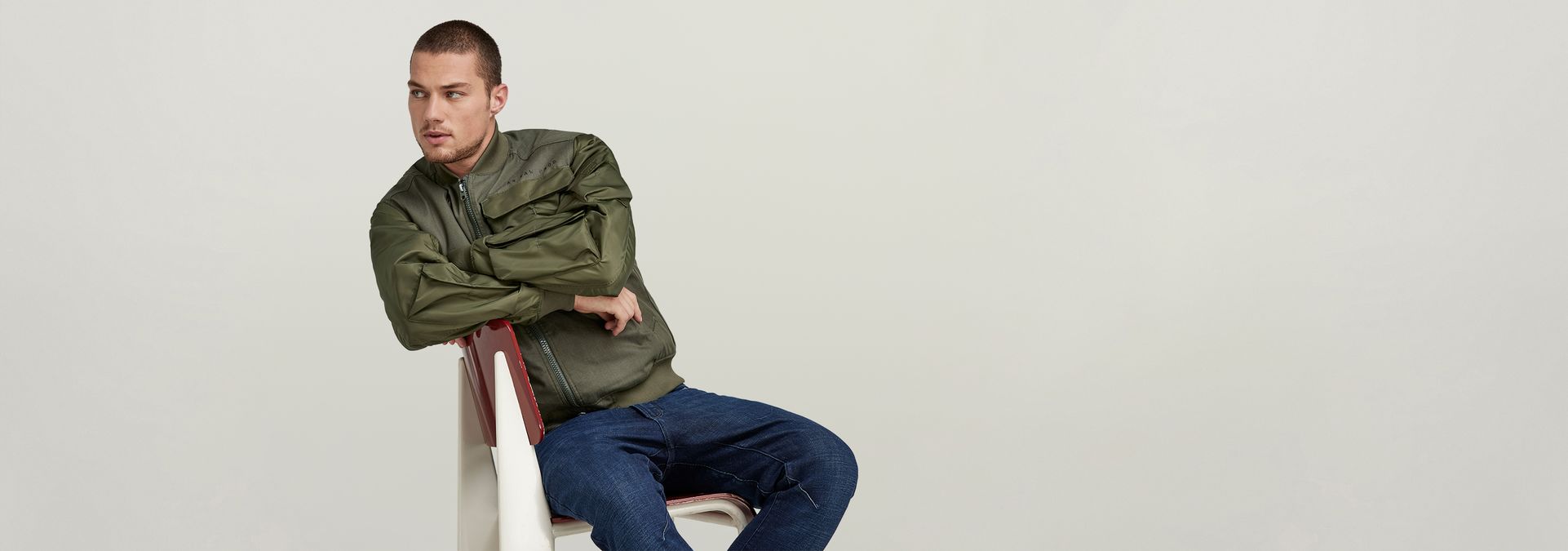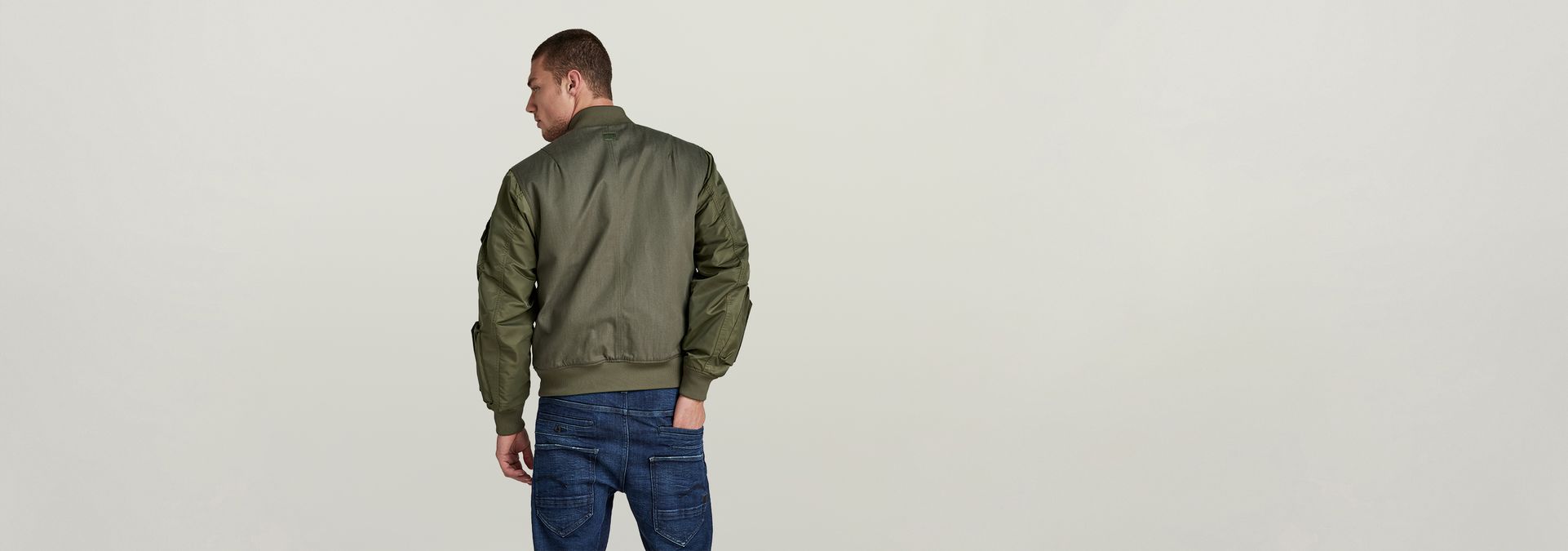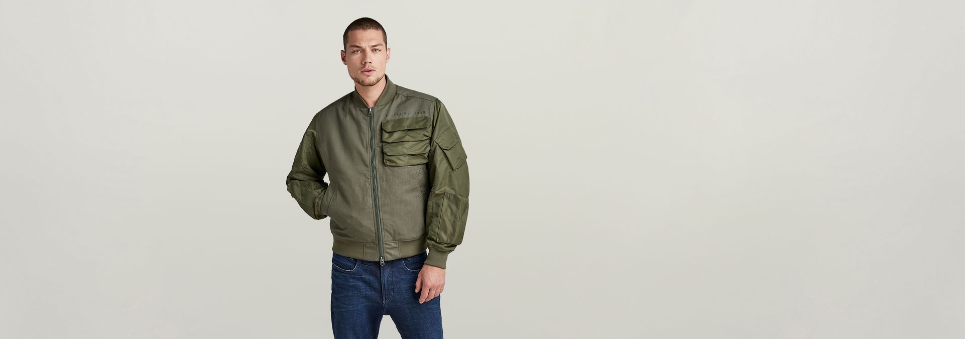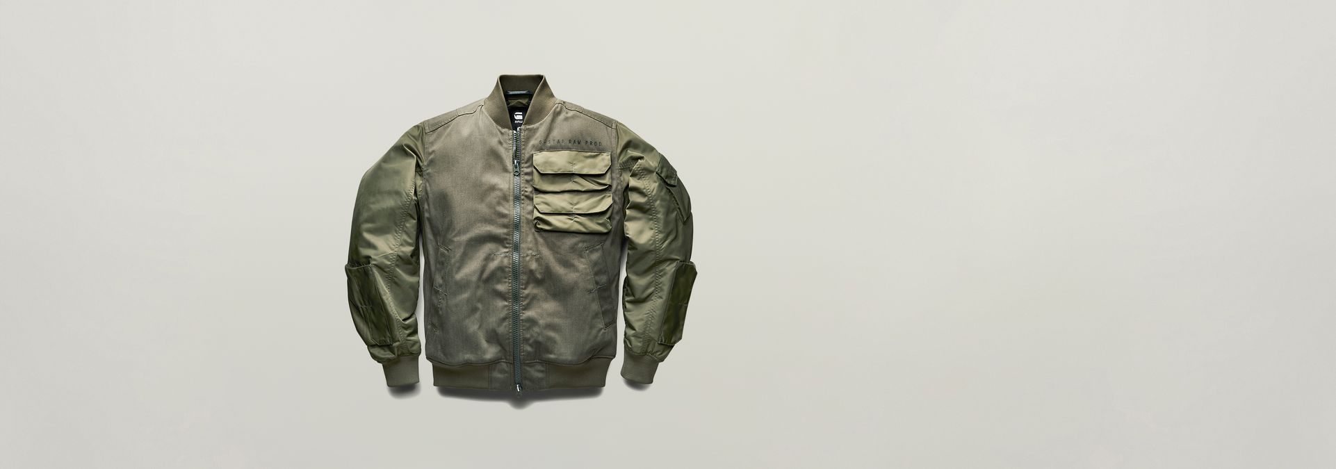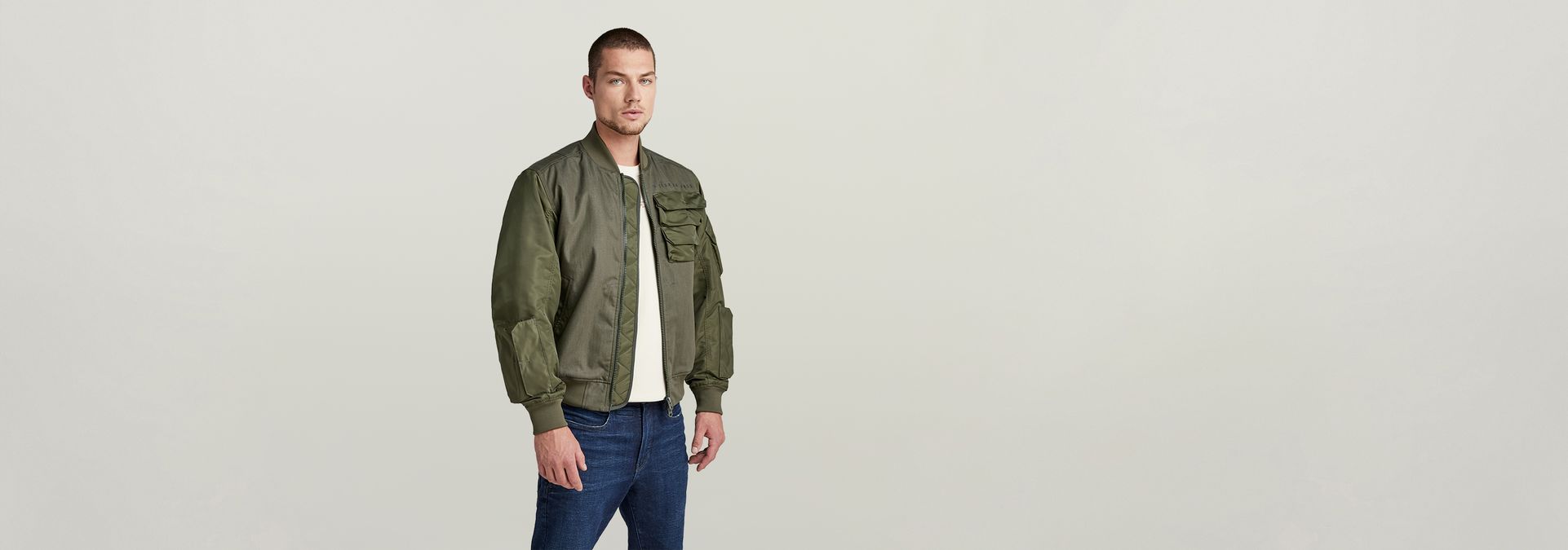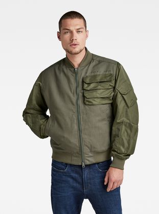 Bomber Chest Pocket PM shows patched on pockets with multiple compartments at the chest, bicep and lower sleeves. Welt pockets are added to the waist and offer a hidden snap, concealed under a 'strike through' embroidery stitch. This bomber jacket features a 2-way zipper with a wind guard underneath. Ribbed finished edges add to a comfortable wear, while an additional inner pocket and hanger loop are added for ease.
