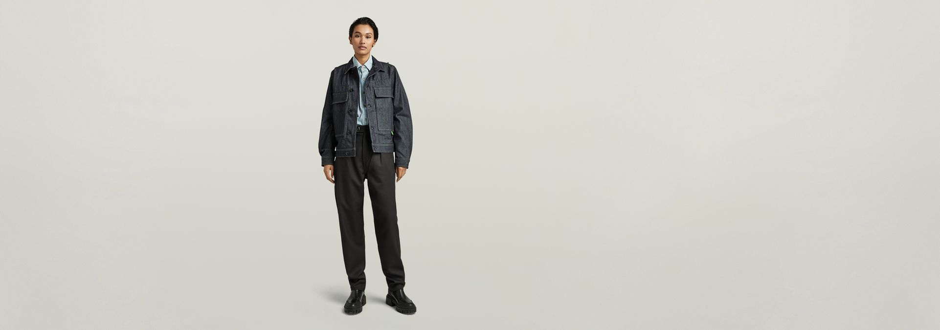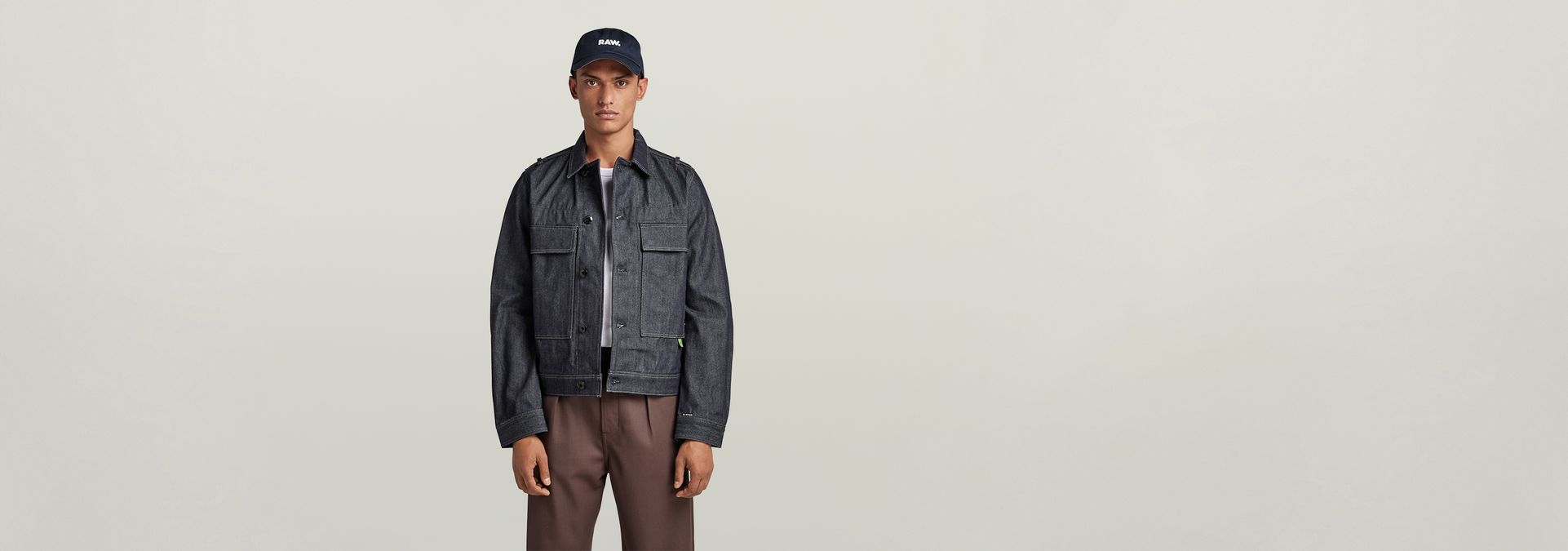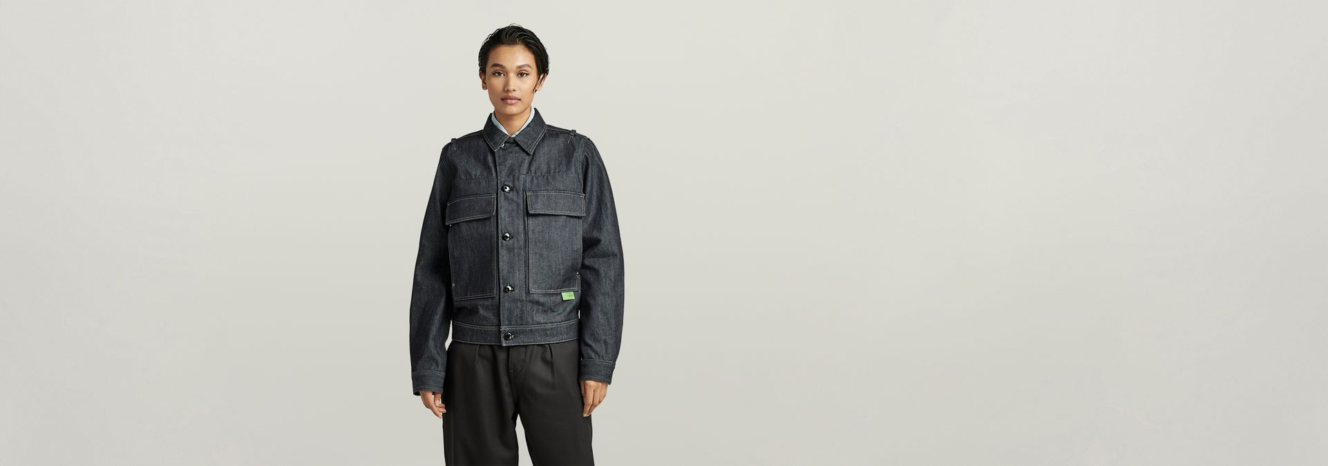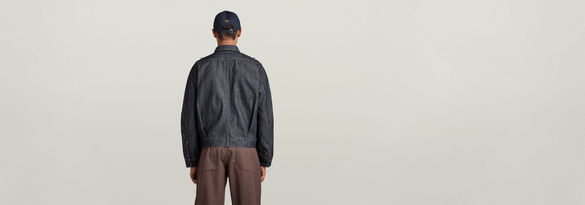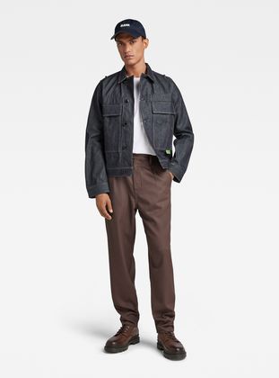 The design of this Utility jacket features flap pockets with additional side entry pockets. Hidden snap closures ensure a firm closure. Volume is created at the back by the folded pleats that are caught in the waistband. Shoulder loops with a strike through stitch create even more detail to this unisex denim jacket.