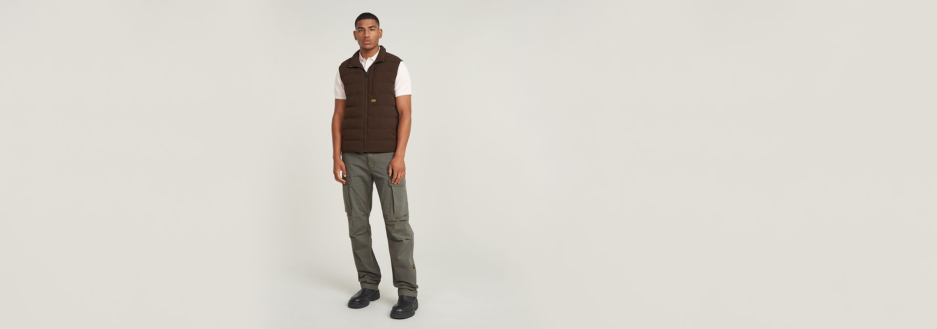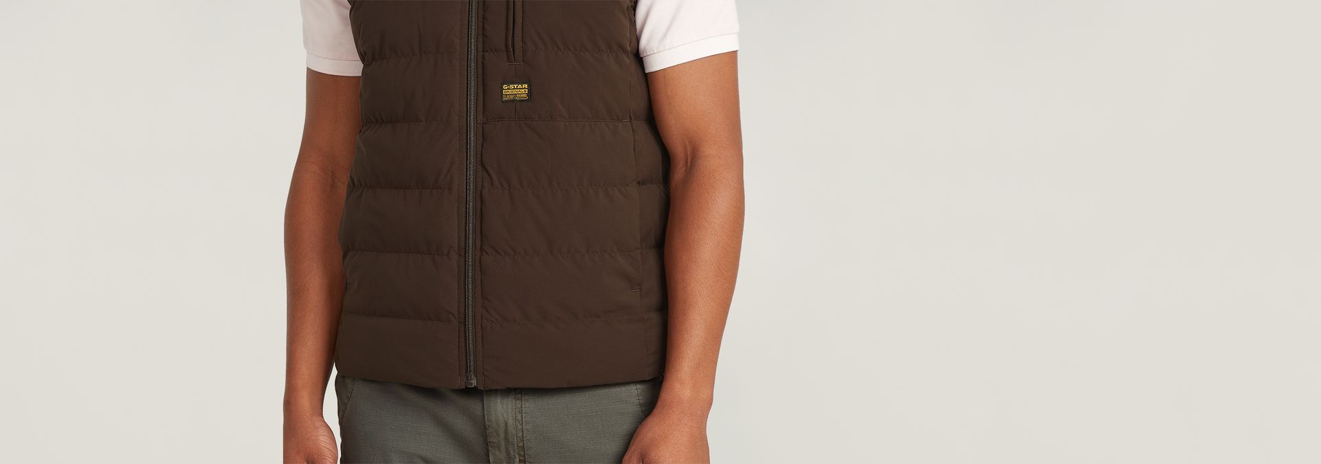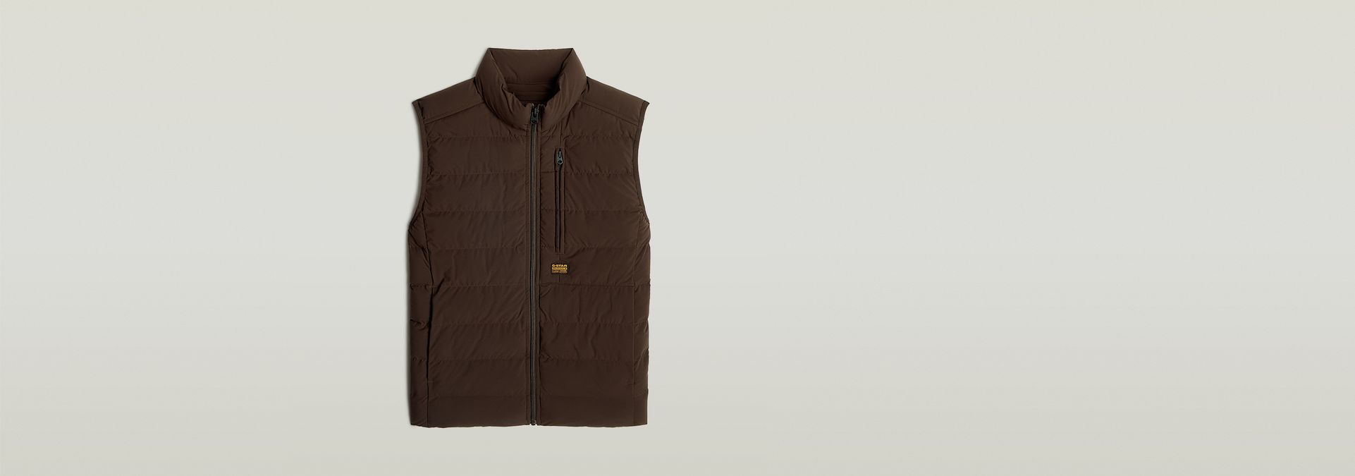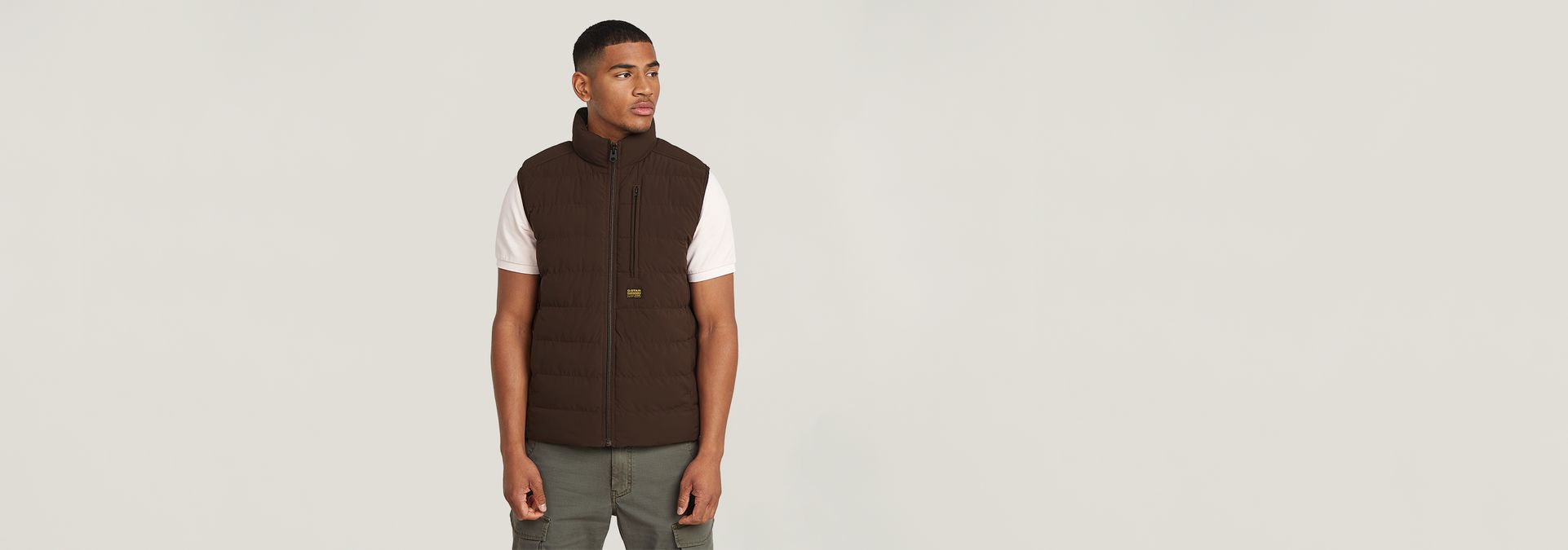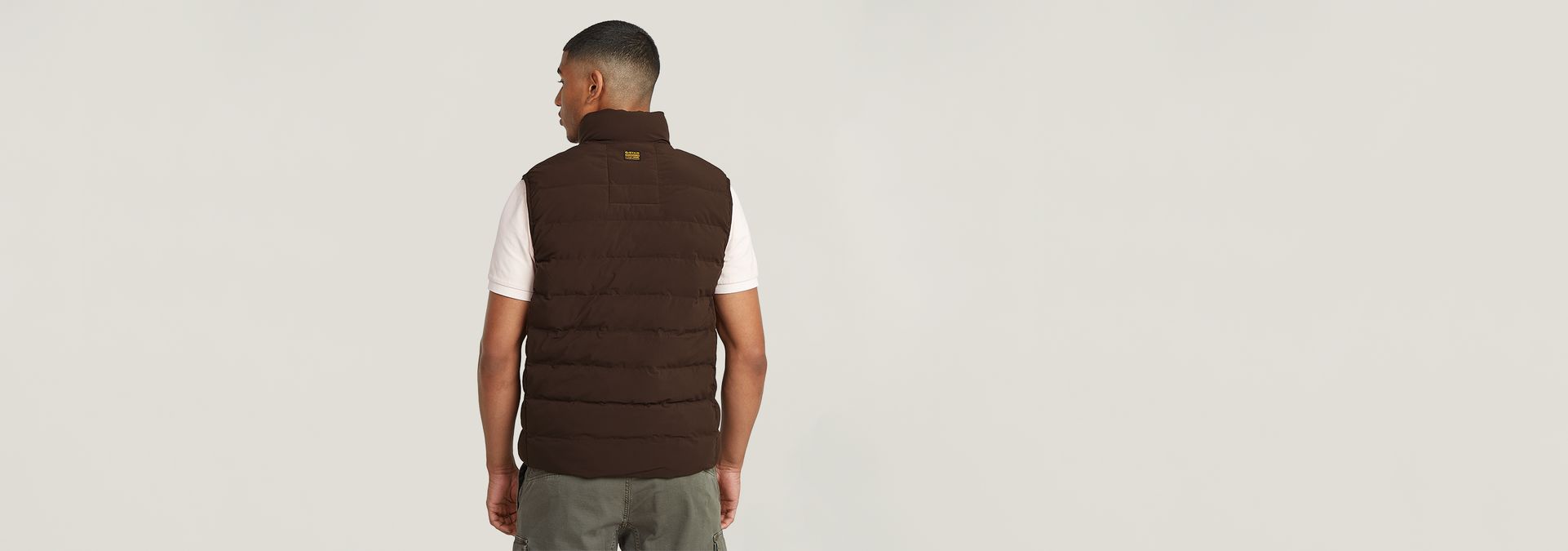 Liner vest Foundation is padded and stitched through horizontally. Pockets are created at the chest and sides. For ease, an additional pocket and hanger loop are added inside.