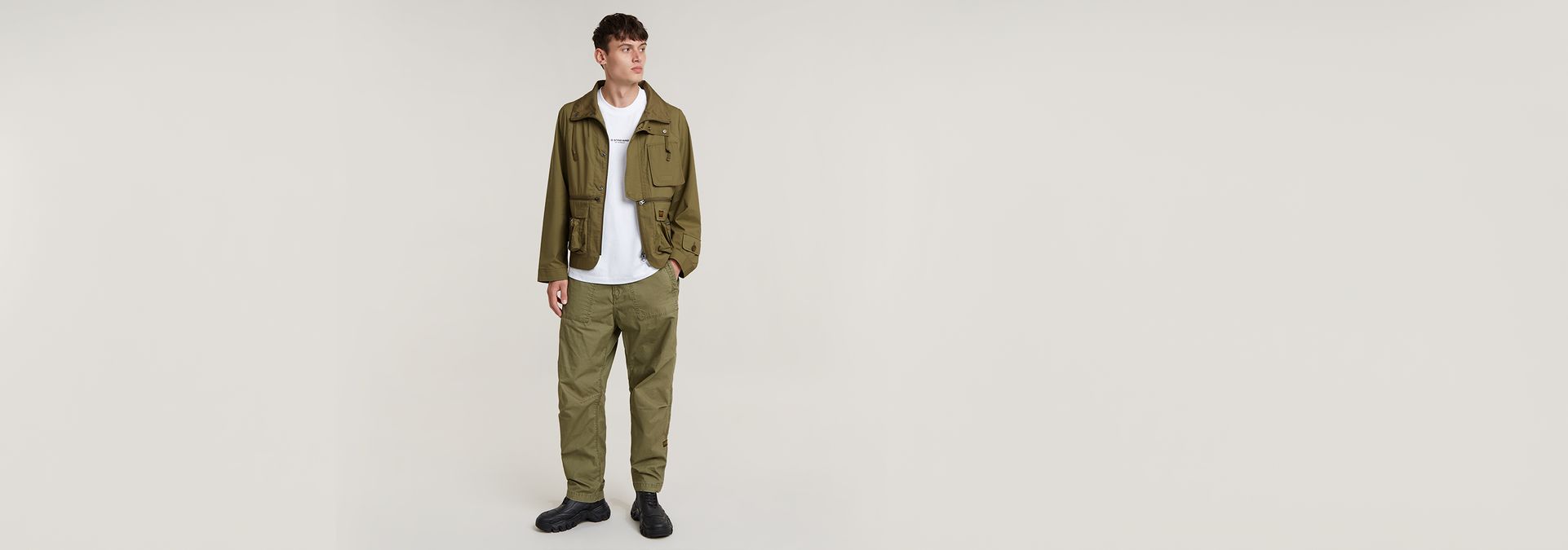 Jacket Modular P-35T offers a raised collar with a pull cord. Lots of detail is created through multiple pockets at the front. Also at the lower back, pockets are set.