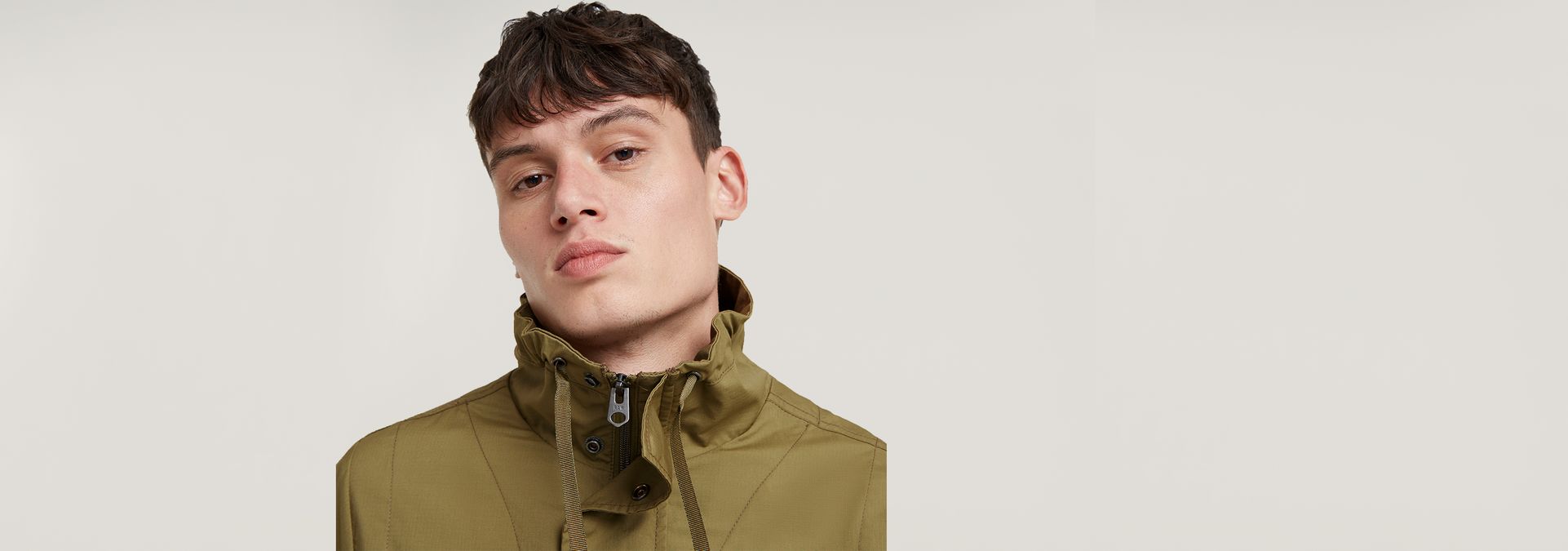 - Raised collar- pull cord, short placket- snap button closure