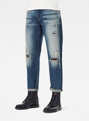 A medium indigo shade, broken in with deep fades and ripped details across the knee.