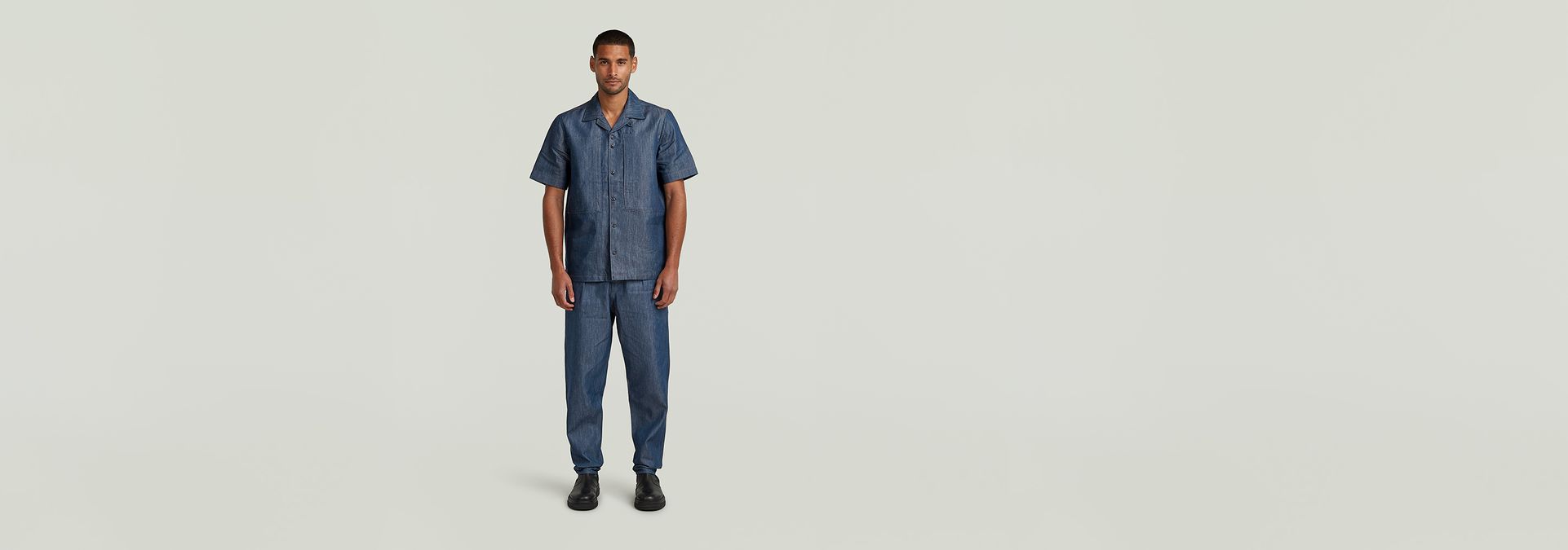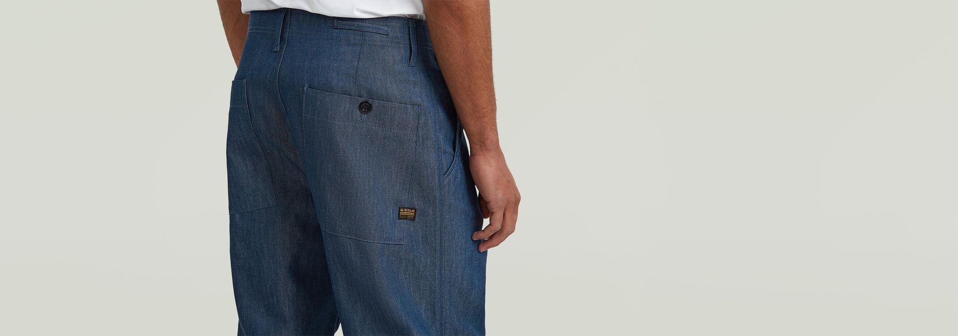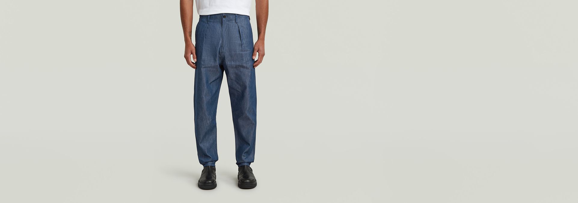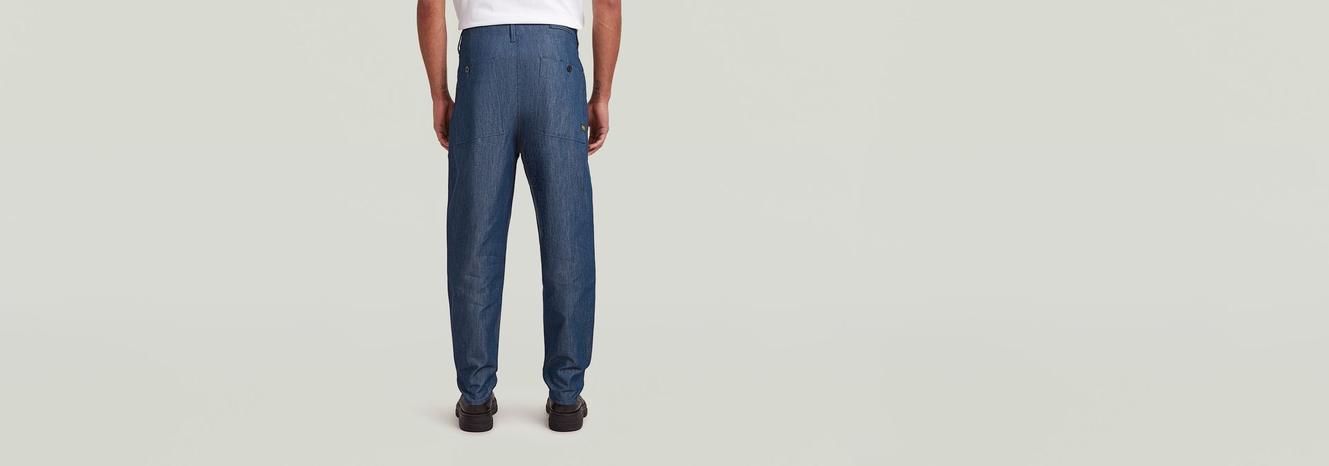 The Pleated Chino Relaxed Tapered jeans feature a unique pleated design with a tapered fit.