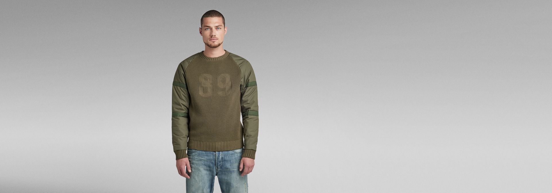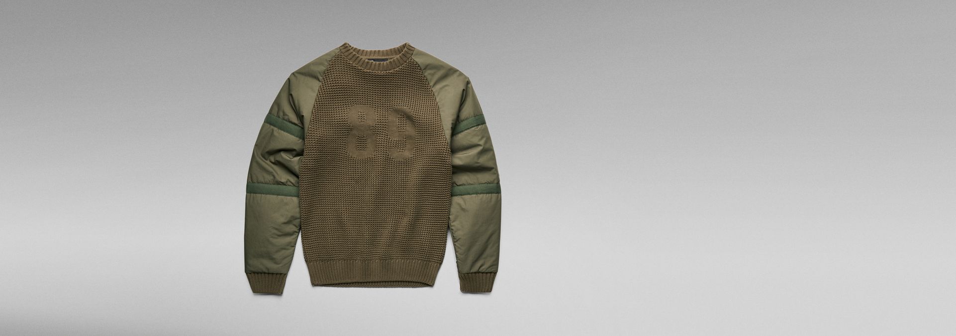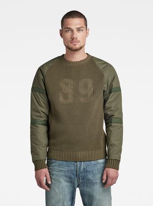 This sweater is designed in a fabric mix, creating an interest in structure and look. The padded sleeves are reinforced with woven tapes, adding detail to this sweater. The front offers a 89 graphic and the lower back has a printed label. Ribbed edges create a comfortable wear.
