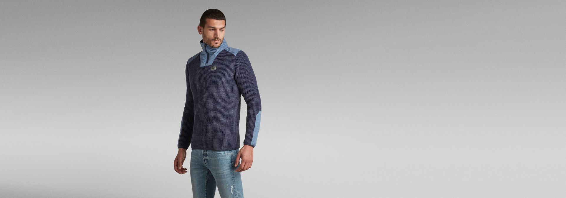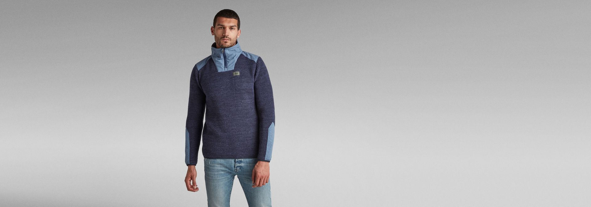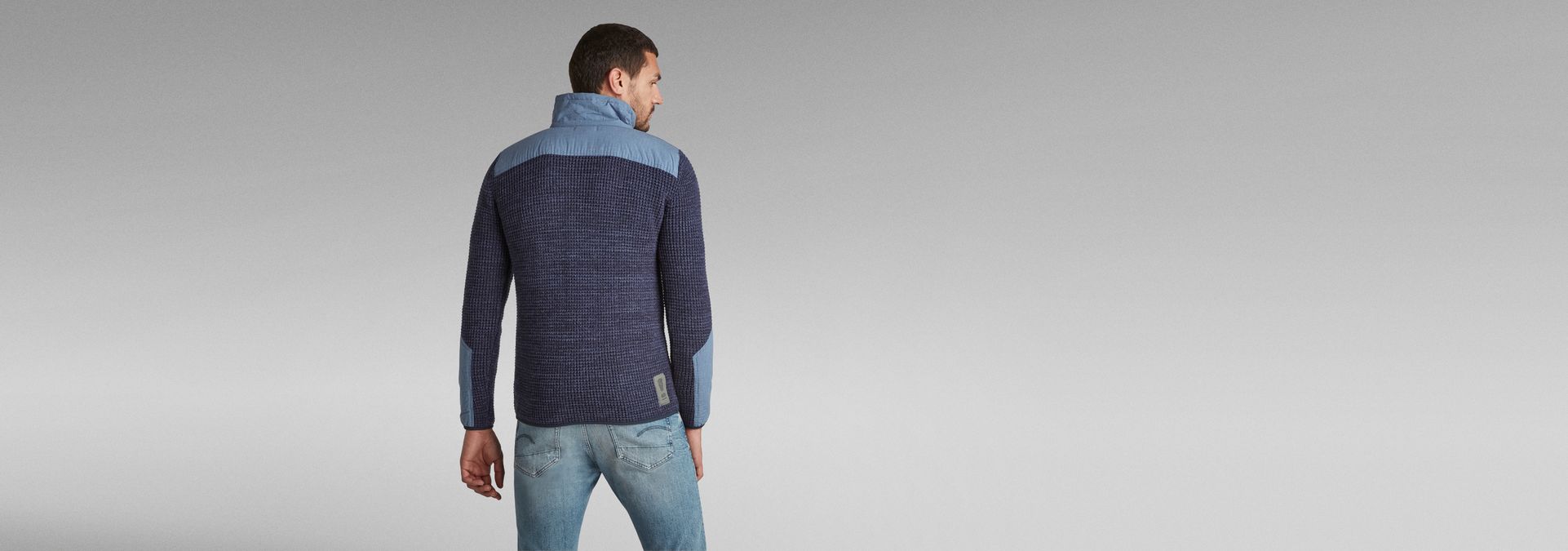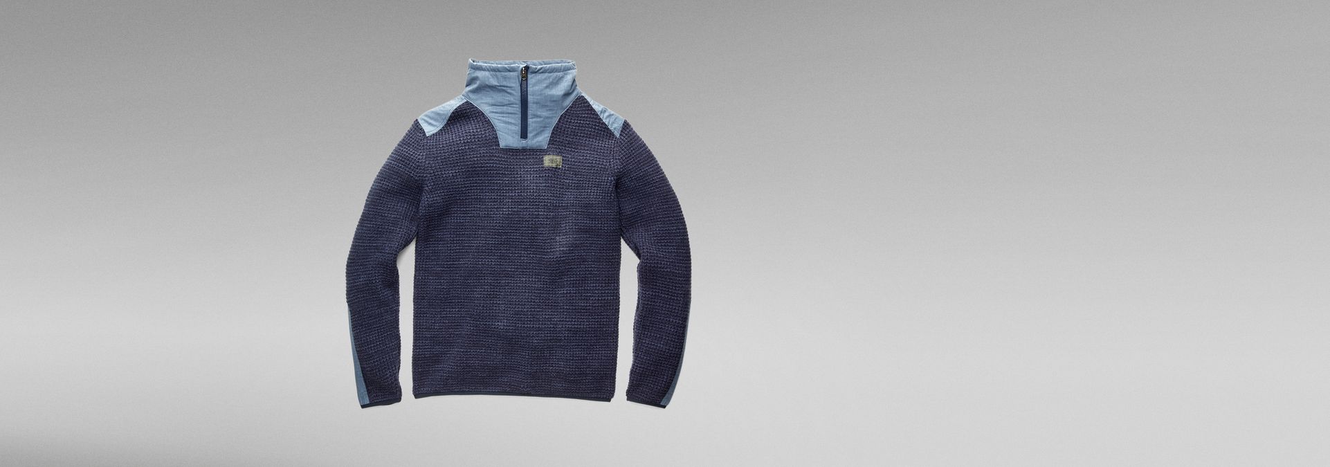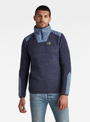 Knitted sweater Utility has a raised collar with a short zipper. The structure knitted base is reinforced with woven detailing on the collar, shoulders and underarm panels. Ribbed edges ensure a comfortable wear.