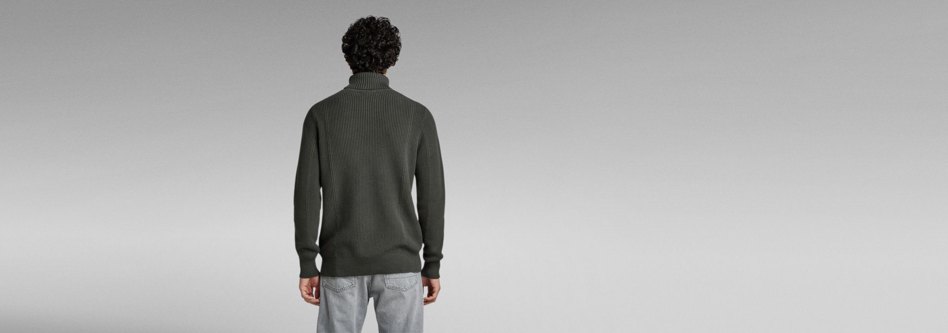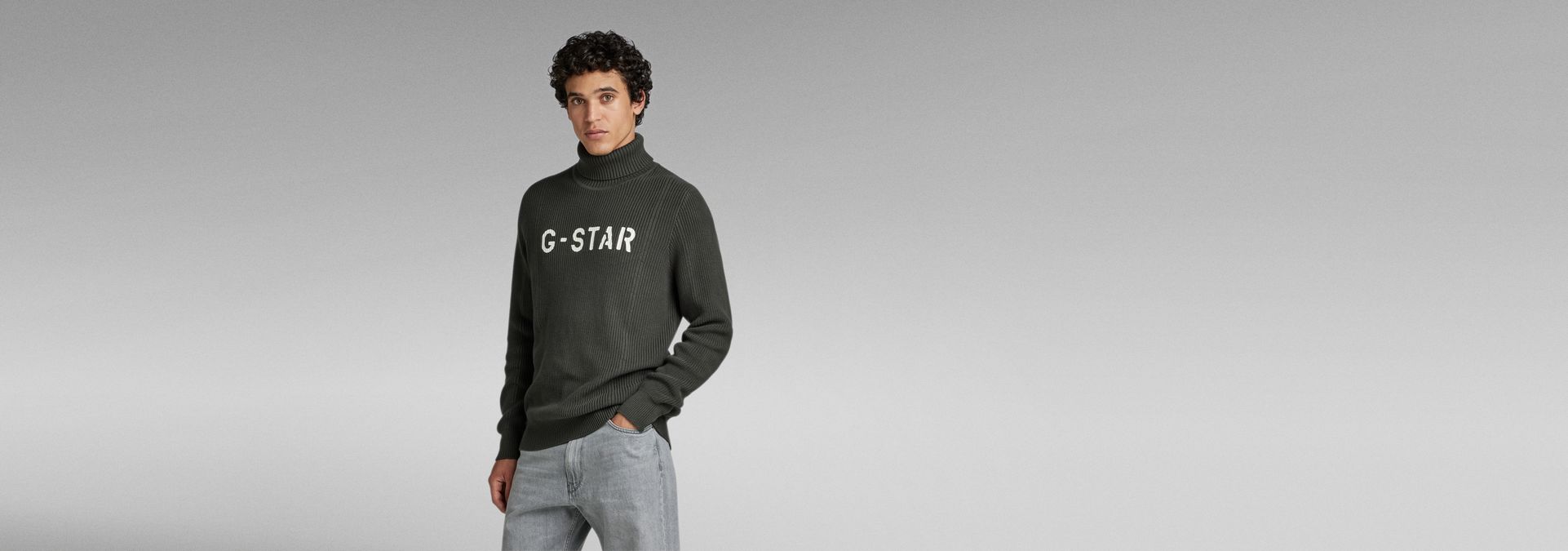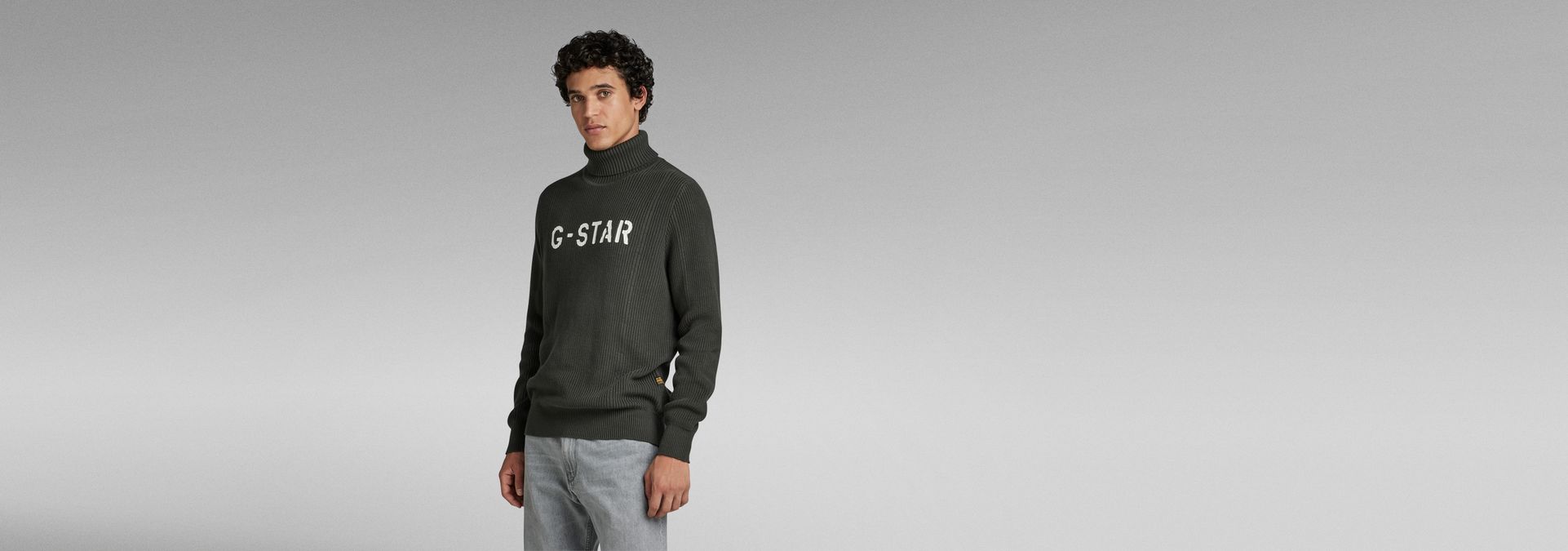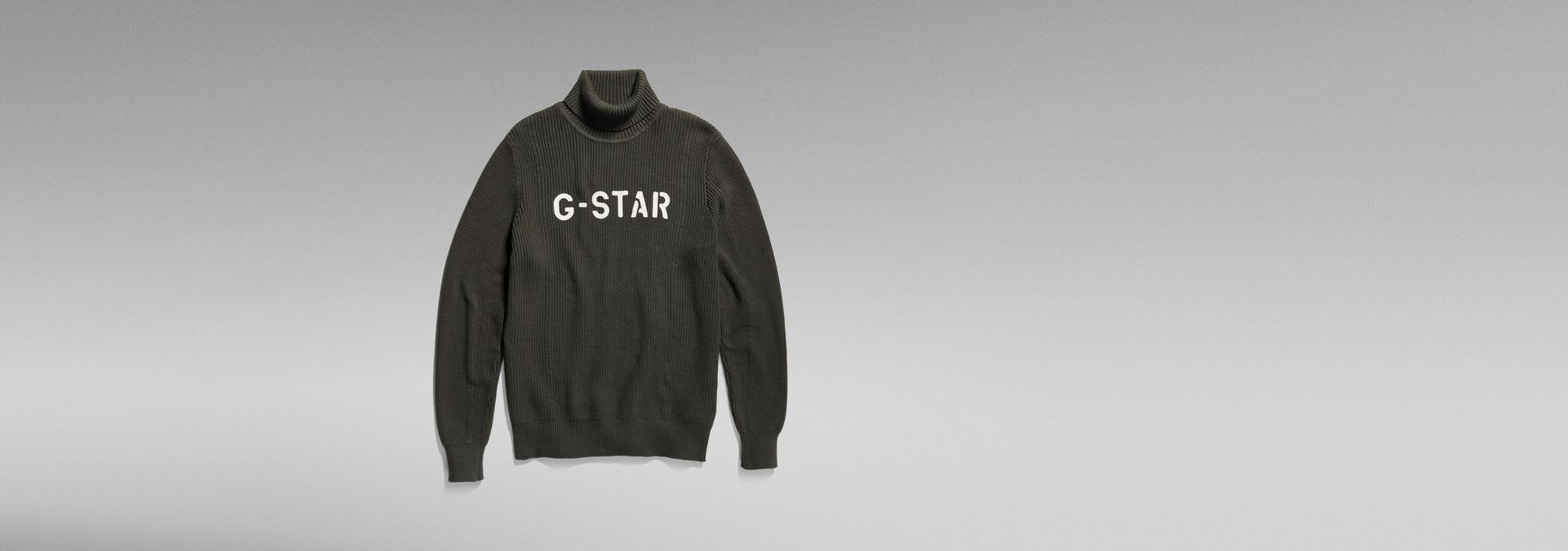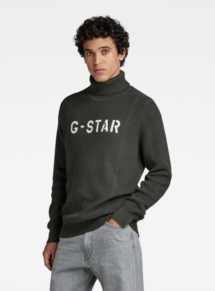 Turtleneck sweater Stencil Graphic is designed in a straight fit and shows a heavy ribbed structure. The vertical lines knitted in at the front and sleeves create detail to this G-Star sweater. The graphic stencil print at the chest completes it.