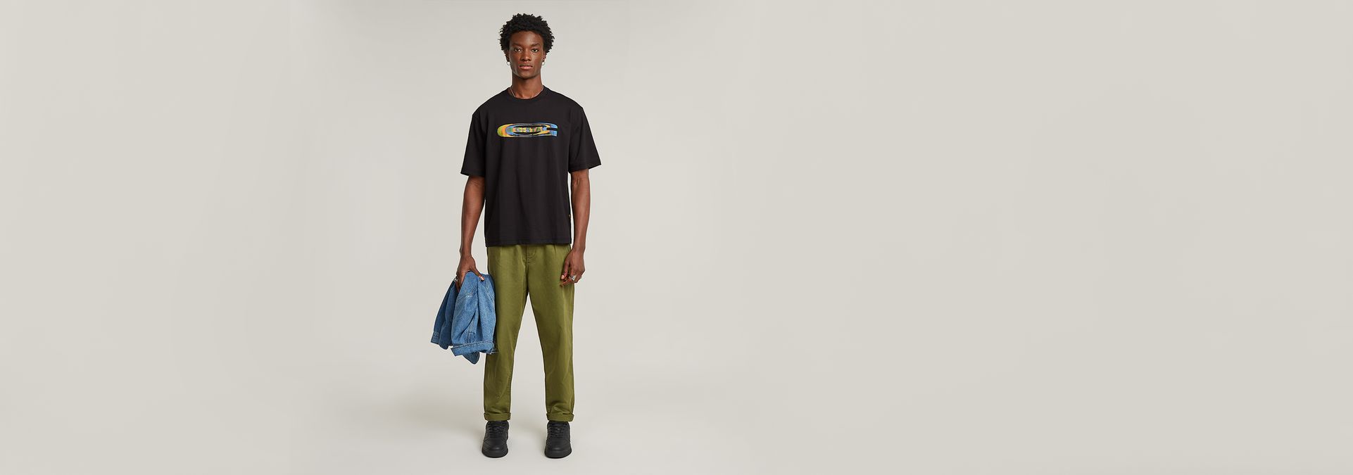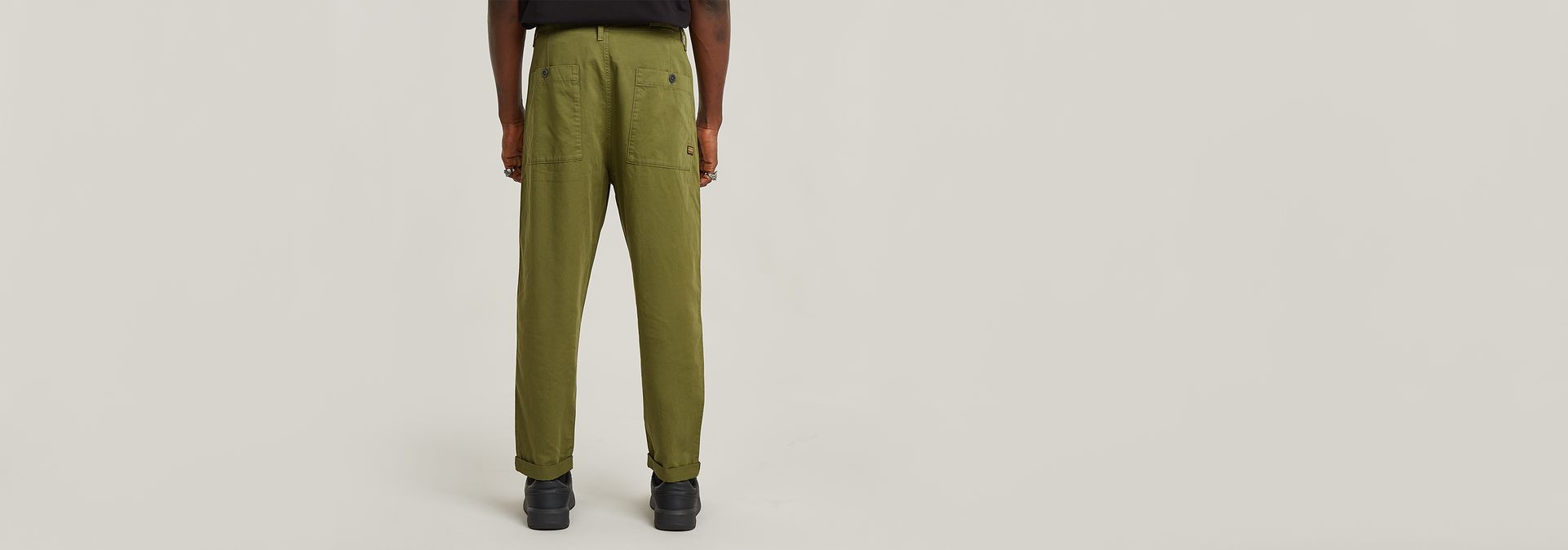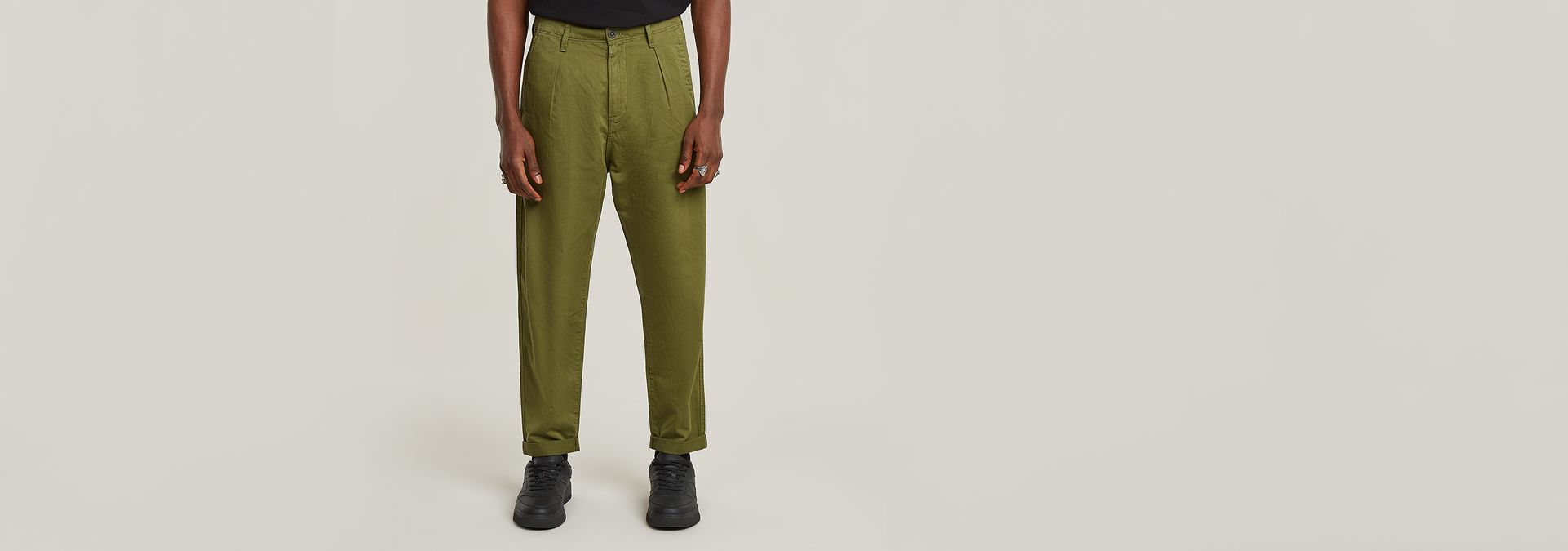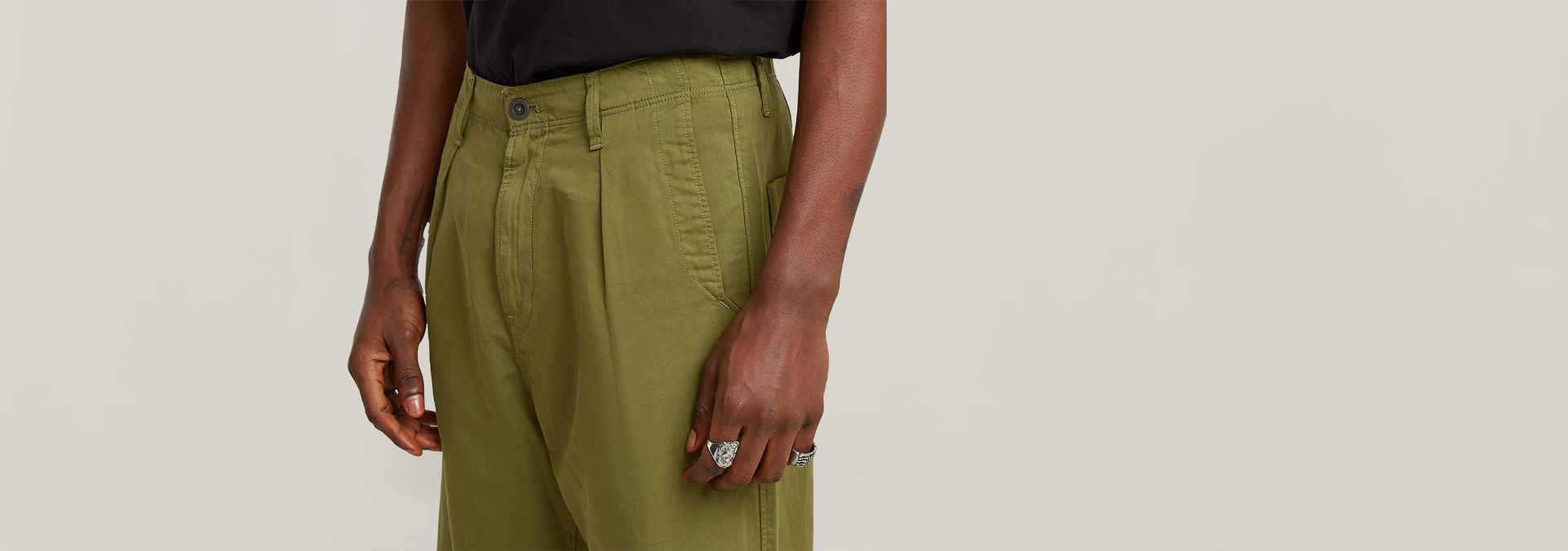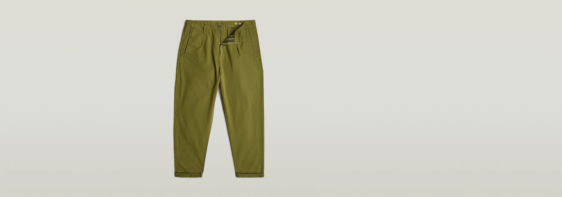 The Pleated Chino Relaxed Tapered jeans feature a unique pleated design with a tapered fit.