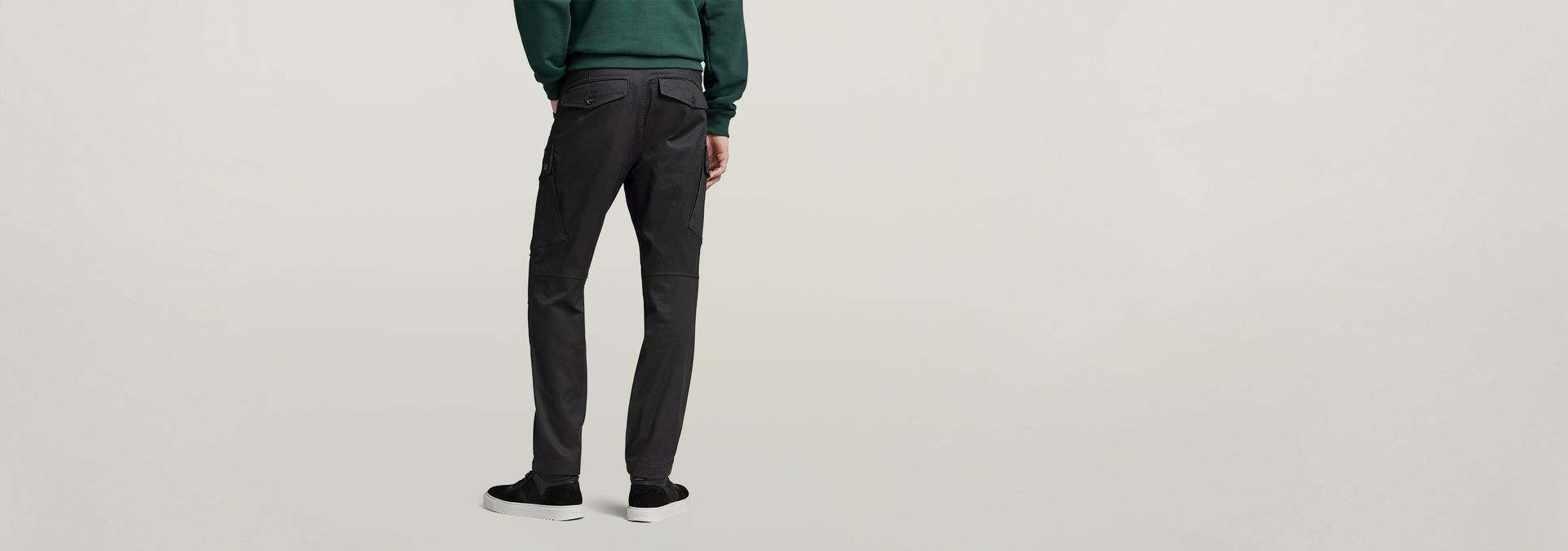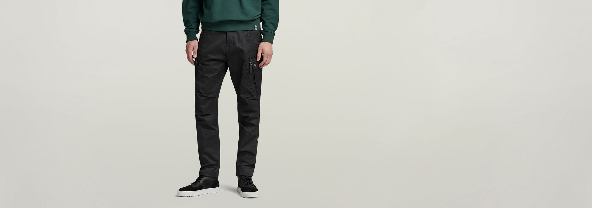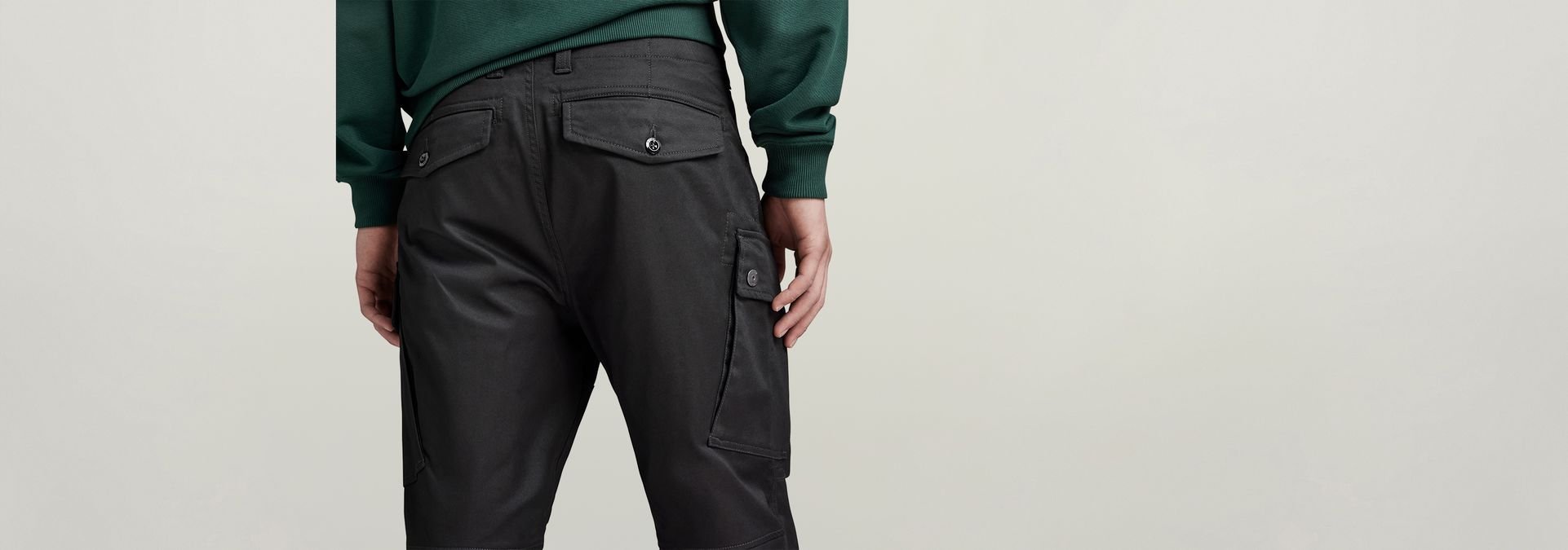 These cargo pants offer flap pockets at the thigh with a zipper along one side. A coin pocket is added to the inset pockets and at the back flap pockets are created. Pull the tape on the inside leg for a tighter fit around the ankle.