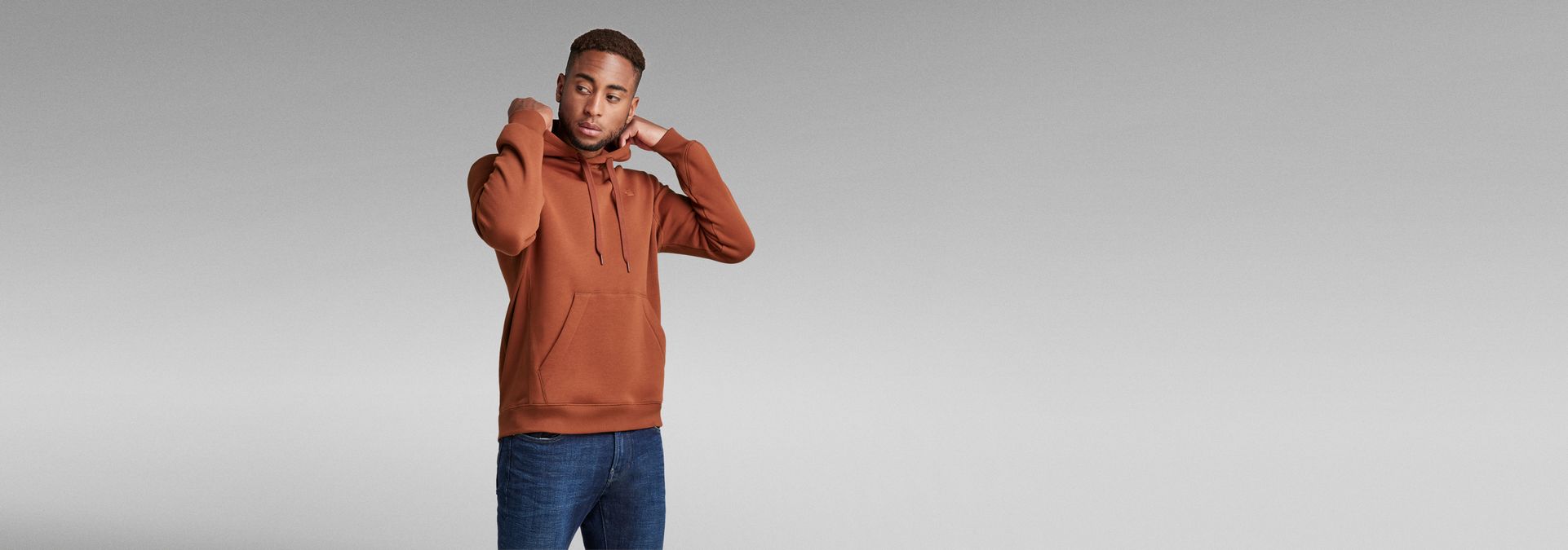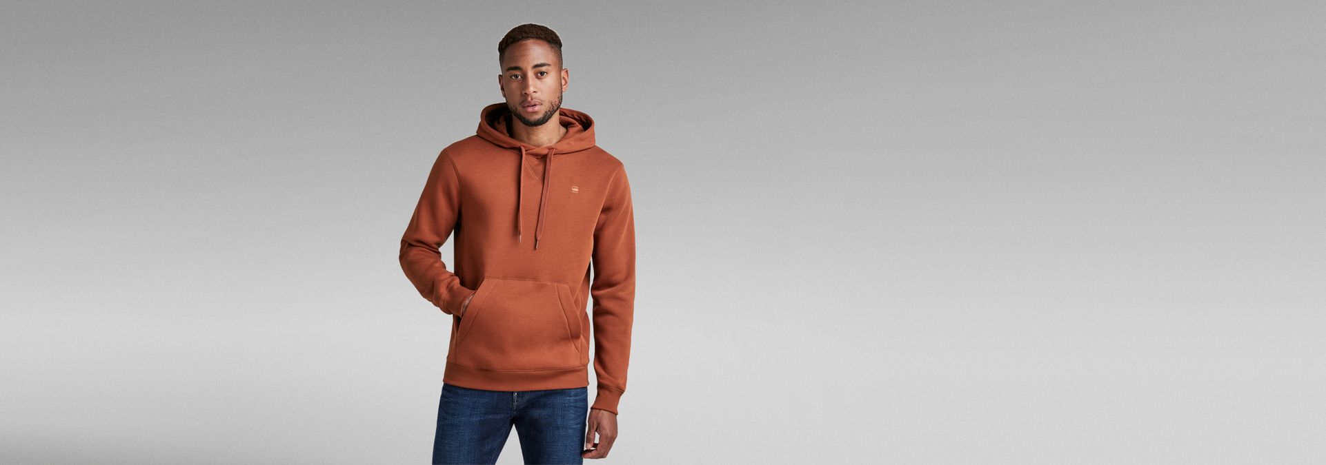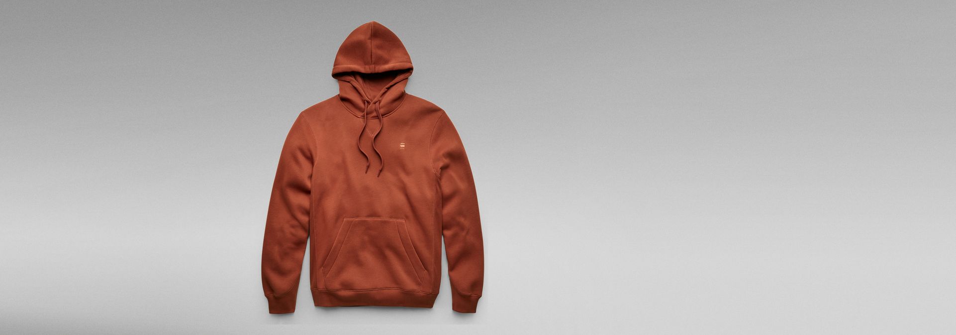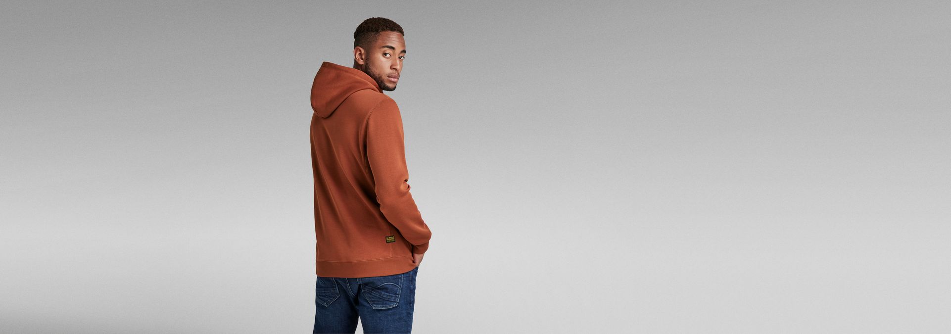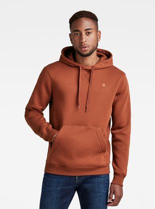 The Premium Core hooded sweater features a kangaroo pocket and a hood with a drawstring. The front shows a cross over construction and a ribbed inset piece. Long sleeves have a curved finish, showing a ribbed cuff underneath. The chest signs this hoody with a subtle G-Star RAW logo.
