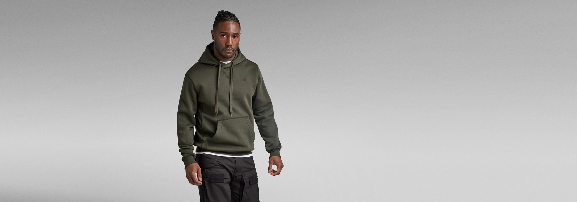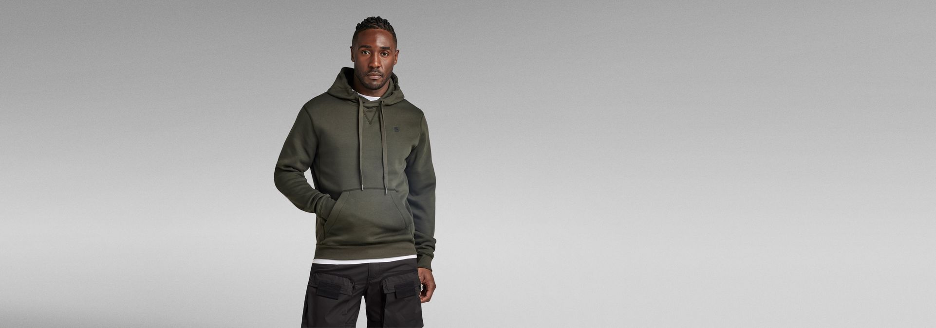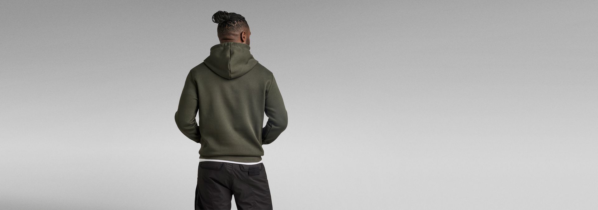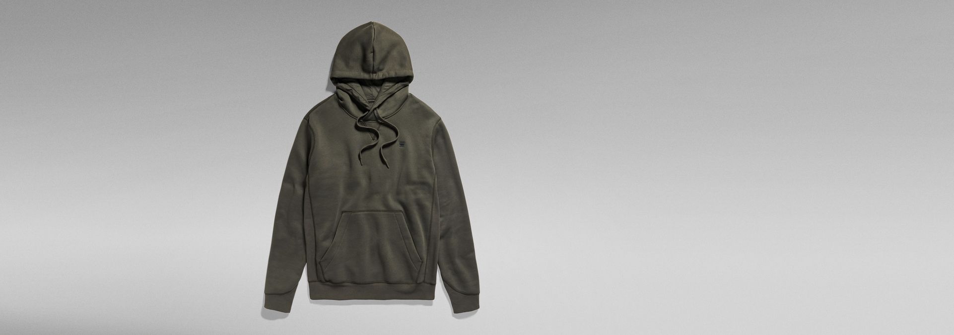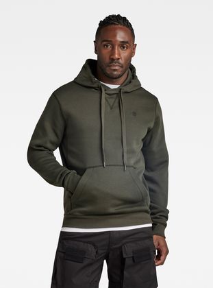 The Premium Core hooded sweater features a kangaroo pocket and a hood with a drawstring. The front shows a cross over construction and a ribbed inset piece. Long sleeves have a curved finish, showing a ribbed cuff underneath. The subtle G-Star RAW logo at the chest signs it off.