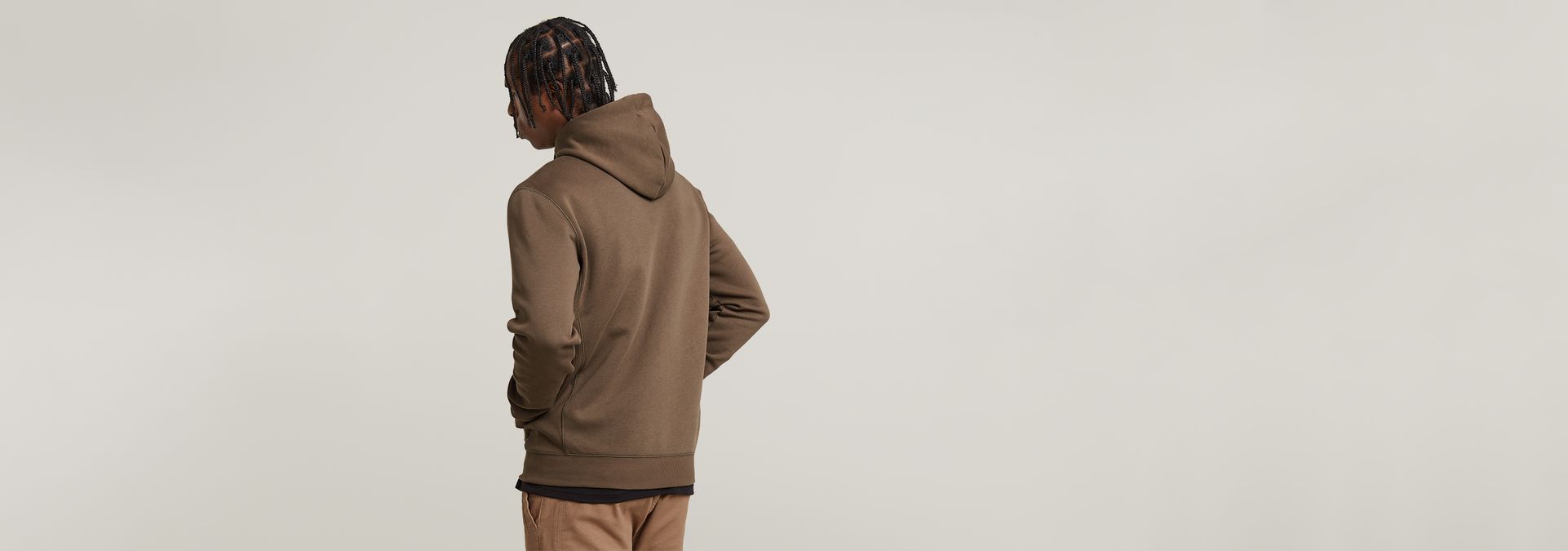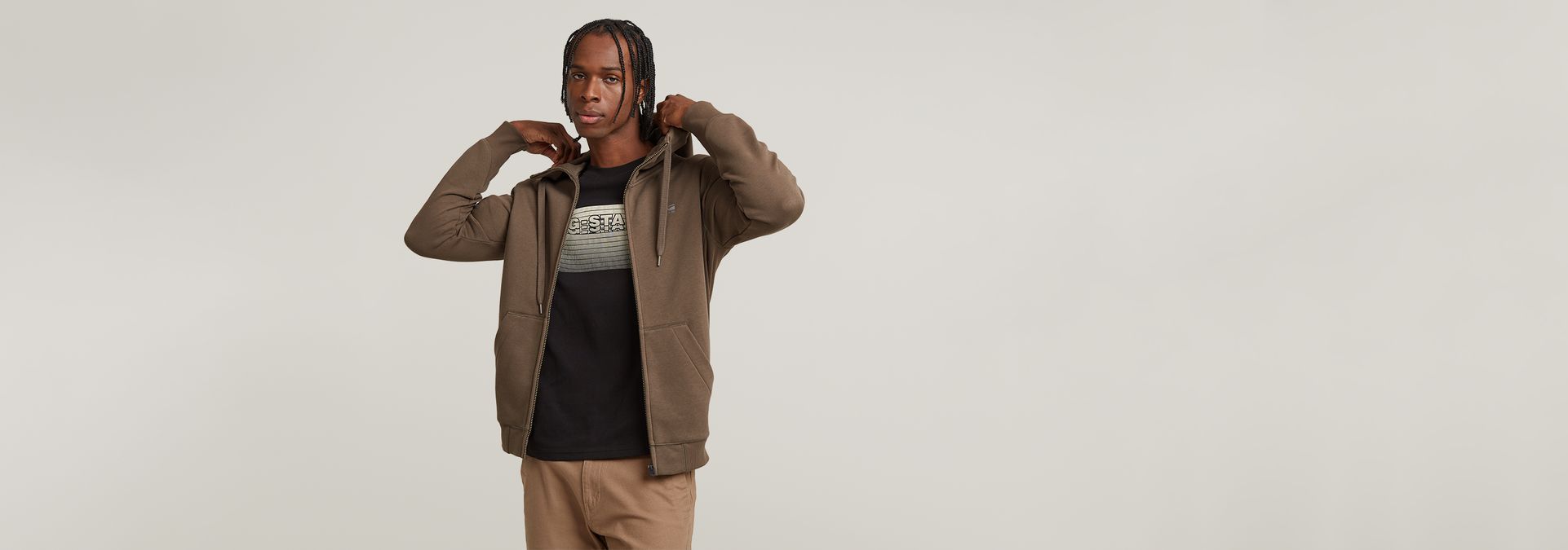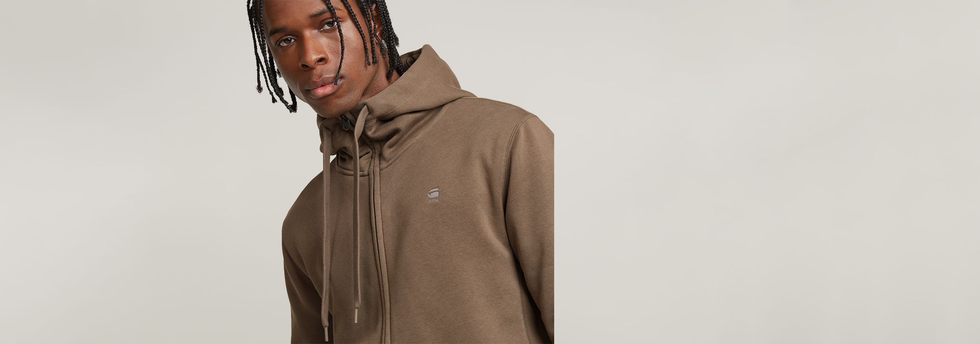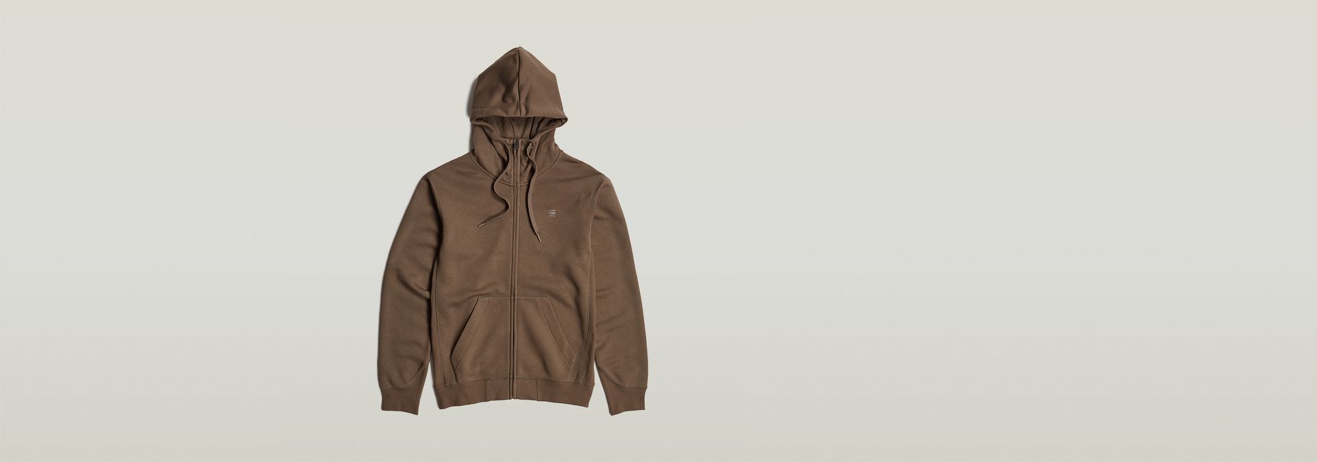 The Premium Core zip through jogger jacket features a hood with a raised front and drawstrings. Long sleeves have a curved finish, showing a ribbed cuff underneath.