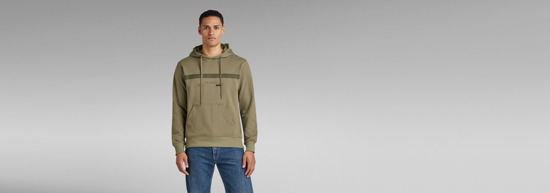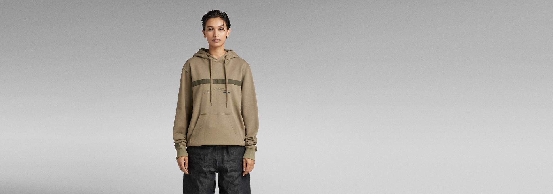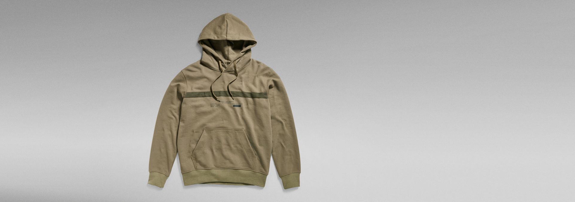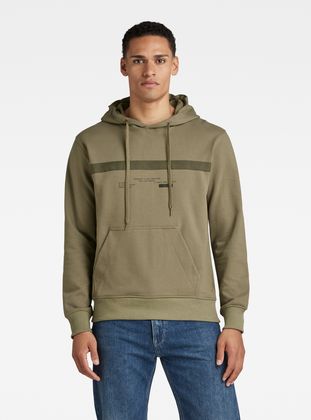 Hooded sweater Tape features a kangaroo pocket and a hood with a cross over construction with a drawstring. Long sleeves are finished with a ribbed cuff and offer woven tapes along the back. Also across the chest this same tape is applied to this hoody.
