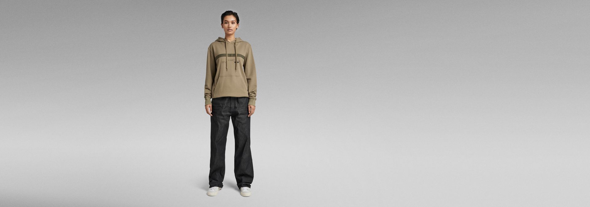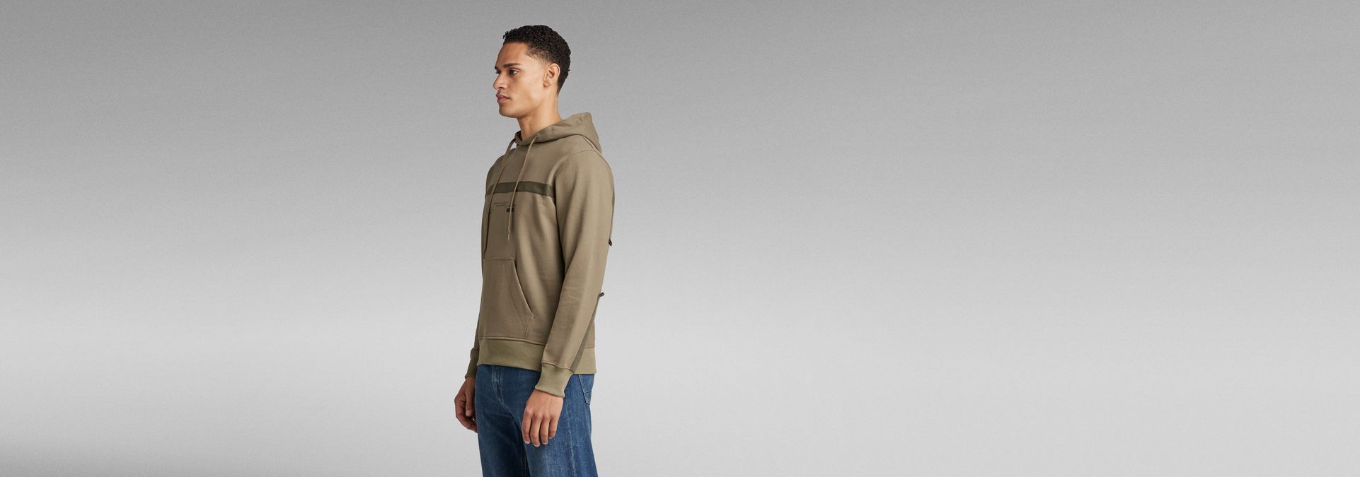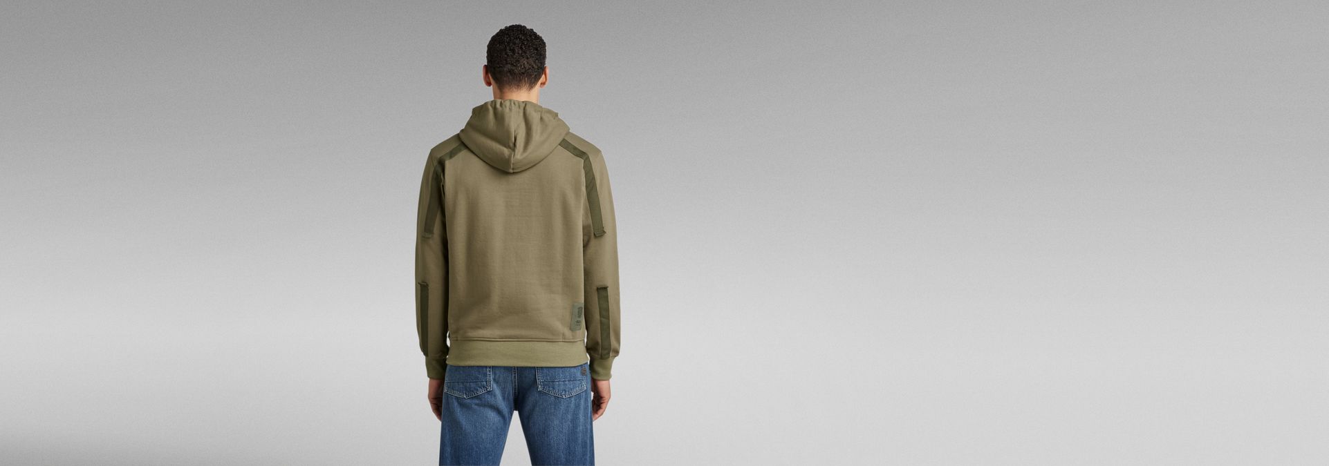 Hooded sweater Tape features a kangaroo pocket and a hood with a cross over construction with a drawstring. Long sleeves are finished with a ribbed cuff and offer woven tapes along the back. Also across the chest this same tape is applied to this hoody.