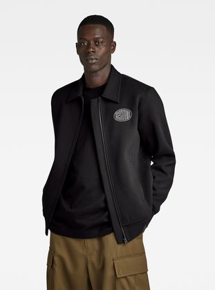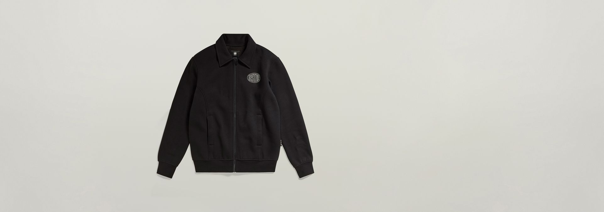 Sweater jacket Polo Collar features a flat collar and a zipper closure. Pockets are added to the side seams. The sleeves and waist are finished with a ribbed edge. The graphic print at the chest completes it.