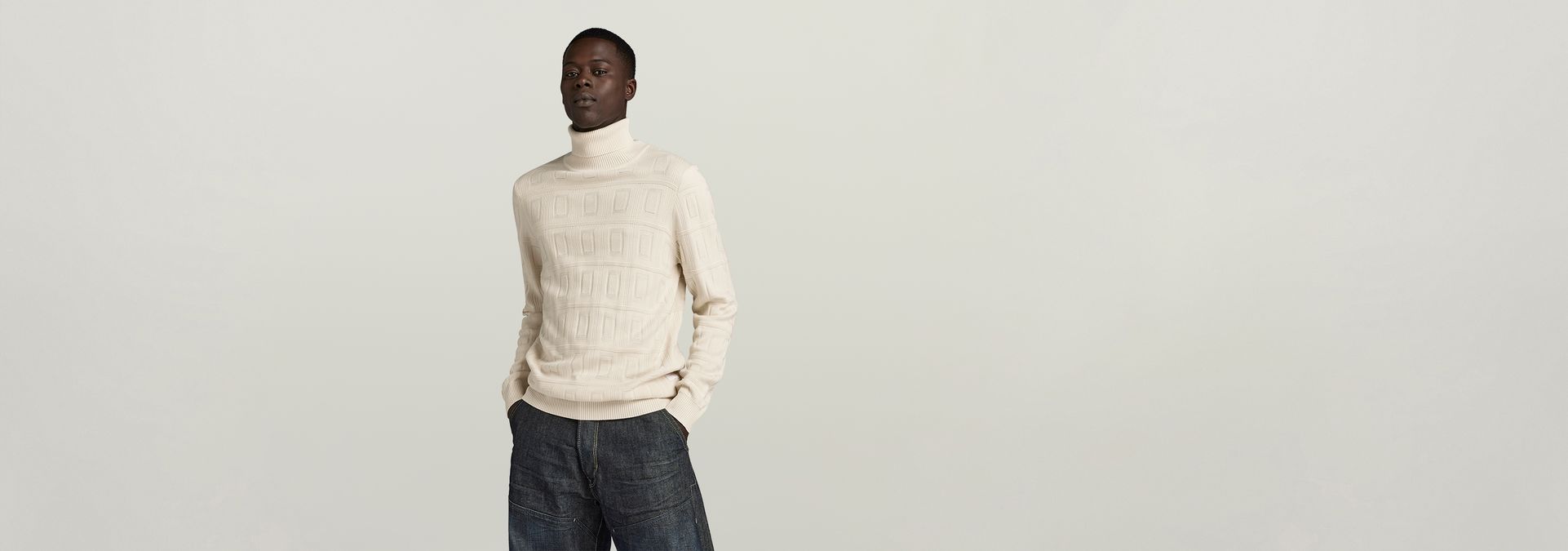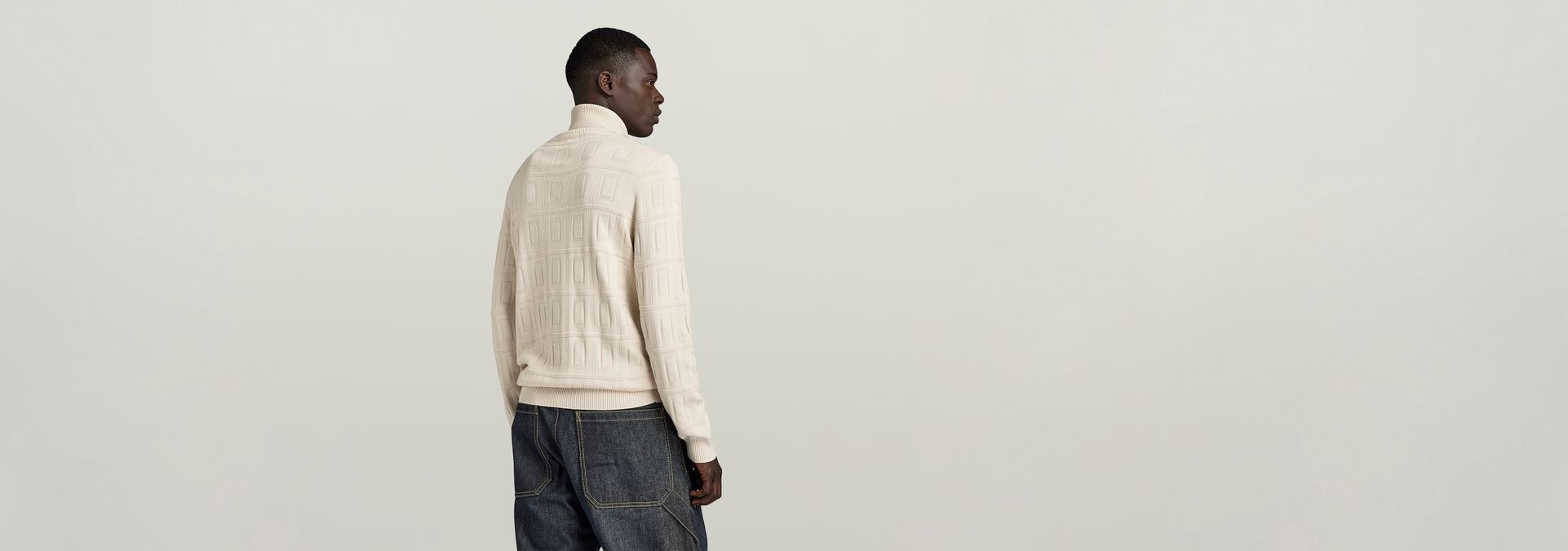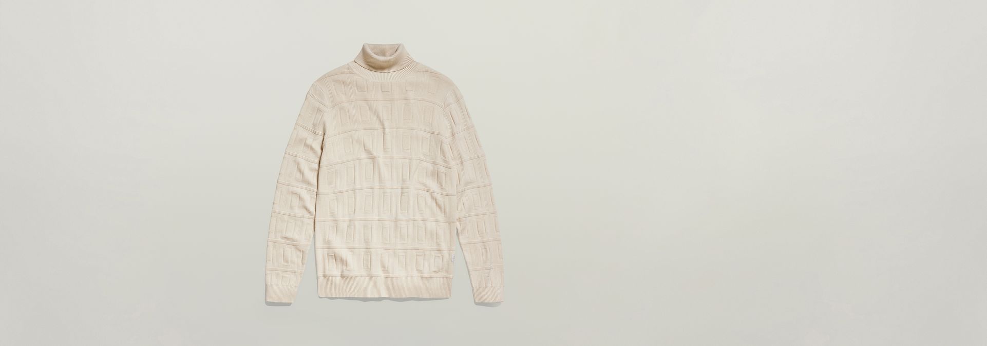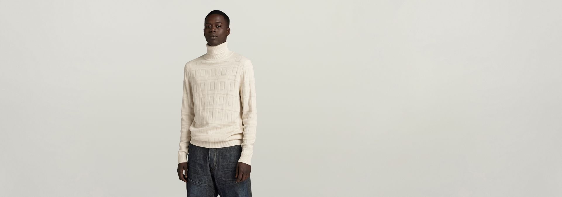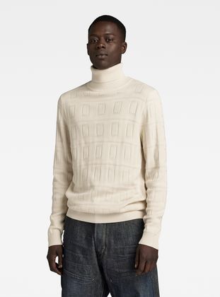Turtleneck sweater Table Structure is knitted in a straight fit and offers a solid piece with lots of texture. The high and lows created by the knitted lines make this pattern. The high collar adds to a comfortable fit.